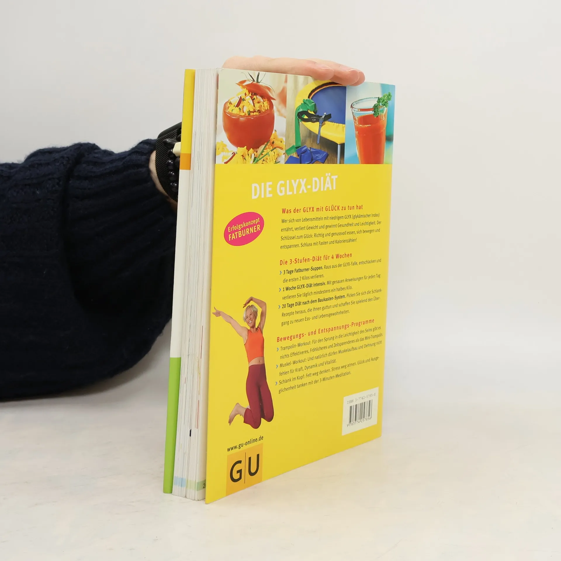 Weiterer Titel zur GLYX-Diät nach den vergleichbaren Titeln von M. Hamm: "Fit und schlank mit dem GLYX" (BA 9/01) und M. Sulzberger: "Schlank mit den richtigen Kohlehydraten" (BA 8/01). Auch hier werden zunächst Stoffwechselvorgänge erklärt, dann das GLYX-Prinzip erläutert, ein 40-seitiger Rezeptteil enthält leckere Rezepte mit Farbfotos, Zusatzinfos und Tipps. In einem weiteren Kapitel stellt die Autorin ein Trampolinprogramm zum gezielten Training der so genannten Problemzonen vor. Mit Buch- und Internet-Tipps, Adressen, Sach- und Rezeptregister. Als Extra gibt es den GLYX-Guide, ein handliches Heftchen, das alle wichtigen Lebensmittel auflistet - praktisch als Einkaufshilfe. Insgesamt praktisch, informativ und optisch gut gelungen. Neben oder anstelle der oben genannten Titel einsetzbar. (2)