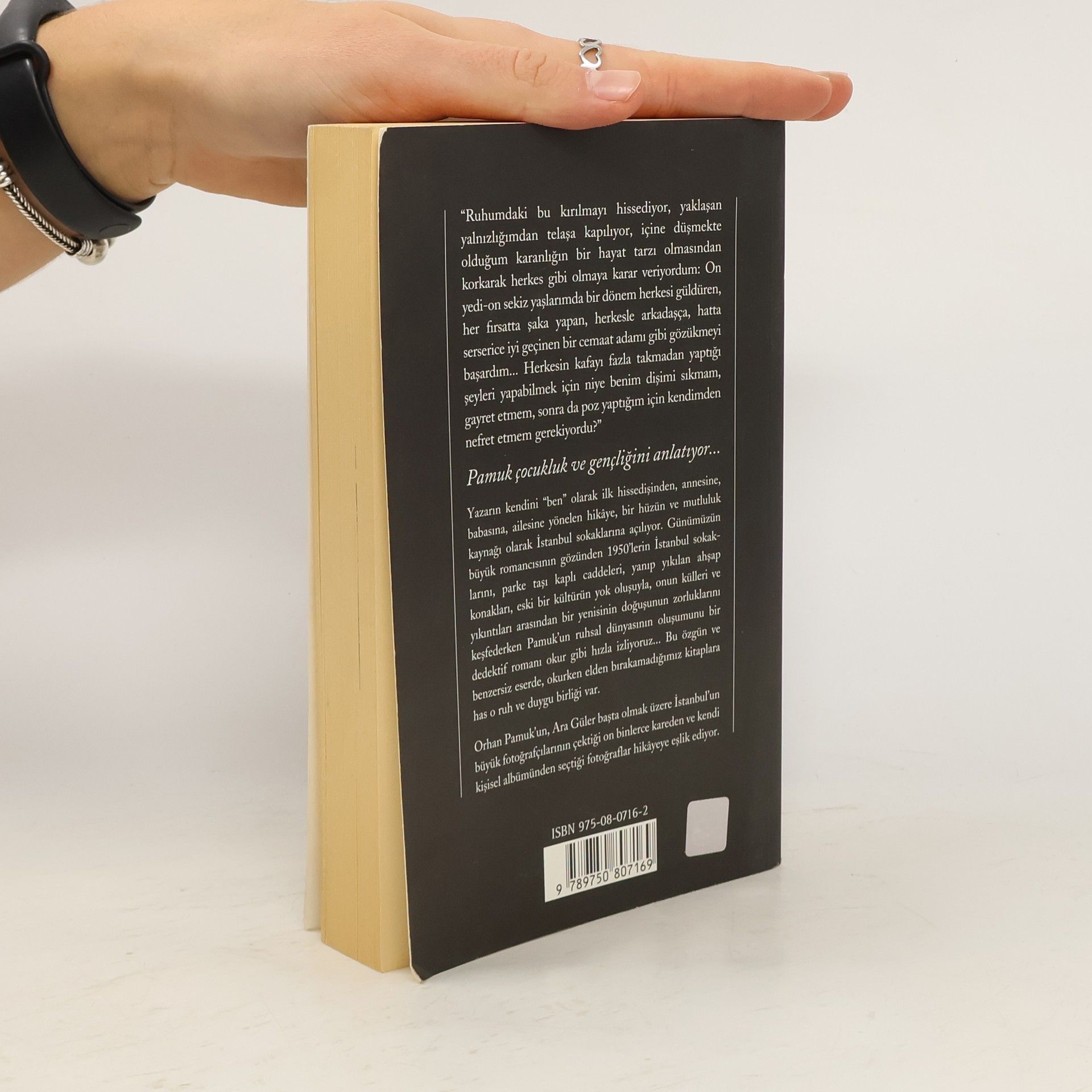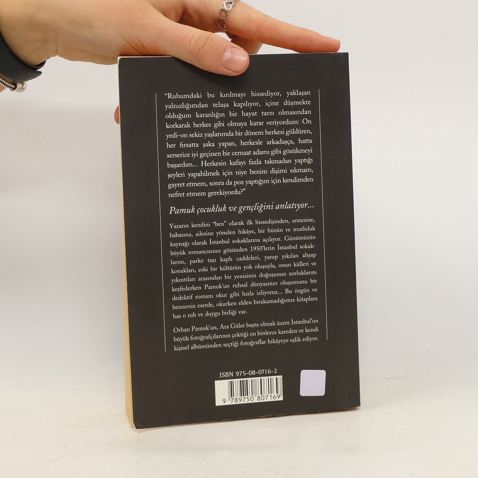 Pamuk çocukluk ve gençliğini anlatıyor... "Ruhumdaki bu kırılmayı hissediyor, yaklaşan yalnızlığımdan telaşa kapılıyor, içine düşmekte olduğum karanlığın bir hayat tarzı olmasından korkarak herkes gibi olmaya karar veriyordum: On yedi-on sekiz yaşlarımda bir dönem herkesi güldüren, her fırsatta şaka yapan, herkesle arkadaşça, hatta serserice iyi geçinen bir cemaat adamı gibi gözükmeyi başardım... Herkesin kafayı fazla takmadan yaptığı şeyleri yapabilmek için niye benim dişimi sıkmam, gayret etmem, sonra da poz yaptığım için kendimden nefret etmem gerekiyordu?" Yazarın kendini "ben" olarak ilk hissedişinden, annesine, babasına, ailesine yönelen hikaye, bir hüzün ve mutluluk kaynağı olarak İstanbul sokaklarına açılıyor. Günümüzün büyük romancısının gözünden 1950'lerin İstanbul sokaklarını, parke taşı kaplı caddeleri, yanıp yıkılan ahşap konakları, eski bir kültürün yok oluşuyla, onun külleri ve yıkıntıları arasından bir yenisinin doğuşunun zorluklarını keşfederken Pamuk'un ruhsal dünyasının oluşumunu bir dedektif romanı okur gibi hızla izliyoruz... Bu özgün ve benzersiz eserde, okurken elden bırakamadığımız kitaplara has o ruh ve duygu birliği var. Orhan Pamuk'un, Ara Güler başta olmak üzere İstanbul'un büyük fotoğrafçılarının çektiği on binlerce kareden ve kendi kişisel albümünden seçtiği fotoğraflar hikayeye eşlik ediyor.