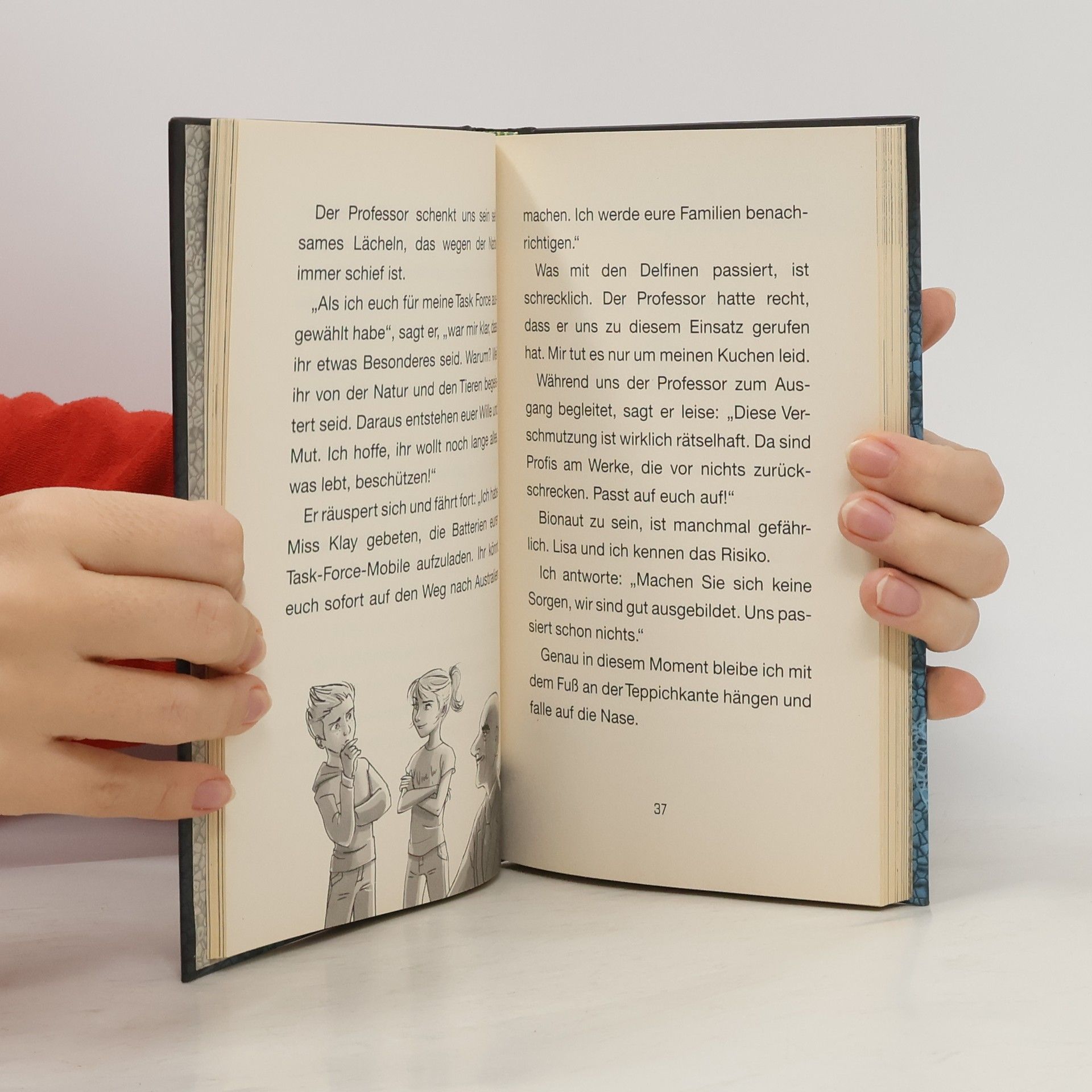 Im Jahr 2100: Seit 200 Jahren zerstören die Menschen die Natur. Noah und Lisa (beide 10) sind Bionauten, unterwegs im Auftrag von Professor Iku. Dieser hat einen Overall entwickelt, in dem sich die Bionauten in Tiere und Pflanzen verwandeln können. In diesem 1. Abenteuer werden die Kinder zu Delfinen und erkunden, weshalb an der Australischen Küste viele Delfine an Land verenden. Eine Firma, die Plastik, Medikamente, landwirtschaftliche Produkte und Treibstoff herstellt, entsorgt ihre giftigen Abfälle im Meer (umweltfreundliche Produktion ist teuer). An diesen sterben die Delfine. - Gesellschaftskritik für kleine Leser; in einfachen Sätzen im Präsens erzählt. Eine gewisse Spannung kommt auf, als die beiden Protagonisten in Gefahr geraten. Sie können sich retten - am Ende siegt das Gute. Mit einigen Schwarz-Weiss-Illustrationen. Überall möglich. Ab 8