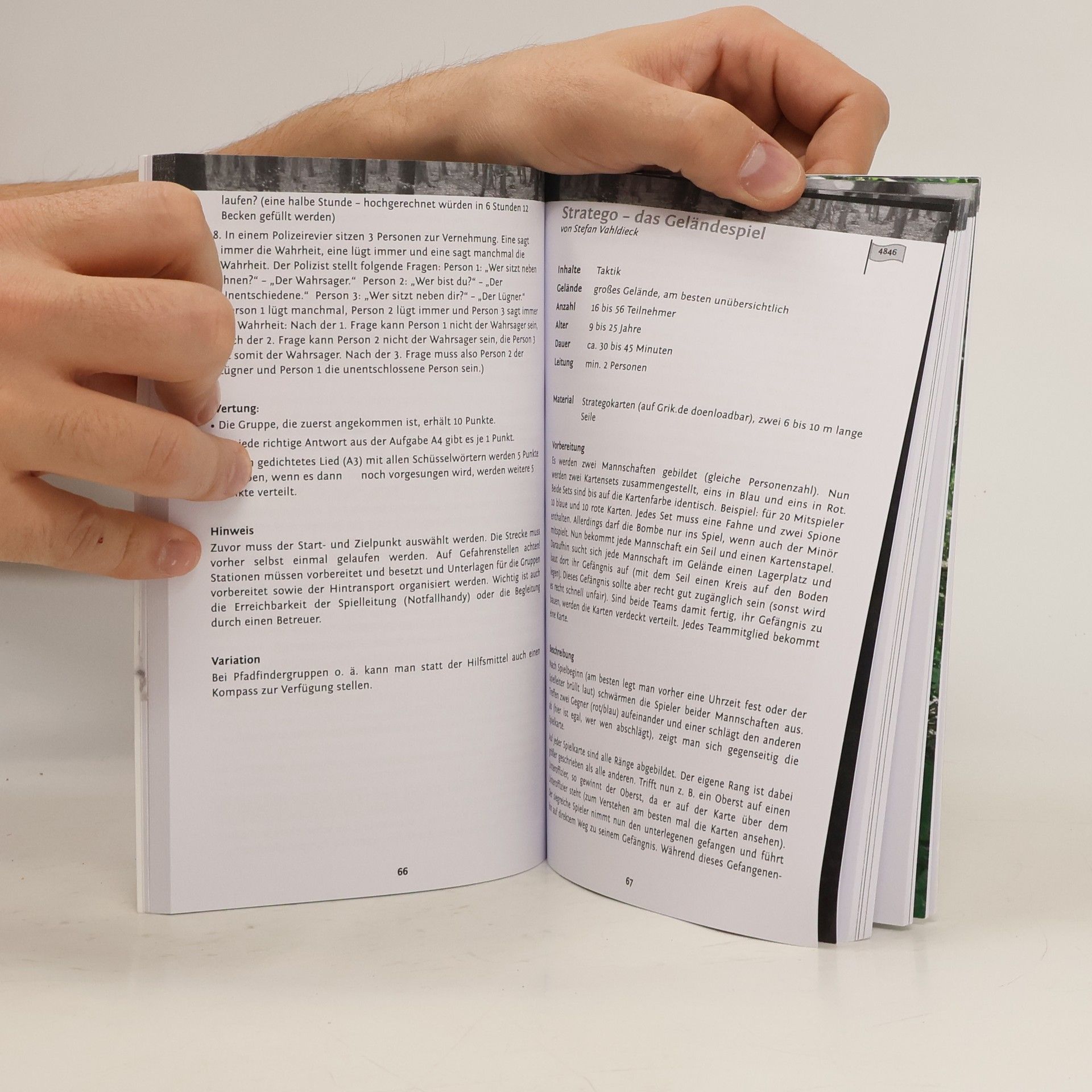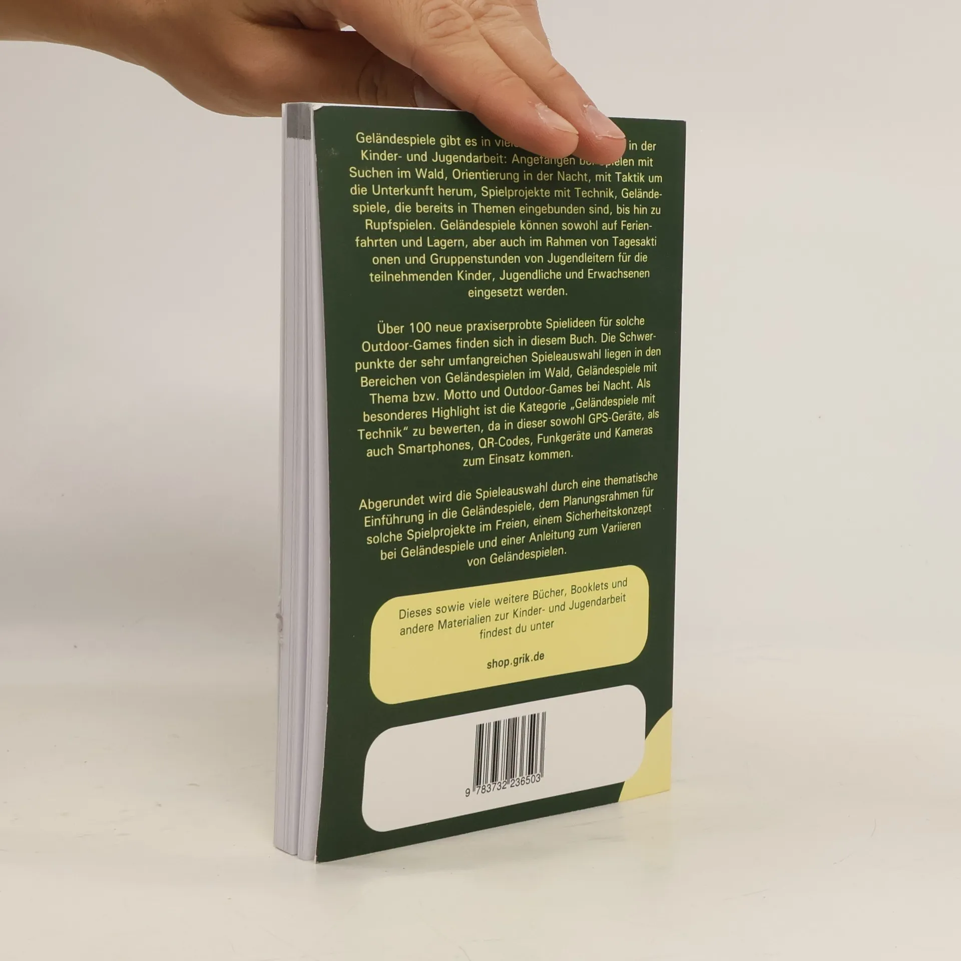 Gelandespiele gibt es in vielen Formen und Arten in der Kinder- und Jugendarbeit: Angefangen bei Spielen mit Suchen im Wald, Orientierung in der Nacht, mit Taktik um die Unterkunft herum, Spielprojekte mit Technik, Gelandespiele, die bereits in Themen eingebunden sind, bis hin zu Rupfspielen. Gelandespiele konnen sowohl auf Ferienfahrten und Lagern, aber auch im Rahmen von Tagesaktionen und Gruppenstunden von Jugendleitern fur die teilnehmenden Kinder, Jugendliche und Erwachsenen eingesetzt werden. Uber 100 neue praxiserprobte Spielideen fur solche Outdoor-Games finden sich in diesem Buch. Die Spiele konnen dabei zum Grossteil schon bei jungeren Kindern, bei Jugendlichen und auch bei Erwachsenen eingesetzt werden. Die Schwerpunkte der sehr umfangreichen Spieleauswahl liegen in den Bereichen von Gelandespielen im Wald, Gelandespiele mit Thema bzw. Motto und Outdoor-Games bei Nacht. Als besonderes Highlight ist die Kategorie Gelandespiele mit Technik" zu bewerten, da in dieser sowohl GPS-Gerate, als auch Smartphones, QR-Codes, Funkgerate und Kameras zum Einsatz kommen. Abgerundet wird die Spieleauswahl durch eine thematische Einfuhrung in die Gelandespiele, dem Planungsrahmen fur solche Spielprojekte im Freien, einem Sicherheitskonzept bei Gelandespiele und einer Anleitung zum Variieren von Gelandespielen nach Alter der Teilnehmer, Grosse der Gruppe, Spielregeln und Spielziel