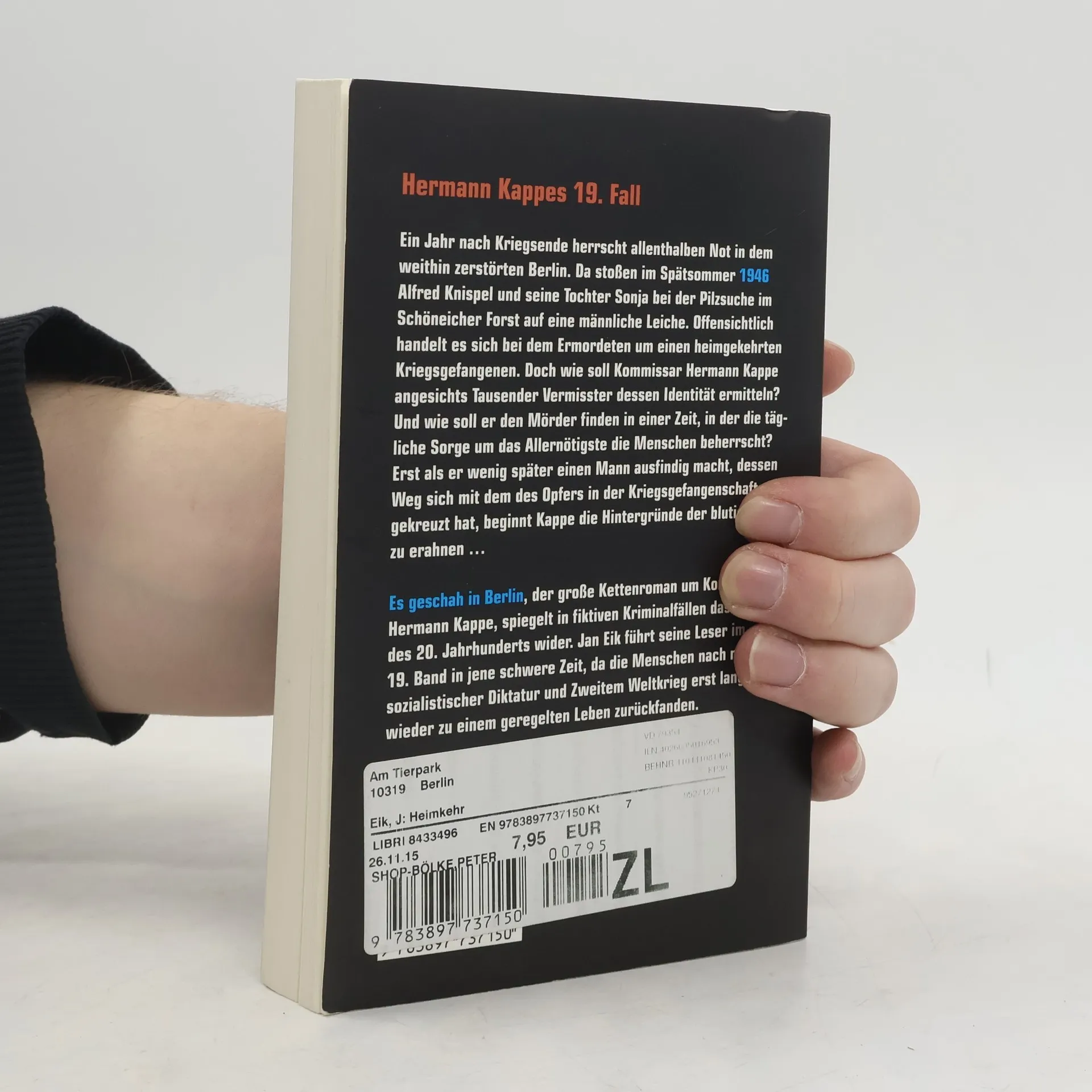 Berlin im Spätsommer 1946: Ein Jahr nach Kriegsende herrscht Chaos in der zerstörten Stadt. Die Besatzungsmächte haben Berlin in vier Sektoren unterteilt. Hunger, Not, Kriminalität und Schwarzmarkthandel bestimmen das alltägliche Leben der Menschen.Kommissar Hermann Kappe ist damit beschäftigt, eine Mordserie an alleinstehenden Frauen in den Wäldern um Berlin aufzuklären, als Pilzsucher auf die Leiche eines ermordeten Mannes stoßen. Alles deutet darauf hin, dass es sich bei dem Toten um einen heimgekehrten Kriegsgefangenen handelt. Davon gibt es Tausende in Berlin, und niemand scheint den Mann zu vermissen. Dank Kappes Bemühungen kann die Identität des Toten ermittelt werden vom Täter und vom Motiv indes fehlt jede Spur. Erst nach und nach richtet sich der Blick des misstrauischen Kommissars auf die trauernde Witwe und deren mysteriösen Bruder Der renommierte Krimi-Autor Jan Eik, der bereits mehrere Bände zur erfolgreichen Reihe Es geschah in Berlin beigetragen hat, erzählt aus einer bitteren Zeit, in der die Menschen versuchen, sich nach nationalsozialistischer Diktatur und Zweitem Weltkrieg im Alltag zurechtzufinden.