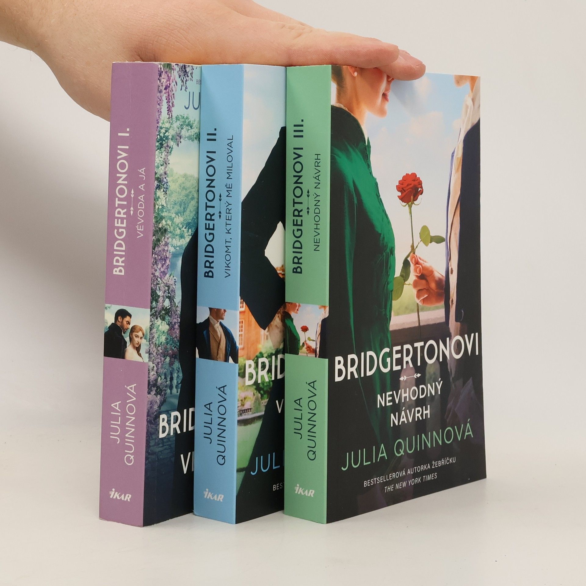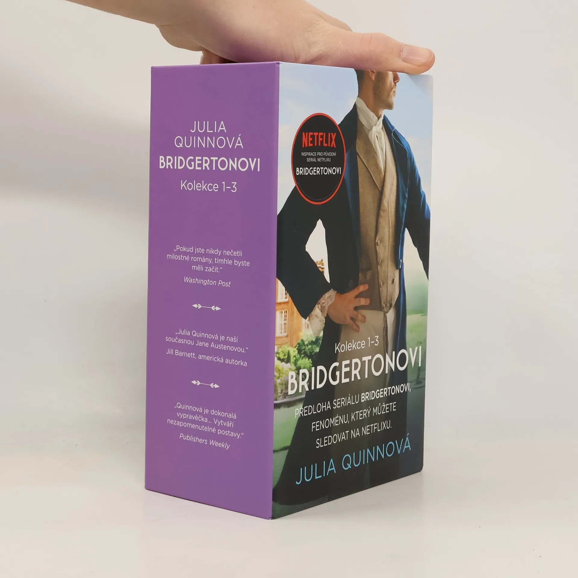 Přeneste se s tímto nápaditým boxem do tanečních sálů regentského Londýna. Čekají vás velmi svérázní aristokraté a nespočet zářivých plesů. Potkáte spoustu šarmantních mužů a troufalých žen, vyslechnete nekonečno klepů, a než se nadějete, stanete se obětí vychytralých intrikánek… V této sbírce na vás čekají první tři knihy – Vévoda a já; Vikomt, který mě miloval; Nevhodný návrh – celosvětově oblíbené série Bridgertonovi, jež se stala předlohou fenoménu, který můžete v současné době sledovat na Netflixu.