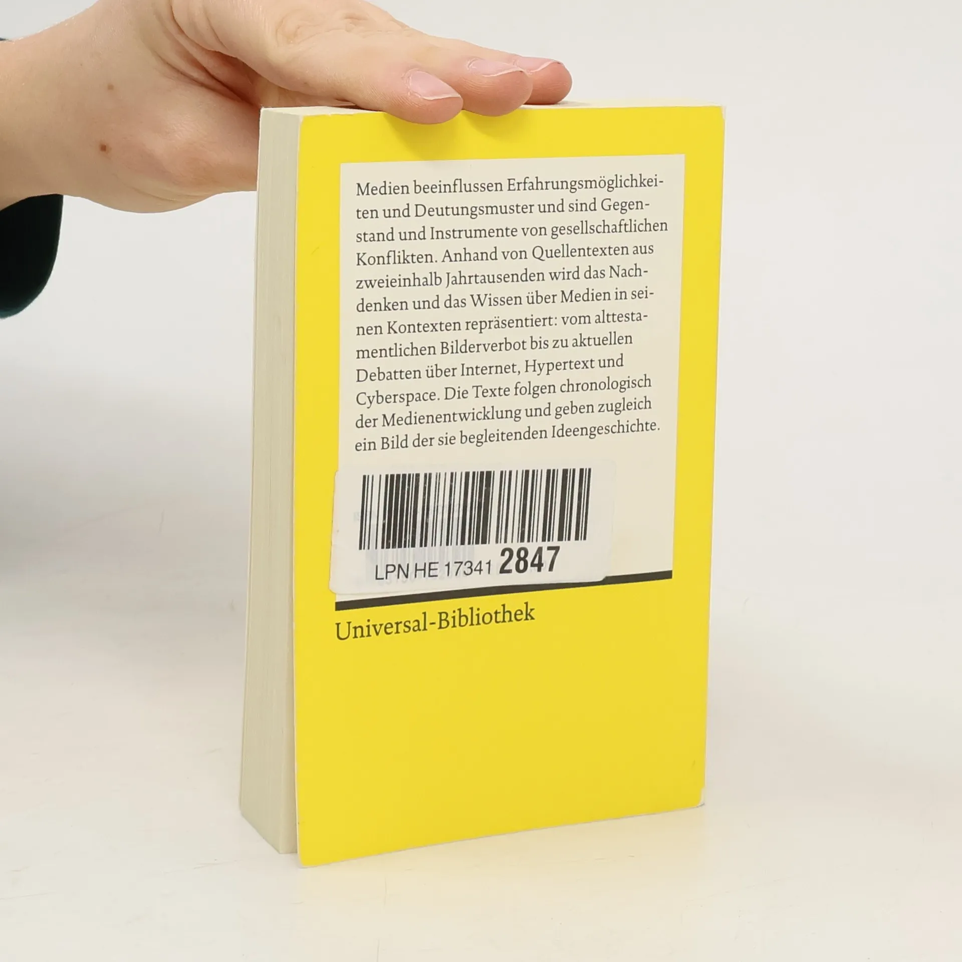 Medien beeinflussen Erfahrungsmöglichkeiten und Deutungsmuster und sind Gegenstand und Instrumente von gesellschaftlichen Konflikten. Anhand von Quellentexten aus zweieinhalb Jahrtausenden wird das Nachdenken und das Wissen über Medien in seinen Kontexten repräsentiert: vom alttestamentlichen Bilderverbot bis zu aktuellen Debatten über Internet, Hypertext und Cyberspace. Die Texte folgen chronologisch der Medienentwicklung und geben zugleich ein Bild der sie begleitenden Ideengeschichte.