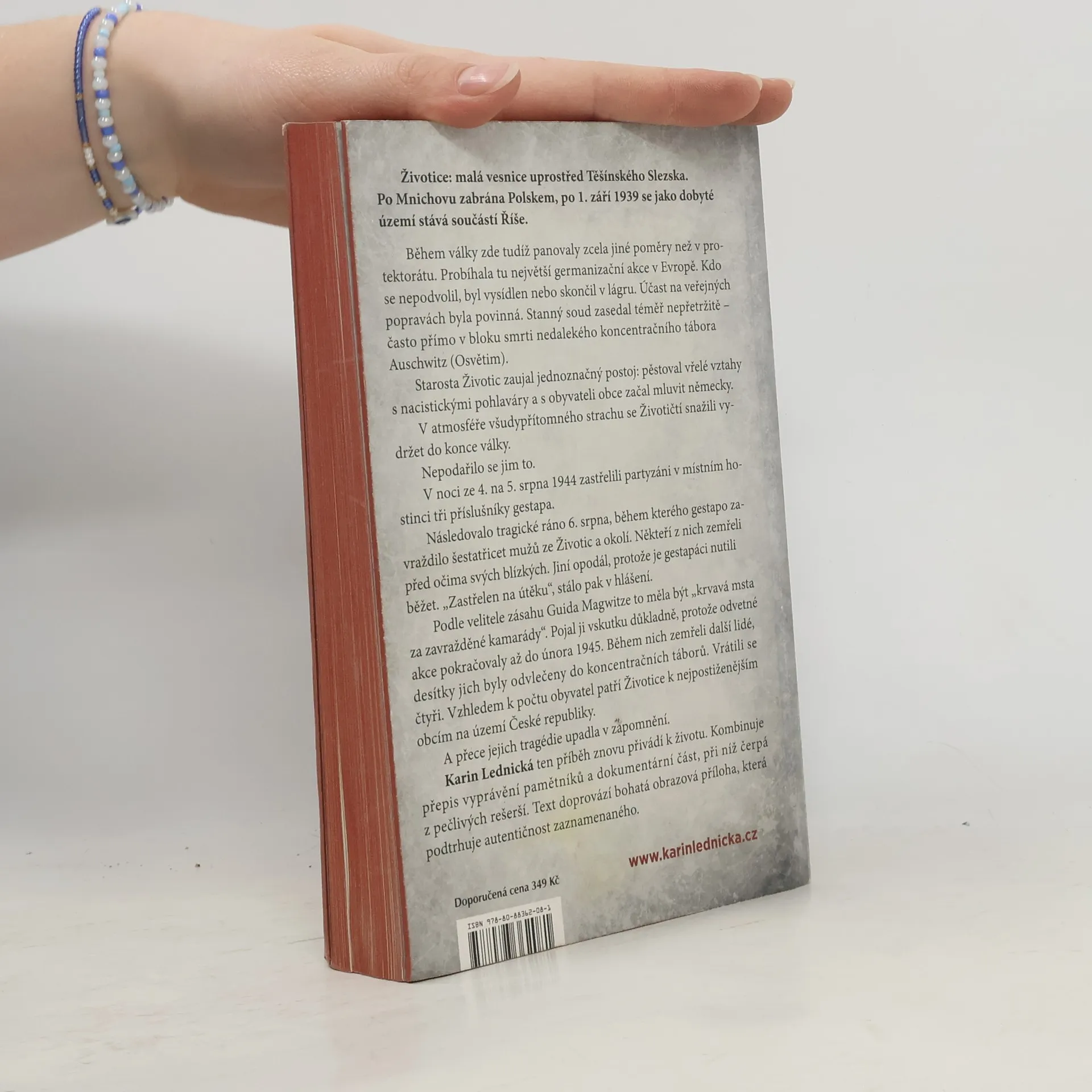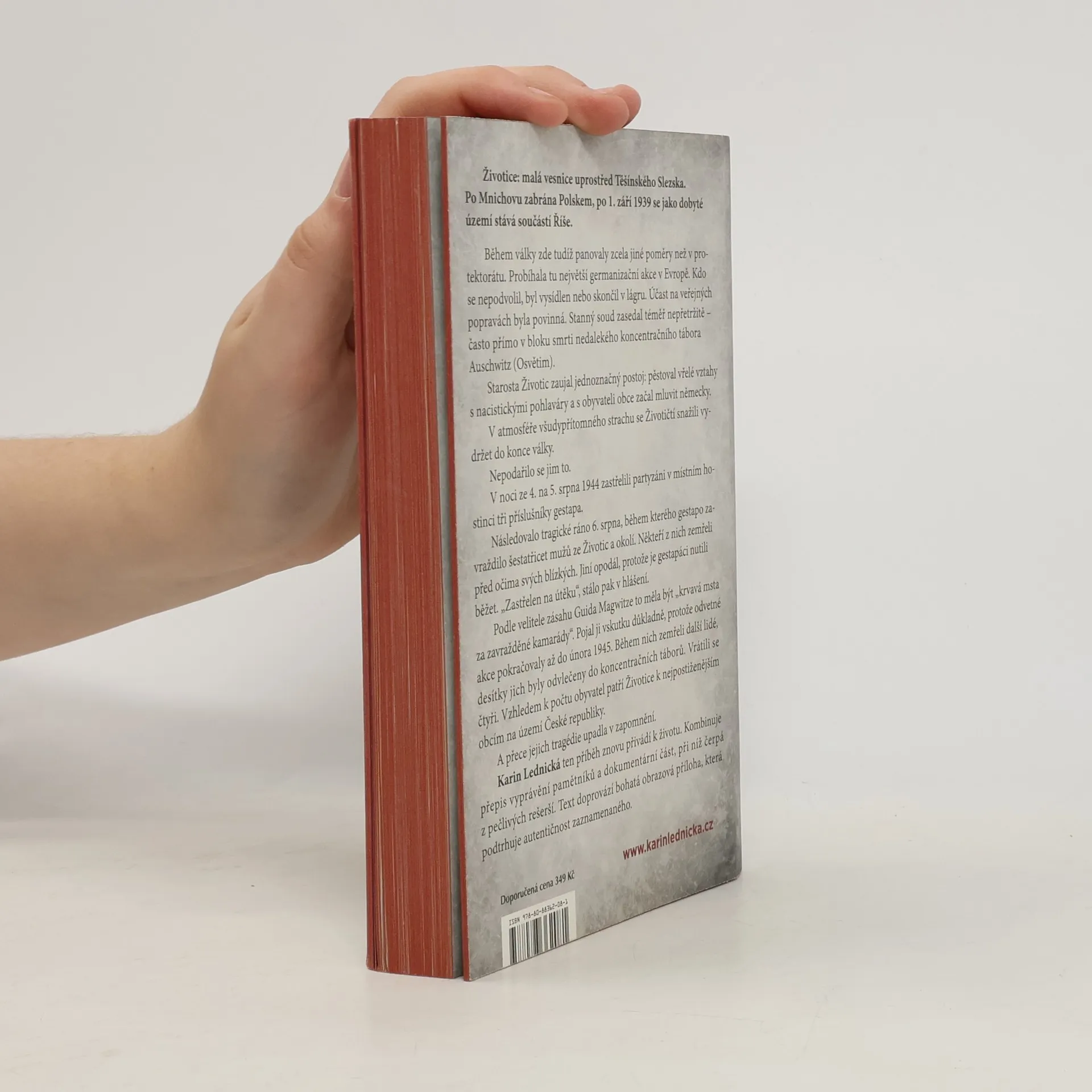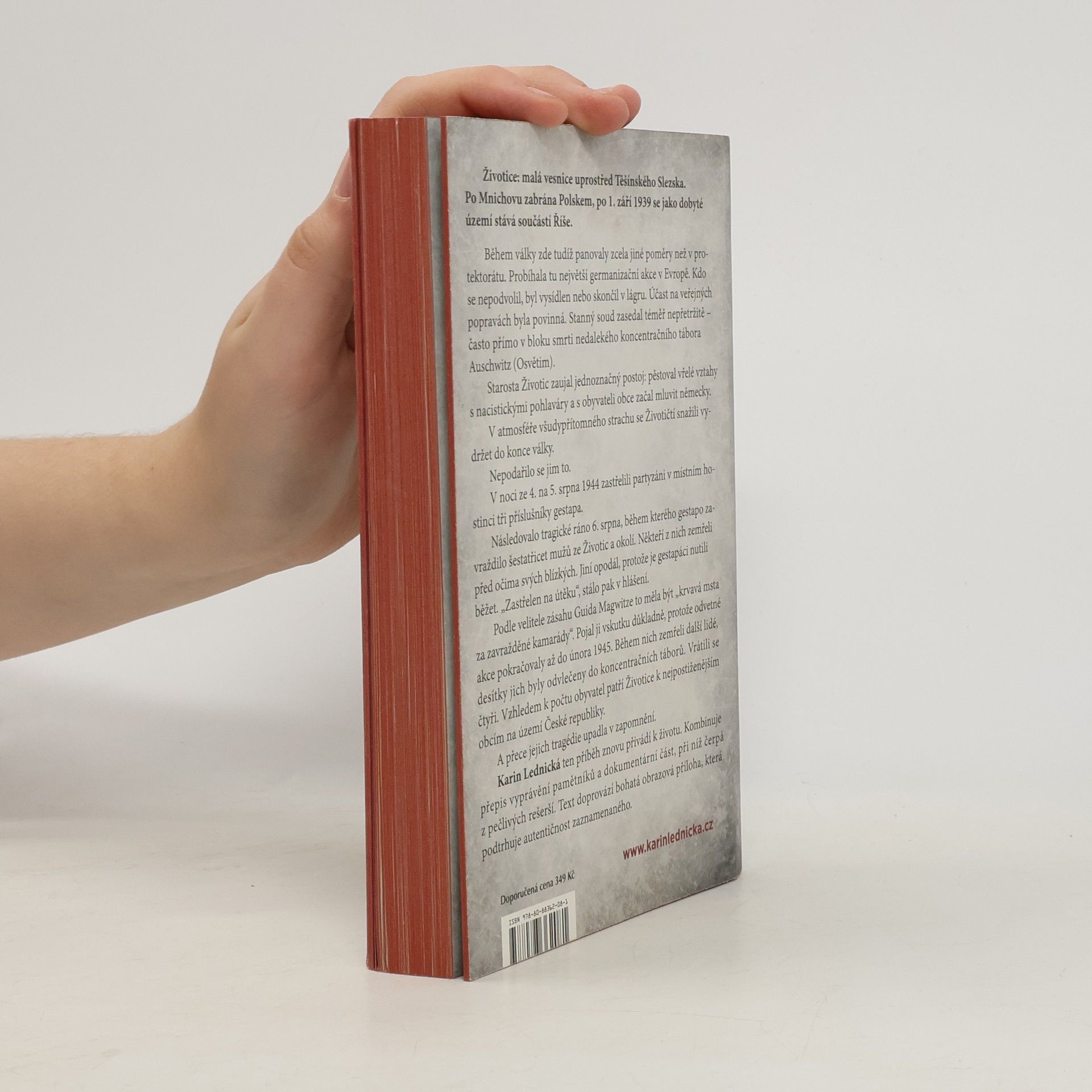 Životice: malá vesnice uprostřed Těšínského Slezska. Po Mnichovu zabrána Polskem, po 1. září 1939 se jako dobyté území stává součástí Říše. Během války zde tudíž panovaly zcela jiné poměry než v protektorátu. Probíhala tu největší germanizační akce v Evropě. Kdo se nepodvolil, byl vysídlen nebo skončil v lágru. Účast na veřejných popravách byla povinná. Stanný soud zasedal téměř nepřetržitě – často přímo v bloku smrti nedalekého koncentračního tábora Auschwitz (Osvětim). Starosta Životic zaujal jednoznačný postoj: pěstoval vřelé vztahy s nacistickými pohlaváry a s obyvateli obce začal mluvit německy. V atmosféře všudypřítomného strachu se Životičtí snažili vydržet do konce války. Nepodařilo se jim to. Karin Lednická ten příběh znovu přivádí k životu. Kombinuje přepis vyprávění pamětníků a dokumentární část, při níž čerpá z pečlivých rešerší. Text doprovází bohatá obrazová příloha, která podtrhuje autentičnost zaznamenaného.