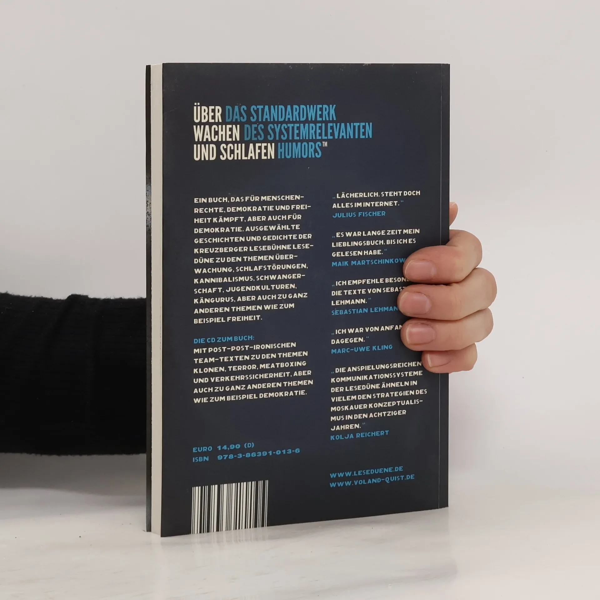 Ein Buch, das für Menschenrechte, Demokratie und Freiheit kämpft, aber auch für Demokratie. Ausgewählte Geschichten und Gedichte der Kreuzberger Lesebühne Lesedüne zu den Themen Überwachung, Schlafstörungen, Kannibalismus, Schwangerschaft, Jugendkulturen, Kängurus, aber auch zu ganz anderen Theme wie zum Beispiel Freiheit.§§Die CD zum Buch:§Mit post-post-ironischen Team-Texten zu den Themen Klonen, Terror, Meatboxing und Verkehrssicherheit, aber auch zu ganz anderen Themen wie zum Beispiel Demokratie.