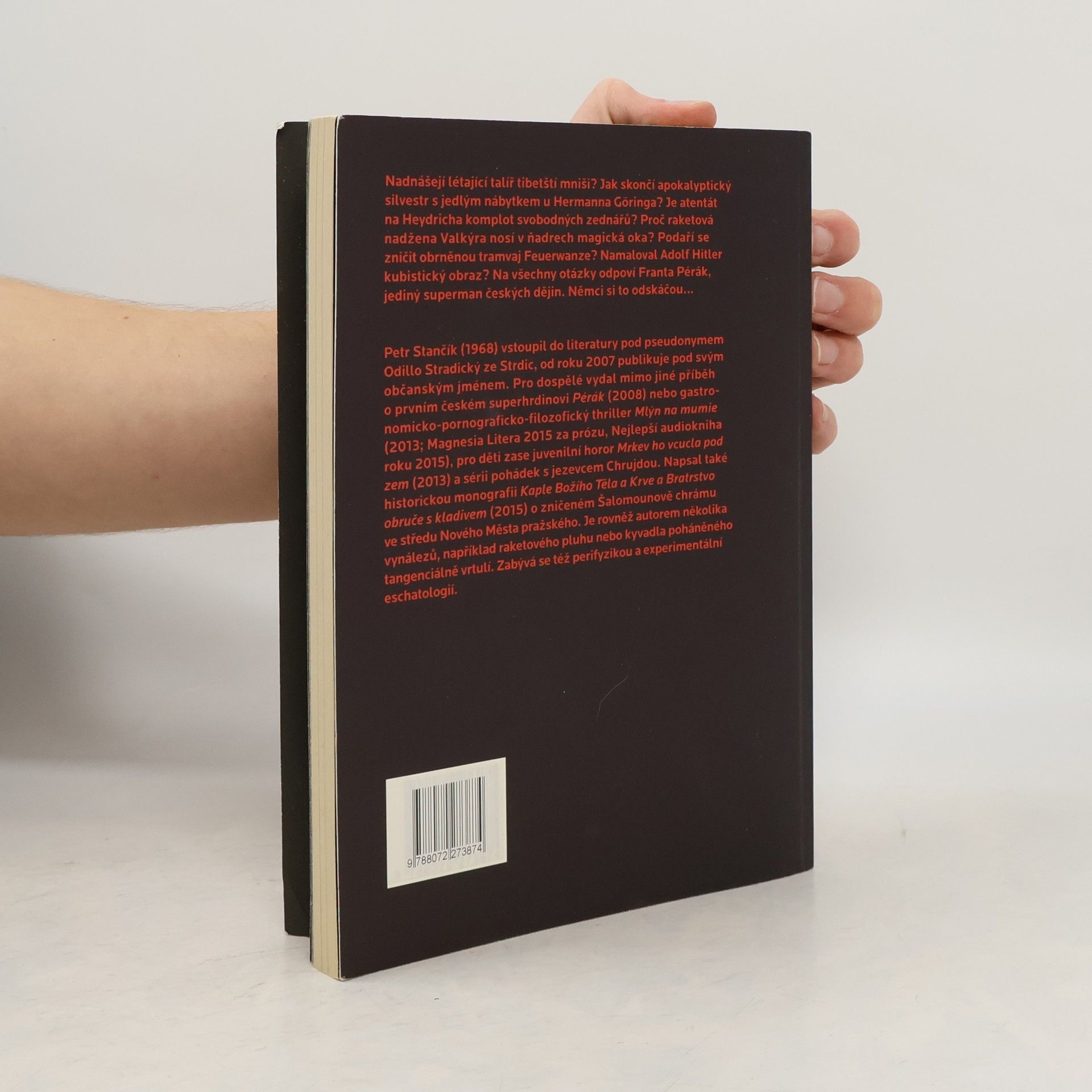 Petr Stančík se ve své próze originálním způsobem ujal protektorátní městské legendy o superhrdinovi vzdorujícím nacistům a nabízí skvělou kombinaci napínavého příběhu, historického poučení a přesně odměřené dávky humoru. Nadnášejí létající talíř tibetští mniši? Jak skončí apokalyptický silvestr s jedlým nábytkem u Hermanna Göringa? Je atentát na Heydricha komplot svobodných zednářů? Proč raketová nadžena Valkýra nosí v ňadrech magická oka? Podaří se zničit obrněnou tramvaj Feuerwanze? Namaloval Adolf Hitler kubistický obraz? Na všechny otázky odpoví Franta Pérák, jediný superman českých dějin. Němci si to odskáčou... Příběh je na stránkách knihy doplněn stylovými ilustracemi a textovým i obrazový doprovodem - dobové letáky, reklamy, nákresy zbraní, biografické poznámky, atd.