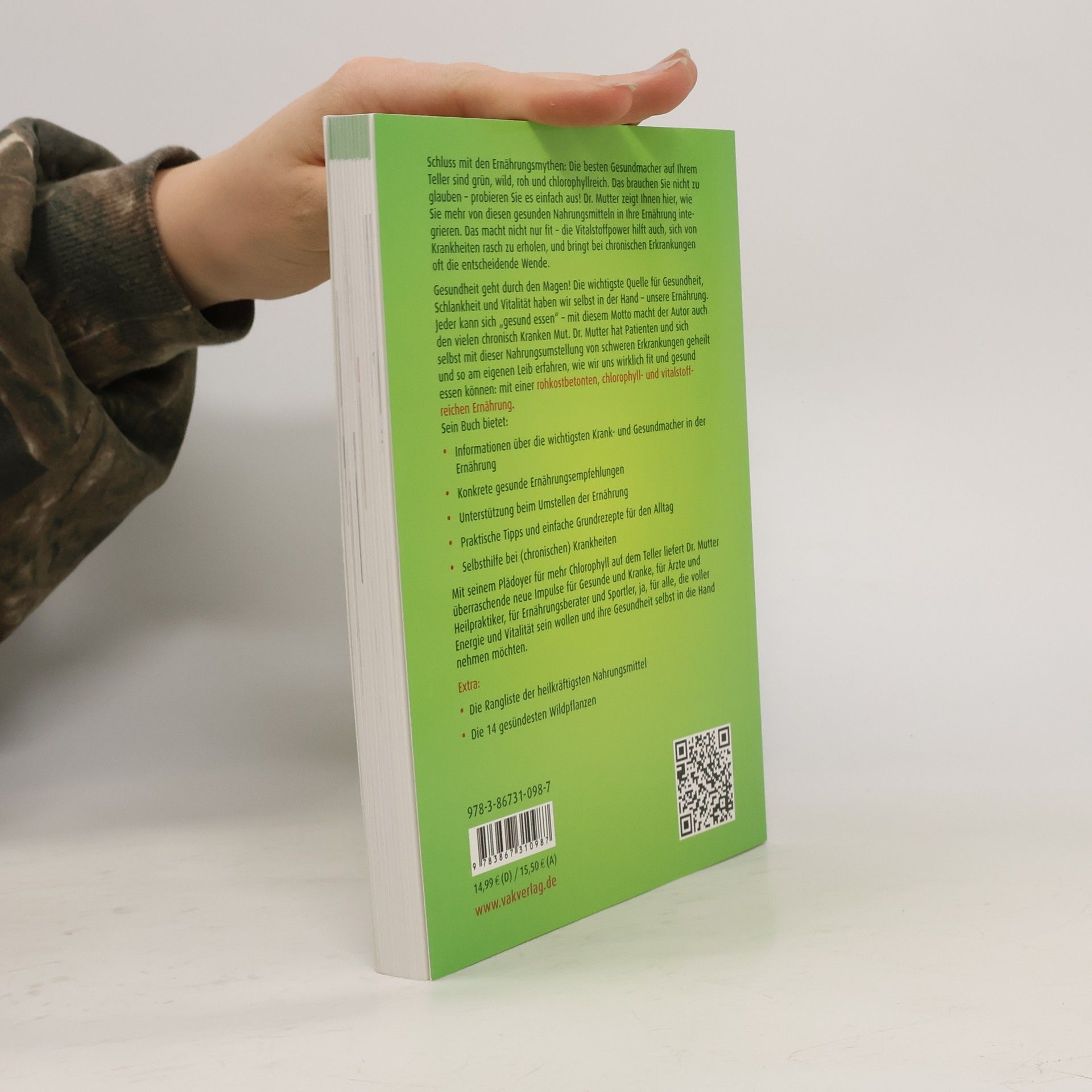 Schluss mit den Ernährungsmythen: Die besten Gesundmacher auf Ihrem Teller sind grün, wild, roh und chlorophyllreich. Das brauchen Sie nicht zu glauben - probieren Sie es einfach aus! Dr. Mutter zeigt Ihnen hier, wie Sie mehr von diesen gesunden Nahrungsmitteln in Ihre Ernährung integrieren. Das macht nicht nur fit, die Vitalstoffpower hilft auch, sich von Krankheiten rasch zu erholen, und bringt bei chronischen Erkrankungen oft die entscheidende Wende. Gesundheit geht durch den Magen! Die wichtigste Quelle für Gesundheit und Vitalität haben wir selbst in der Hand - unsere Ernährung. Jeder kann sich "gesund essen" - mit diesem Motto macht der Autor auch den vielen chronisch Kranken Mut. Dr. Mutter hat sich selbst mit dieser Nahrungsumstellung von einer schweren Erkrankung geheilt und so am eigenen Leib erfahren, wie wir uns wirklich fit und gesund essen können: mit einer rohkostbetonten, chlorophyll- und vitalstoffreichen Ernährung. Sein Buch bietet:- Informationen über die wichtigsten Krank- und Gesundmacher in der Ernährung- Konkrete gesunde Ernährungsempfehlungen - Unterstützung beim Umstellen der Ernährung - Praktische Tipps und einfache Grundrezepte für den Alltag - Selbsthilfe bei (chronischen) KrankheitenMit seinem Plädoyer für mehr Chlorophyll auf dem Teller liefert Dr. Mutter überraschende neue Impulse für Gesunde und Kranke, für Ärzte und Heilpraktiker, für Ernährungsberater und Sportler, ja, für alle, die voller Energie und Vitalität sein wollen und ihre Gesundheit selbst in die Hand nehmen möchten. Extra: -Die Rangliste der heilkräftigsten Nahrungsmittel-Die 14 gesündesten Wildpflanzen
