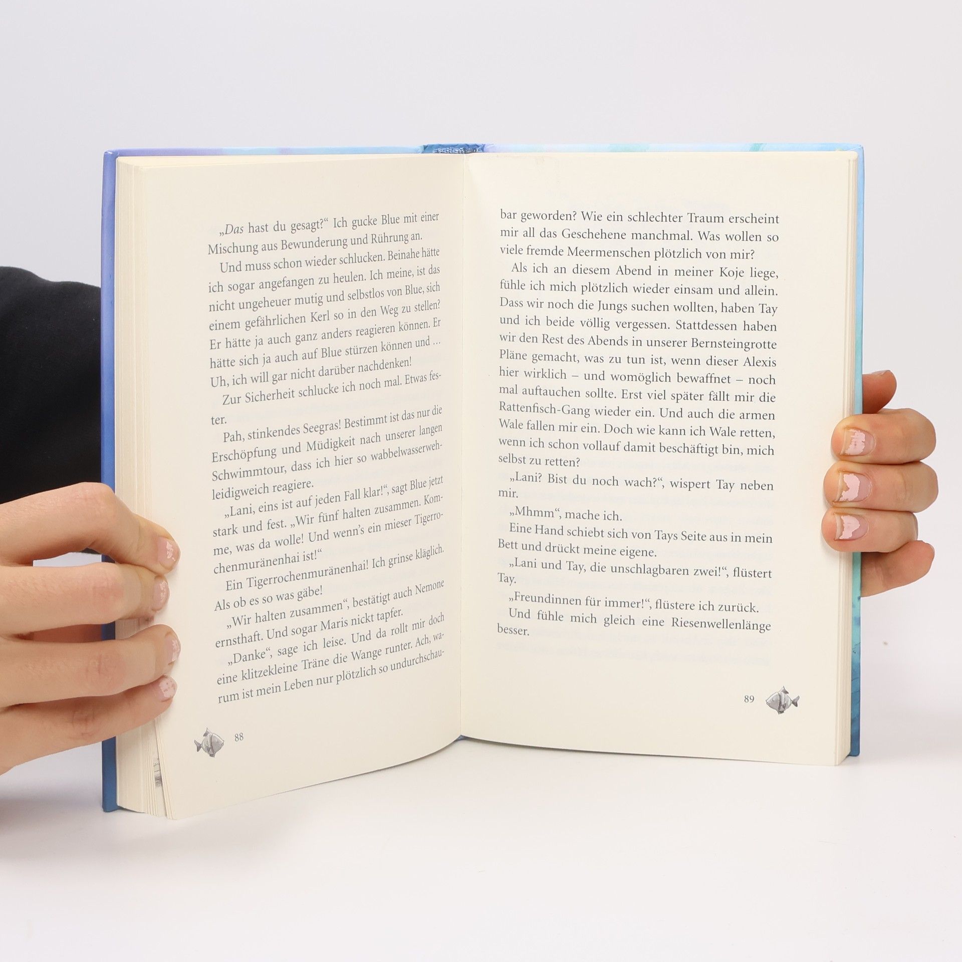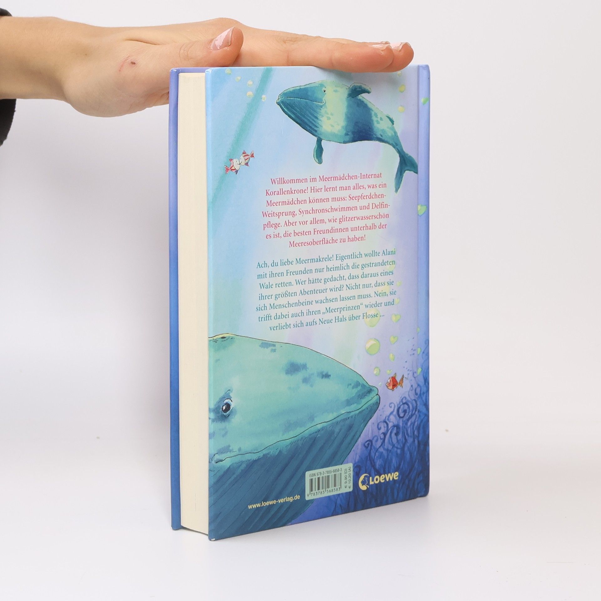 Willkommen im Meermädchen-Internat Korallenkrone! Hier lernt man alles, was ein Meermädchen können muss: Seepferdchen-Weitsprung, Synchronschwimmen und Delfin-Pflege. Aber vor allem, wie glitzerwasserschön es ist, die besten Freundinnen unterhalb der Meeresoberfläche zu haben! Ach du liebe Meermakrele! Eigentlich wollte Alani mit ihren Freunden nur heimlich die gestrandeten Wale retten. Wer hätte gedacht, dass daraus eines ihrer größten Abenteuer wird? Nicht nur, dass sie sich Menschenbeine wachsen lassen muss. Nein, sie trifft dabei auch ihren "Meerprinzen" wieder und verliebt sich aufs Neue Hals über Flosse.