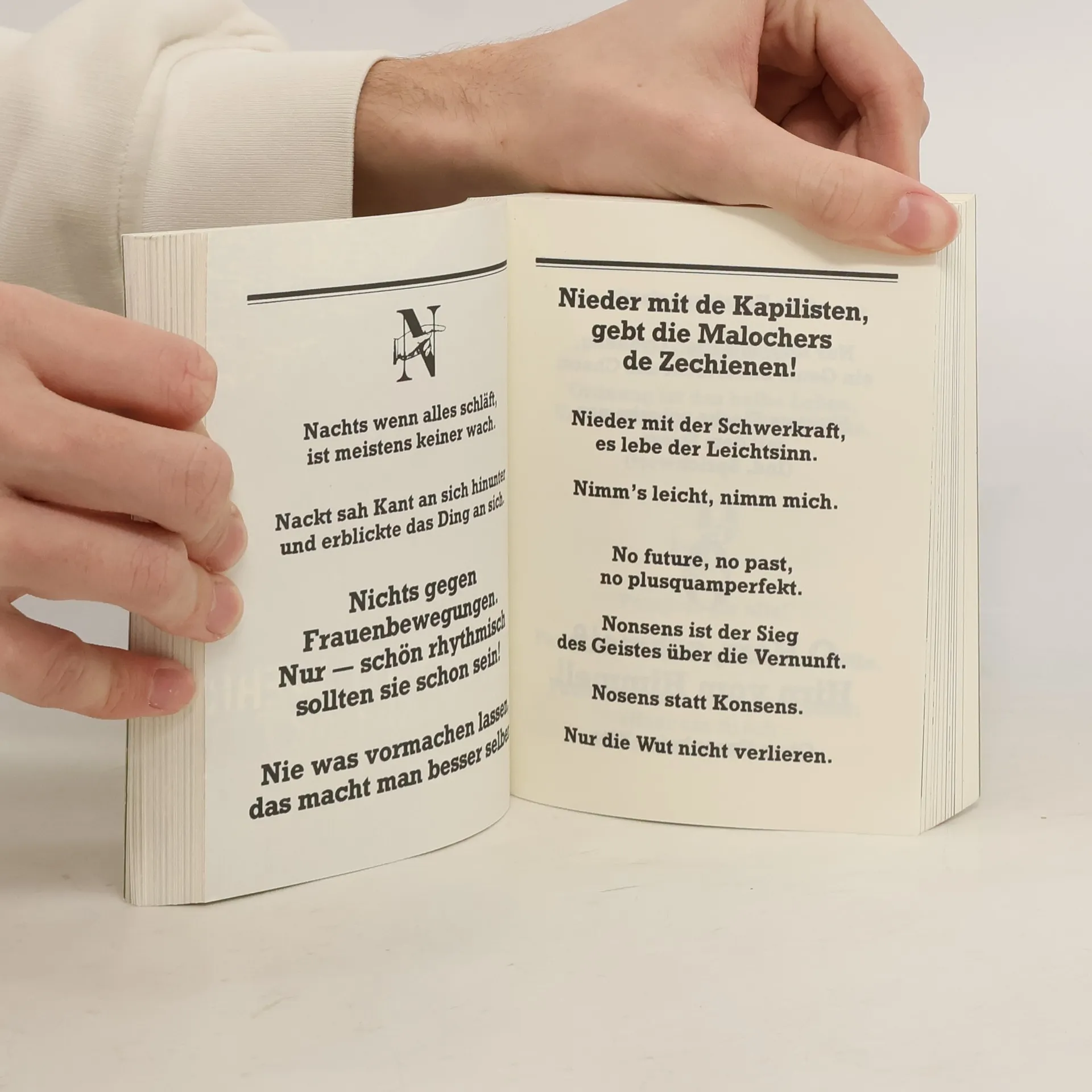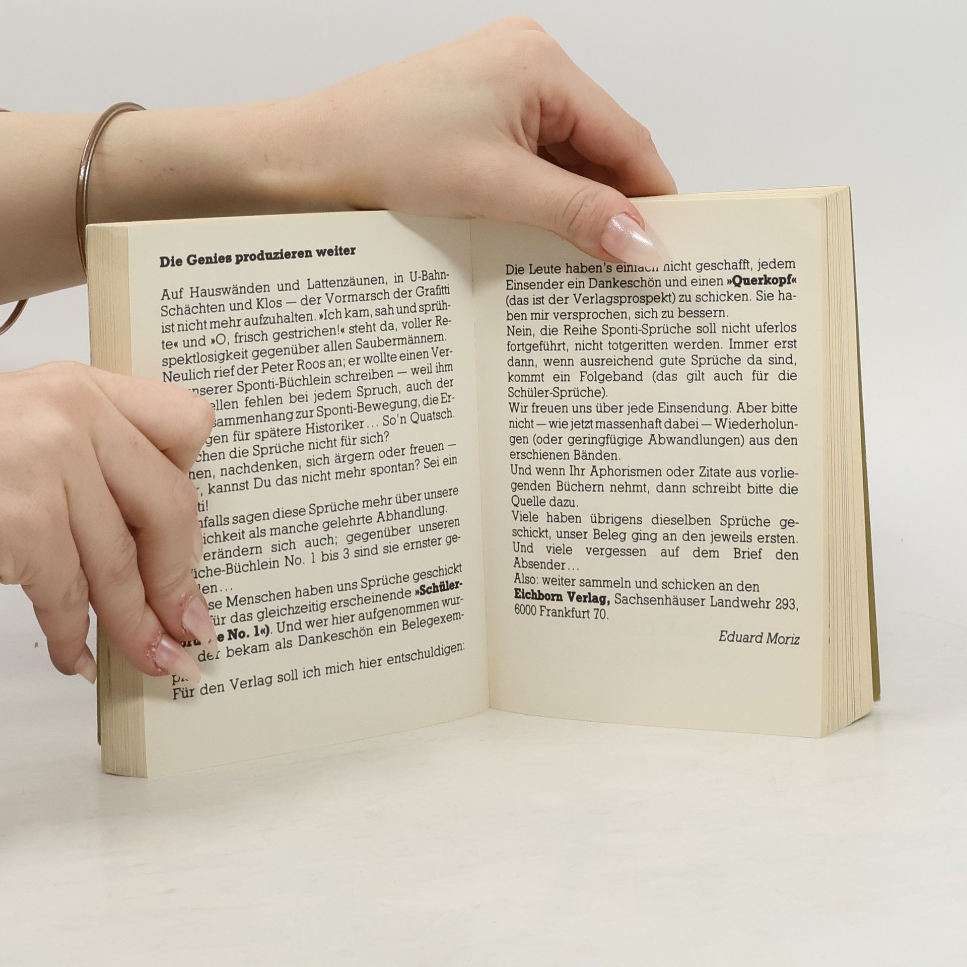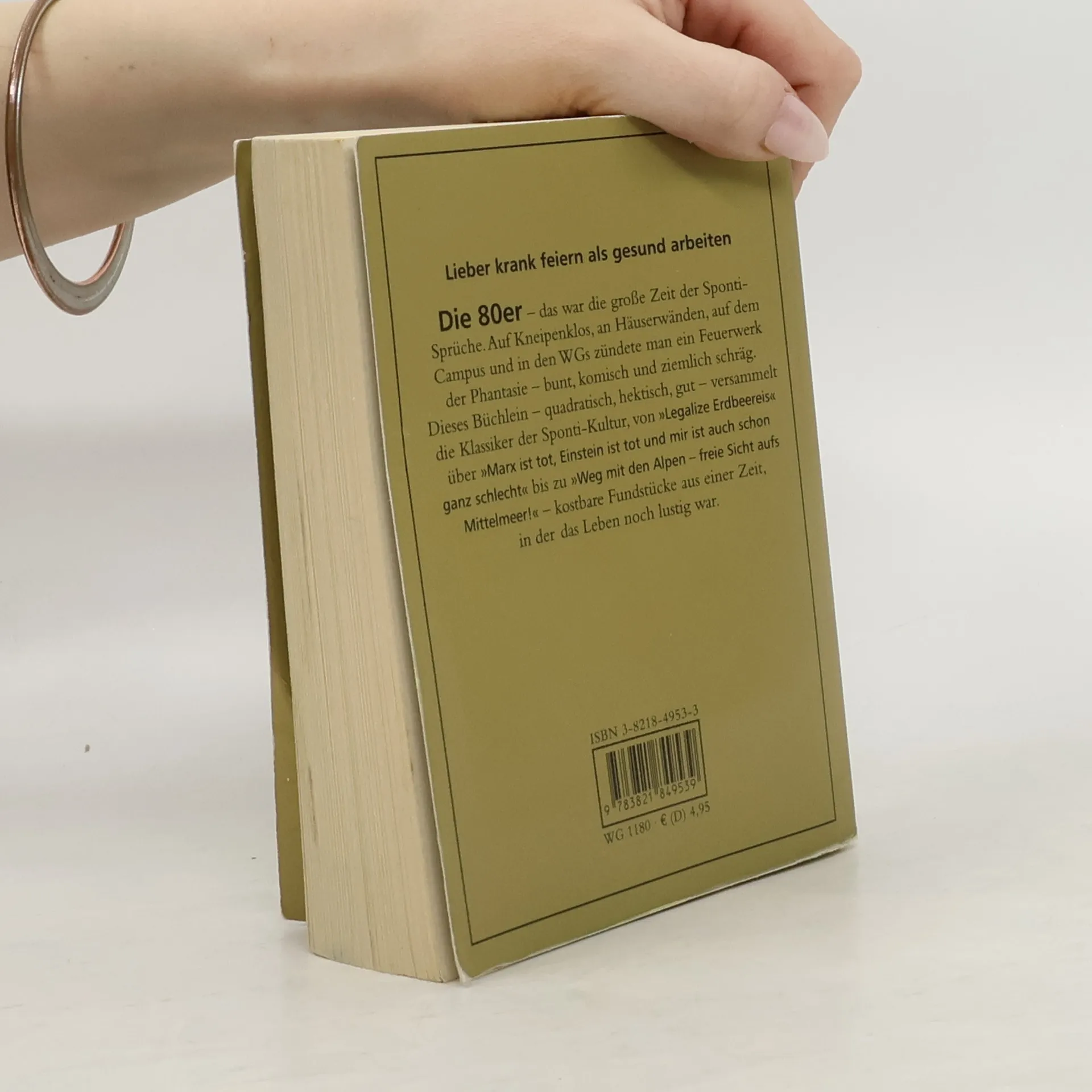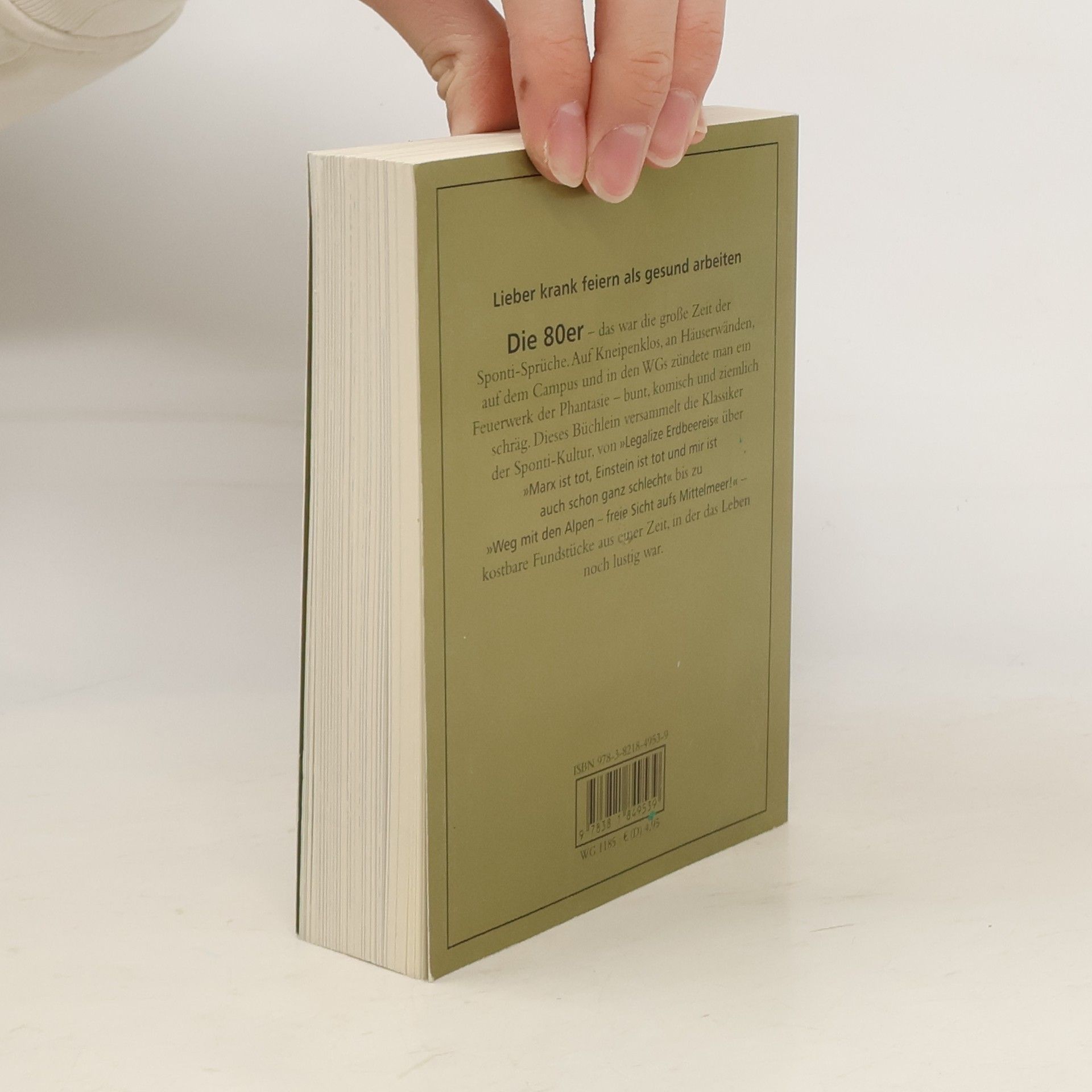 Die 80er - das war die große Zeit der Sponti-Sprüche. Auf Kneipenklos, anHäuserwänden und in hunderttausendfach verkauften Eichborn-Büchlein feierte diePhantasie ein Feuerwerk.Klassiker des Unernstes wie die Forderung "Legalize Erdbeereis" waren ebenso inaller Munde wie Nachdenkliches à la "Marx ist tot, Einstein ist tot und mir ist auch schon ganz schlecht" und die Parole "Weg mit den Alpen - freie Sicht aufs Mittelmeer!" Die kostbarsten Fundstücke aus einer Zeit, in der das Leben noch lustig war.