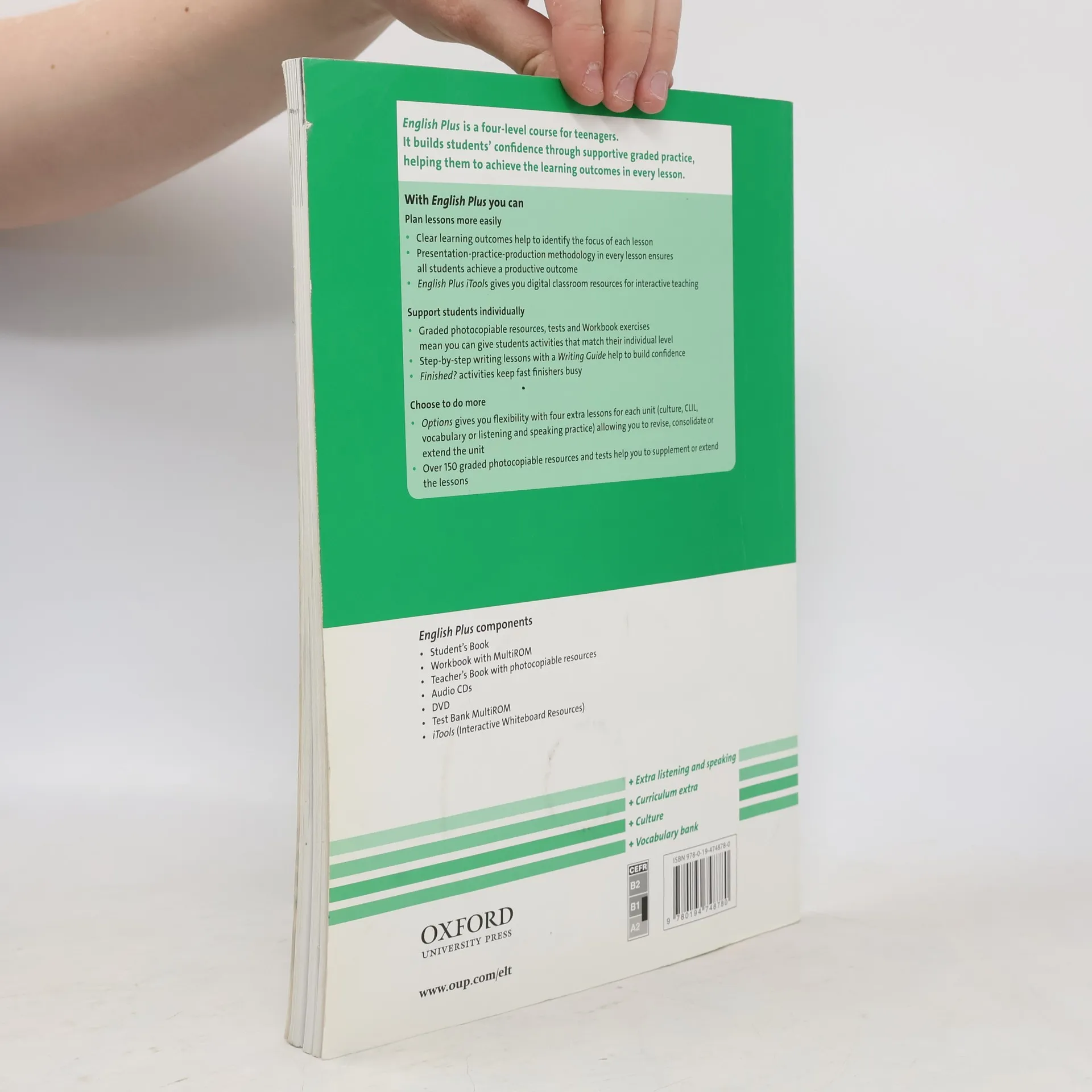 A supportive course that helps students of all abilities build confidence through graded practice. The flexible package makes it ideal for mixed-ability classes, and varying teaching loads. Online Practice provides extra activities for the classroom or home that teachers can track. English Plus develops students' communication skills through a structured and methodical approach, helping students to achieve their individual learning outcomes in every lesson.