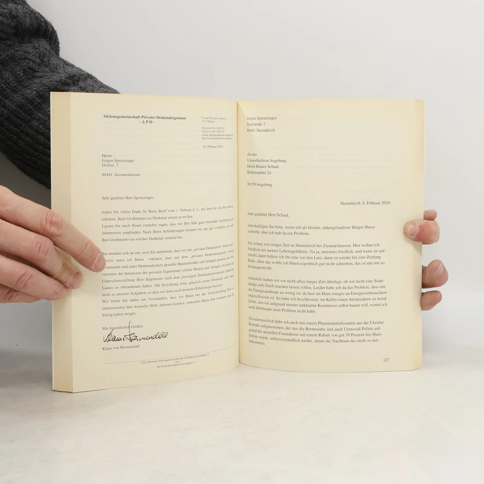 Wer würde nicht gerne dem Finanzamt mitteilen, dass es mit den Steuerzahlungen nun vorbei ist? Oder das Gesundheitsministerium in Kenntnis setzen, dass man seine eigene Krankenkasse gründen will? Sprenzinger tut es. Seine skurrilen Eingaben an Behörden und Verbände stellen die Welt auf den Kopf. Eine großartige Eulenspiegelei!