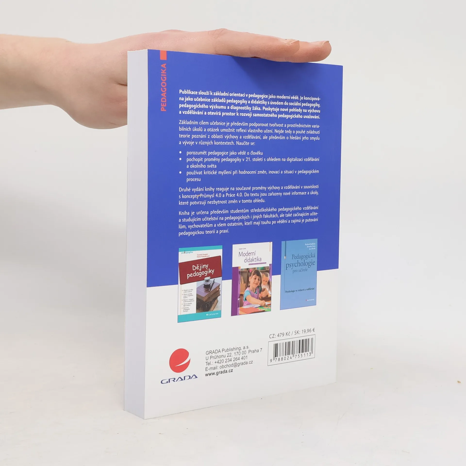 Publikace slouží k základní orientaci v pedagogice jako moderní vědě. Je koncipována jako učebnice základů pedagogiky a didaktiky s úvodem do sociální pedagogiky, pedagogického výzkumu a diagnostiky žáka. Poskytuje nové pohledy na výchovu a vzdělávání a otevírá prostor k rozvoji samostatného pedagogického uvažování. Základním cílem učebnice je především podporovat tvořivost a prostřednictvím variabilních úkolů a otázek umožnit reflexi vlastního učení. Nejde tedy o pouhé zvládnutí teorie poznání z oblasti výchovy a vzdělávání, ale především o hledání jeho smyslu a vývoje v různých kontextech. Naučíte se: • porozumět pedagogice jako vědě o člověku • pochopit proměny pedagogiky v 21. století s ohledem na digitalizaci vzdělávání a okolního světa • používat kritické myšlení při hodnocení změn, inovací a situací v pedagogickém procesu Druhé vydání knihy reaguje na současné proměny výchovy a vzdělávání v souvislosti s koncepty Průmysl 4.0 a Práce 4.0. Do textu jsou zařazeny nové informace a úkoly, které potvrzují nezbytnost změn v tomto ohledu. Kniha je určena především studentům středoškolského pedagogického vzdělávání a studujícím učitelství na pedagogických i jiných fakultách, ale také začínajícím učitelům, vychovatelům a všem ostatním, kteří mají touhu po vědění a zajímá je putování pedagogickou teorií a praxí.