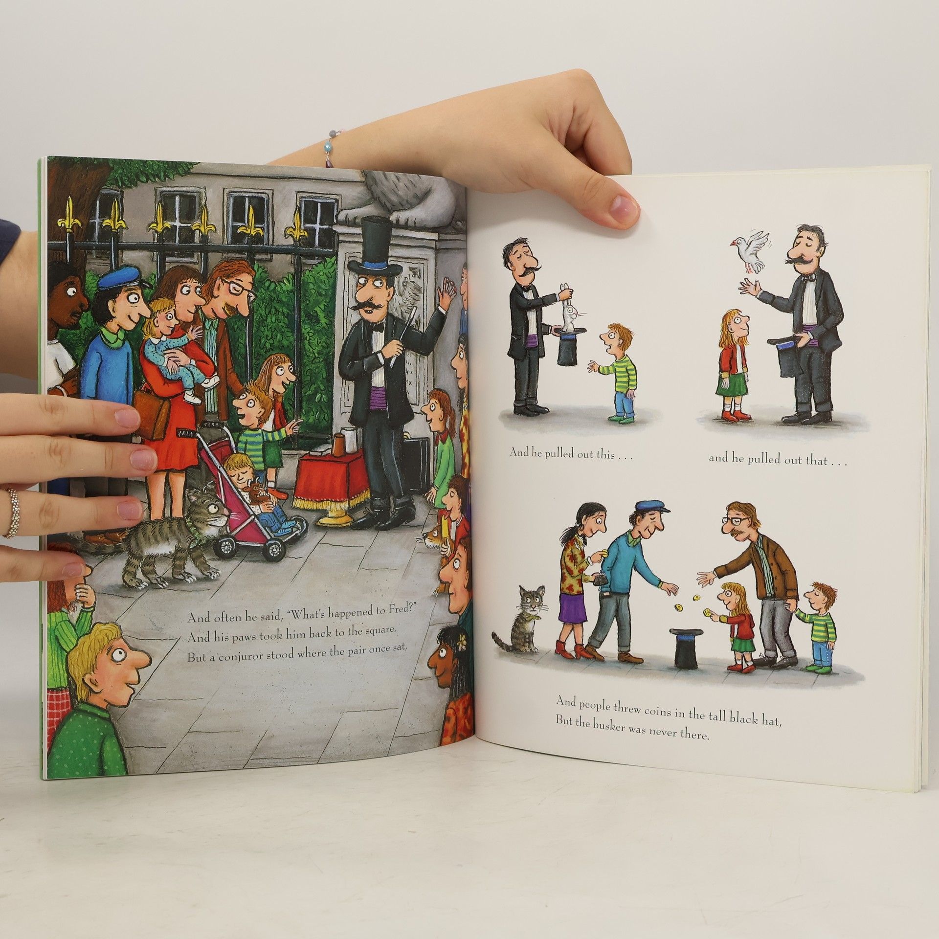 Tabby McTat is a busker's cat. He loves his life with Fred, singing along as people throw coins in their hat. Then one day, Fred has an accident, and the two are separated. How will they ever find each other again?