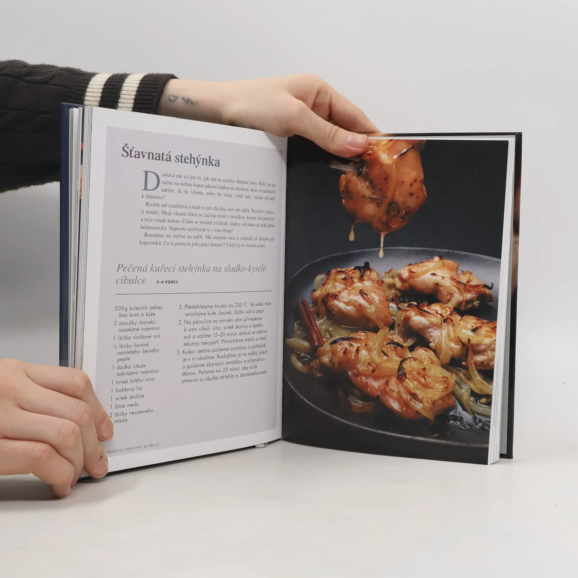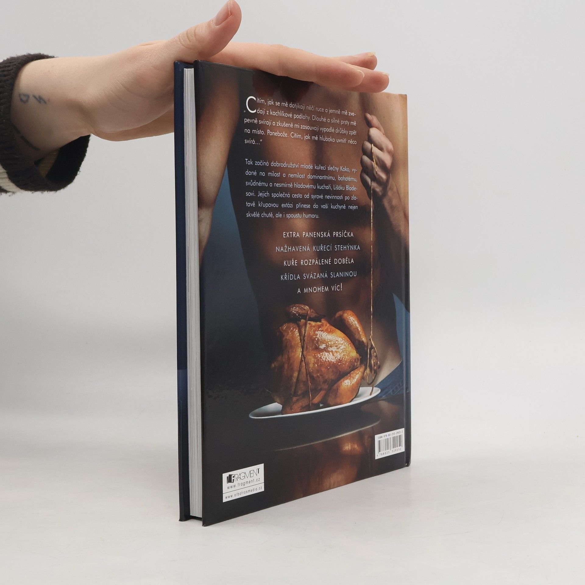 Rozpálená kuchařka, která láme žebříčky prodejnosti. „Cítím, jak se mě dotýkají něčí ruce a jemně mě zvedají z kachlíkové podlahy. Dlouhé a silné prsty mě pevně svírají a zkušeně mi zasouvají vypadlé drůbky zpět na místo. Panebože. Cítím, jak mě hluboko uvnitř něco svírá…“ Tak začíná dobrodružství mladé kuřecí slečny Koko, vydané na milost a nemilost dominantnímu, bohatému, svůdnému a nesmírně hladovému kuchaři, Lišáku Bladesovi. Jejich společná cesta od syrové nevinnosti po zlatavě křupavou extázi přinese do vaší kuchyně nejen skvělé chutě, ale i spoustu humoru. - EXTRA PANENSKÁ PRSÍČKA - NAŽHAVENÁ KUŘECÍ STEHÝNKA - KUŘE ROZPÁLENÉ DOBĚLA - KŘÍDLA SVÁZANÁ SLANINOU - A MNOHEM VÍC!