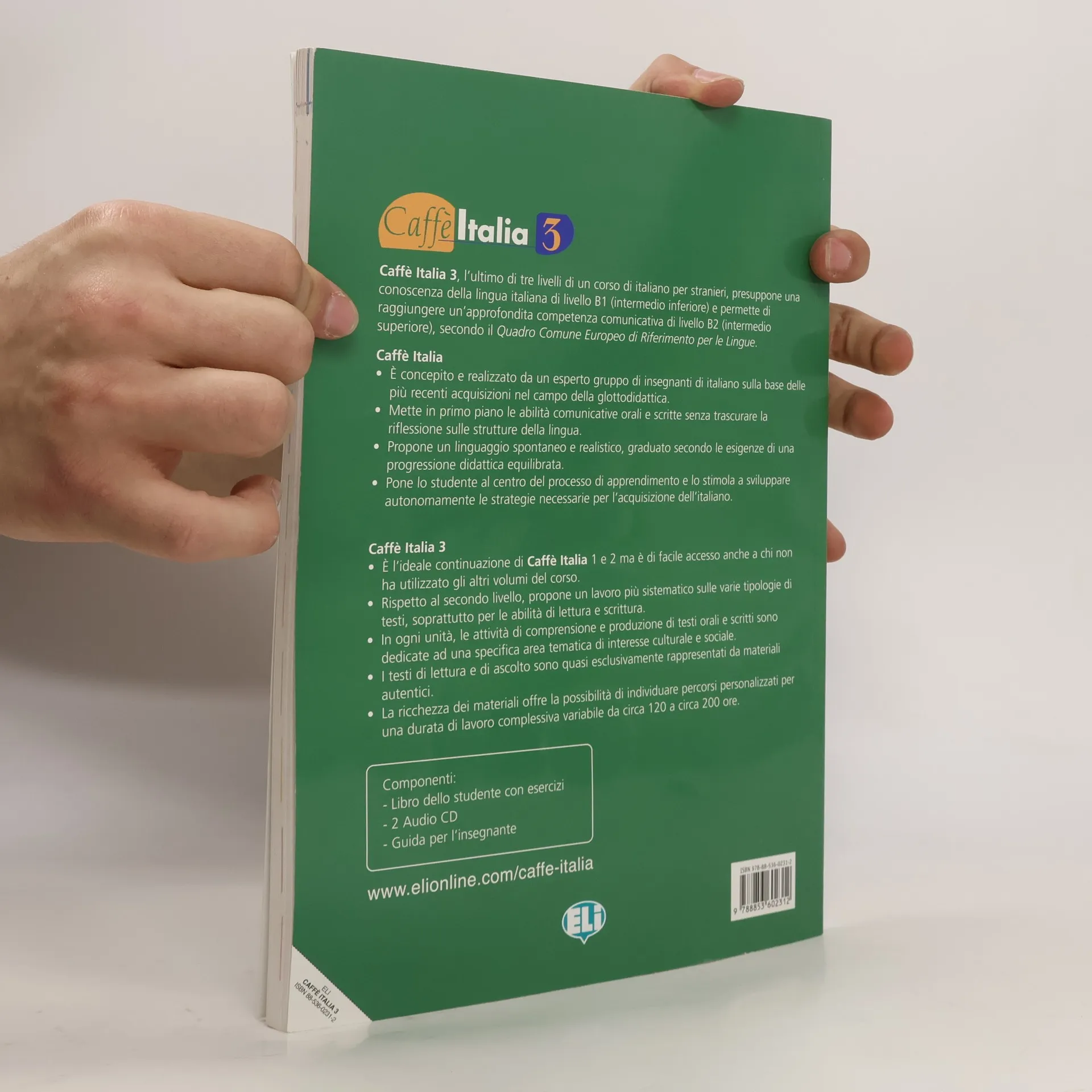 Caffé Italia 3, poslední ze tří dílů kurzu italštiny, předpokládá znalost jazyka na úrovni B1 a umožňuje dosažení velice dobré schopnosti komunikace v italštině na úrovni B2 dle Společného evropského referenčního rámce jazykových znalostí. Ideální je navázat na Caff� Italia 1 a 2, ovšem je velice snadné začít třetím dílem i když jste předchozí díly kurzu nepoužívali. Ve srovnání s druhým dílem předkládá systematičtější způsob práce s různými typy textů, především pro četbu a písemný projev. Aktivity procvičování porozumění, ústních a písemných testů se v každém oddíle věnují jednomu specifickému kulturnímu a společenskému tématu. Četbu i poslech představují skoro exkluzivní autentické materiály. Bohatost materiálů nabízí možnost individualizovat kurzy v celkovém počtu od 120 do 200 hodin. // Upozornění: Pokud na fotografii nejsou zobrazeny přílohy (CD, brožury, mapy apod.), pak tyto nejsou součástí.