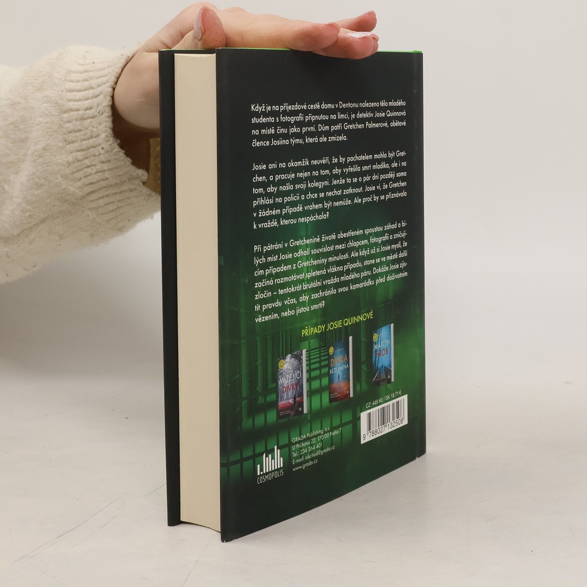 Když je na příjezdové cestě domu v Dentonu nalezeno tělo mladého studenta s fotografií připnutou na límci, je detektiv Josie Quinnová na místě činu jako první. Dům patří Gretchen Palmerové, obětavé člence Josiina týmu, která ale zmizela. Josie ani na okamžik neuvěří, že by pachatelem mohla být Gretchen, a pracuje nejen na tom, aby vyřešila smrt mladíka, ale i na tom, aby našla svoji kolegyni. Jenže ta se o pár dní později sama přihlásí na policii a chce se nechat zatknout. Josie ví, že Gretchen v žádném případě vrahem být nemůže. Ale proč by se přiznávala k vraždě, kterou nespáchala? Při pátrání v Gretchenině životě obestřeném spoustou záhad a bílých míst Josie odhalí souvislost mezi chlapcem, fotografií a zničujícím případem z Gretcheniny minulosti. Ale když už si Josie myslí, že začíná rozmotávat spletená vlákna případu, stane se ve městě další zločin – tentokrát brutální vražda mladého páru. Dokáže Josie zjistit pravdu včas, aby zachránila svou kamarádku před doživotním vězením, nebo jistou smrtí?