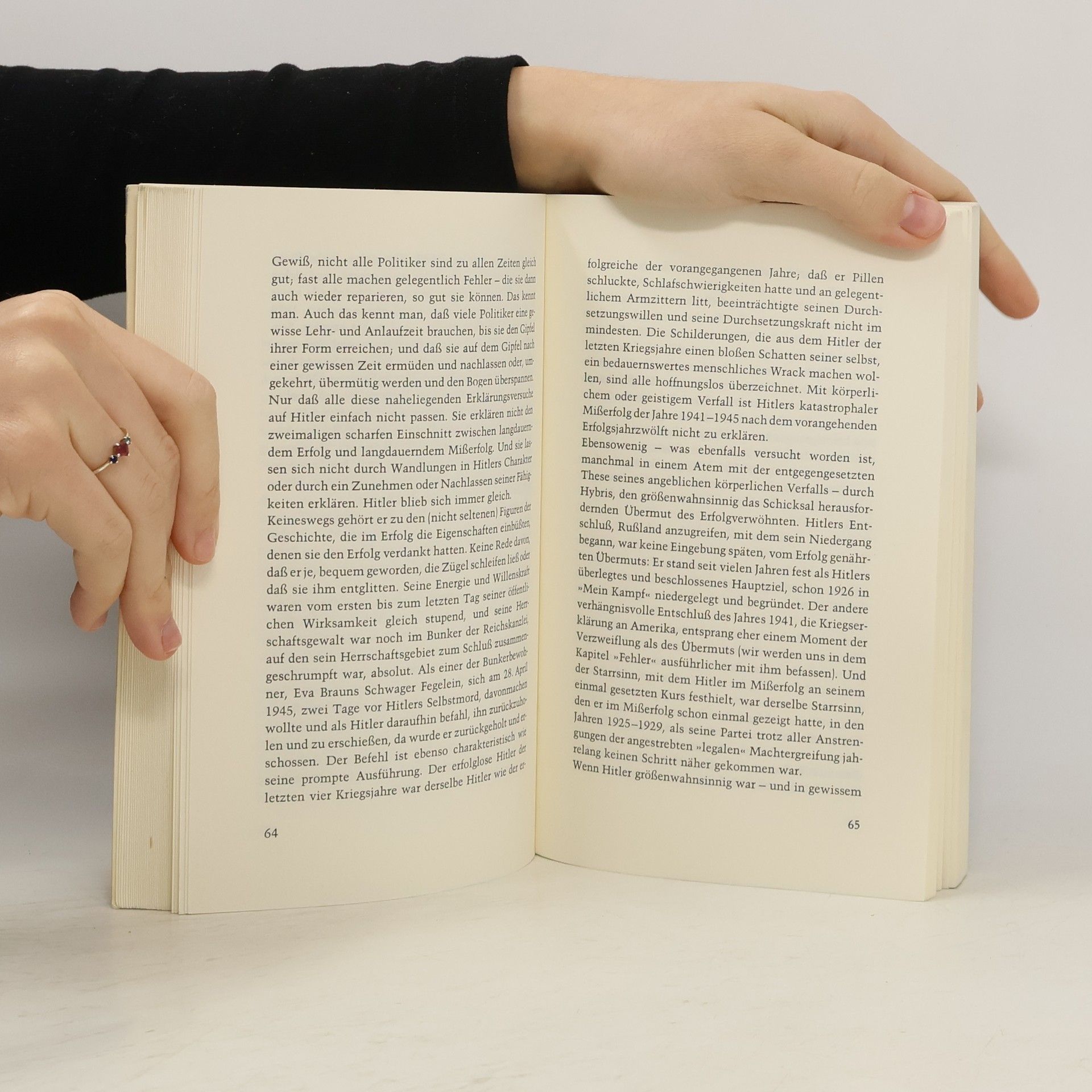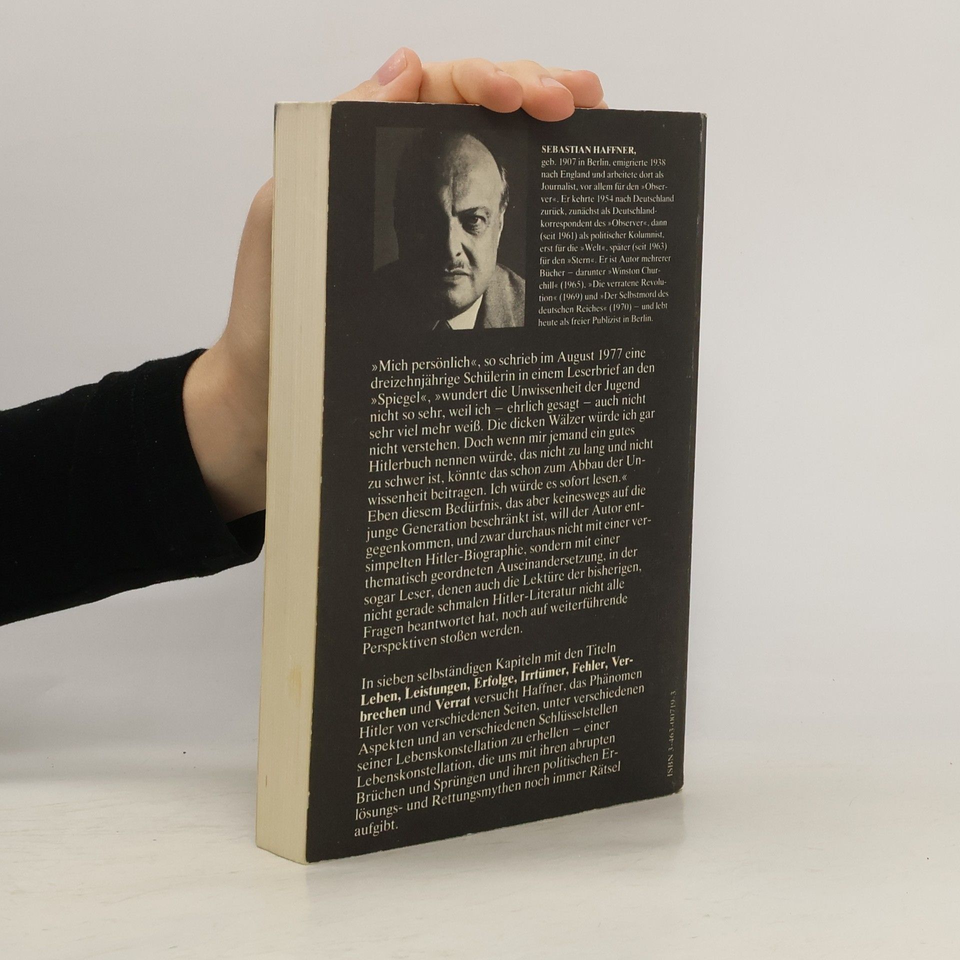 „Adolf Hitlers Vater war ein Aufsteiger. (...) Der Sohn begann als Absteiger.“ Mit diesen Worten beginnt Sebastian Haffners eindringliches und für seine Originalität sowie Klarsicht gerühmtes Werk über Hitler. Dieses 1978 erschienene Buch hat bis heute nichts von seiner Bedeutung verloren und leistet einen wesentlichen Beitrag zum Verständnis der deutschen Vergangenheit und Gegenwart. Haffner, als einer der originellsten Publizisten der deutschen Nachkriegspresse bekannt, wurde durch dieses Buch weltberühmt. Sein Verdienst liegt darin, Hitler unverstellt zu betrachten. Die Kapitelüberschriften – „Leben“, „Leistungen“, „Erfolge“, „Irrtümer“, „Fehler“, „Verbrechen“, „Verrat“ – zeugen von dieser Herangehensweise. Haffner zeigt, dass der Verlauf der Geschichte nicht zwangsläufig in eine Katastrophe mündet, sondern von Menschen und Persönlichkeiten beeinflusst wird, sowohl im Guten als auch im Bösen. Für alle, die das Buch noch nicht kennen oder es erneut lesen möchten, sei die Empfehlung Guido Knopps mit auf den Weg gegeben: „Der Vorteil dieses Buches liegt vor allem darin, dass es keine weitere Biographie ist. Auf 200 Seiten über Hitler zu schreiben, groß bedruckt und ohne Fußnoten, macht den Blick frei für Hauptsache und Hauptlinien. Das lädt ein zur sofortigen Gesamtlektüre.“