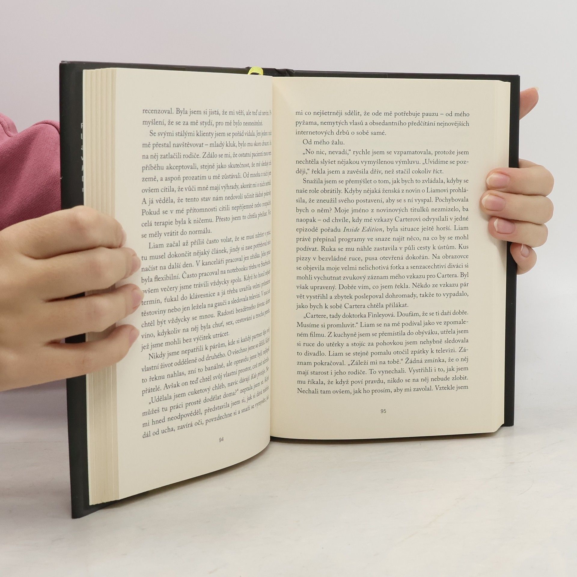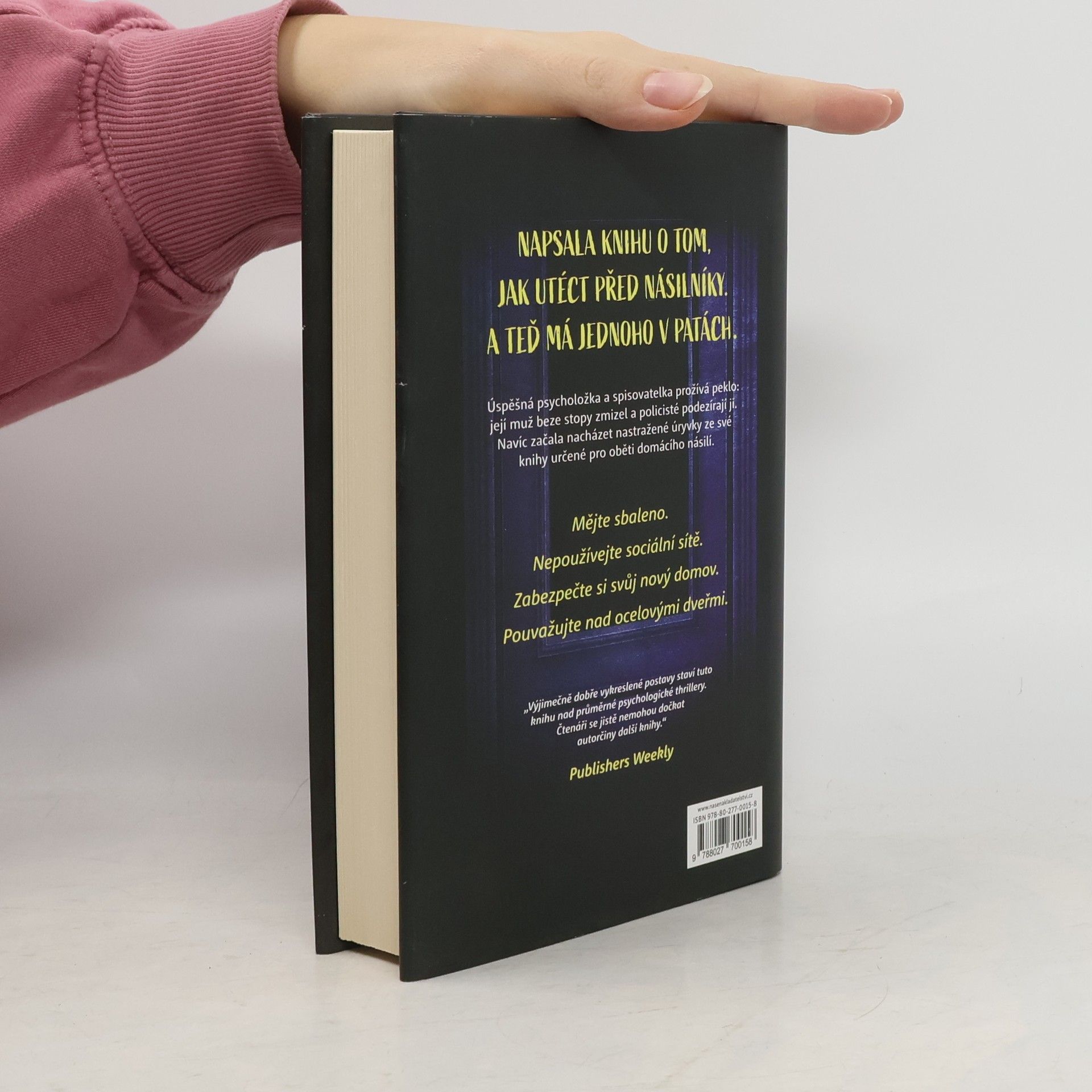 Psychologický thriller americké autorky vypráví děsuplný příběh o nenápadném, leč setrvalém naleptávání lidské psychiky až k úplnému zhroucení Napsala knihu o tom, jak utéct před násilníky. Teď ji jeden pronásleduje. Faith Finleyová má všechno: je talentovaná a úspěšná psycholožka, autorka bestsellerů a moderátorka vlastního rozhlasového pořadu Někdo poslouchá. Za manžela má pana Dokonalého – respektovaného kulinářského kritika Liama. Až do noci, kdy se všechno strašlivě pokazí a život Faith Finleyové se navždy změní. Liam zmizel beze stopy a policie začne podezřívat jeho ženu. A pak začnou přicházet výhrůžky. Vzkazy, které jsou vytržené z Faithiny vlastní knihy – té, jež pomáhá ženám opustit násilnické partnery. Vzkazy jako „Zamkněte okna. Zvažte koupi ocelových dveří.“ Výhrůžek přibývá a záhada kolem Liamova zmizení se prohlubuje. A na nalezení odpovědí bude záviset Faithin holý život.