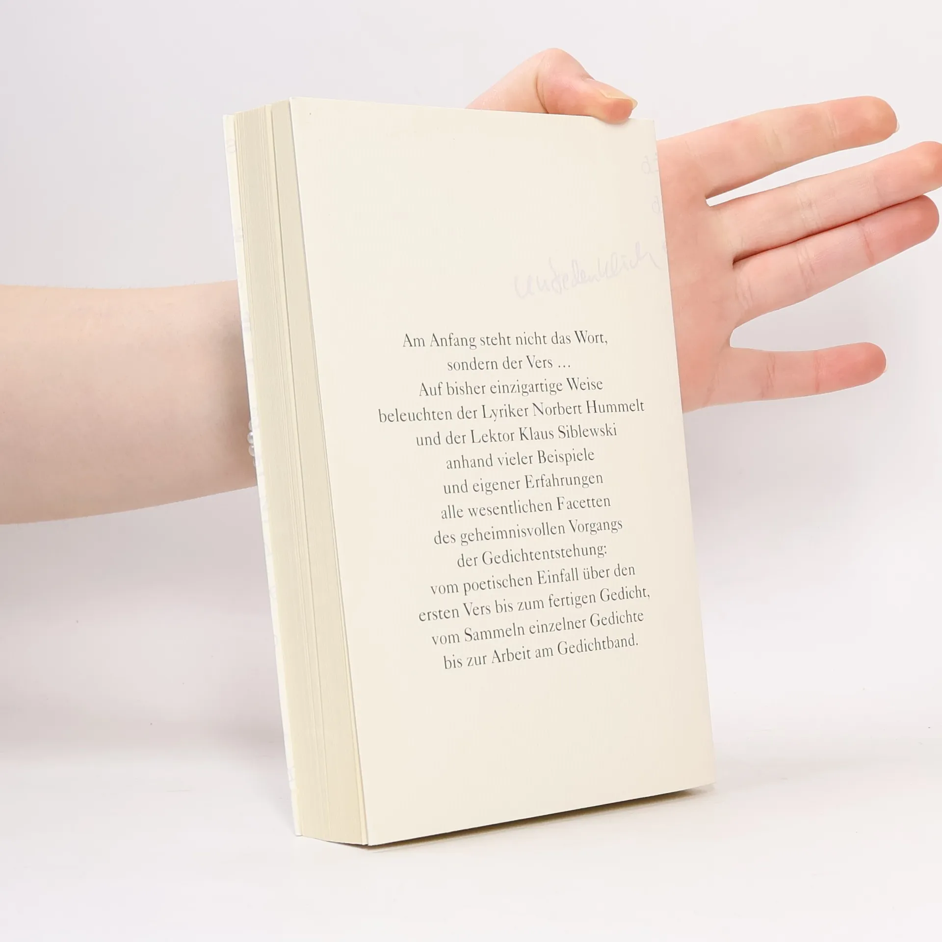 Ein Grundlagenwerk über das Entstehen von GedichtenVon der Einrichtung der Arbeitswerkstatt, den ersten poetischen Eingebungen über das Entwerfen und schließlich das Schreiben von Gedichten wird aus der Sicht des Autors Norbert Hummelt und der des Lektors Klaus Siblewski auf alle wichtigen Aspekte eingegangen, die beim Schreiben von Gedichten eine entscheidende Rolle spielen. Dieses Buch ist das erste in seiner Art zu einem Thema, das nicht nur Autoren interessiert, sondern alle Literatur- und Lyrikliebhaber.