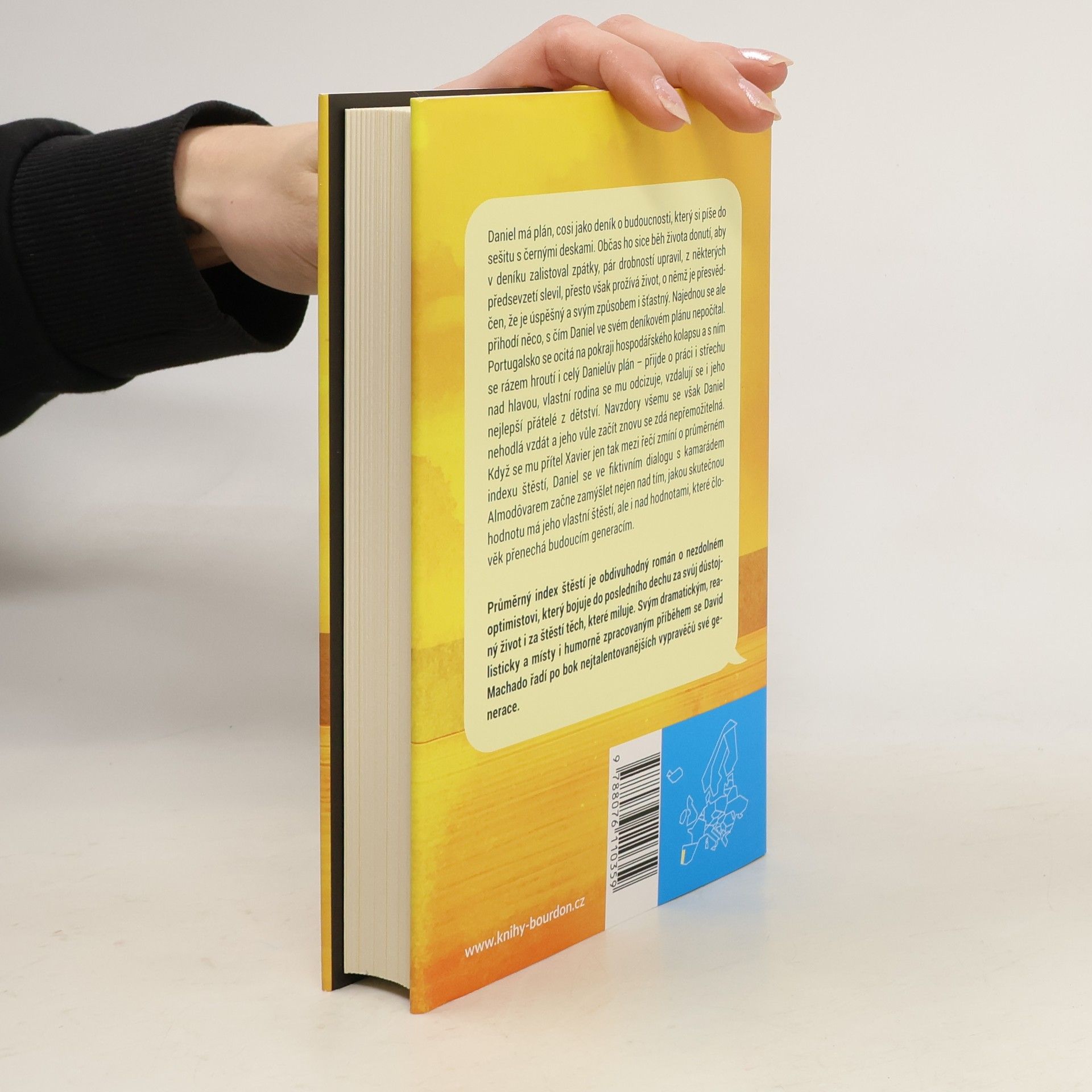 Daniel má plán, cosi jako deník o budoucnosti, který si píše do sešitu s černými deskami. Občas ho sice běh života donutí, aby v deníku zalistoval zpátky, pár drobností upravil, z některých předsevzetí slevil, presto však prožívá život, o němž je přesvědčen, že je úspěšný a svým způsobem i šťastný. Najednou se ale přihodí něco, s čím Daniel ve svém deníkovém plánu nepočítal. Portugalsko se ocitá na pokraji hospodářského kolapsu a s ním se rázem hroutí i celý Danielův plán – přijde o práci i střechu nad hlavou, vlastní rodina se mu odcizuje, vzdalují se i jeho nejlepší přátelé z dětství. Navzdory všemu se však Daniel nehodlá vzdát a jeho vůle začít znovu se zdá nepřemožitelná. Když se mu přítel Xavier jen tak mezi řečí zmíní o průměrném indexu štěstí, Daniel se ve fiktivním dialogu s kamarádem Almodôvarem začne zamýšlet nejen nad tím, jakou skutečnou hodnotu má jeho vlastní štěstí, ale i nad hodnotami, které člověk přenechá budoucím generacím. Průměrný index štěstí je obdivuhodný román o nezdolném optimistovi, který bojuje do posledního dechu za svůj důstojný život i za štěstí těch, které miluje. Svým dramatickým, realisticky a místy i humorně zpracovaným příběhem se David Machado řadí po bok nejtalentovanějších vypravěčů své generace.