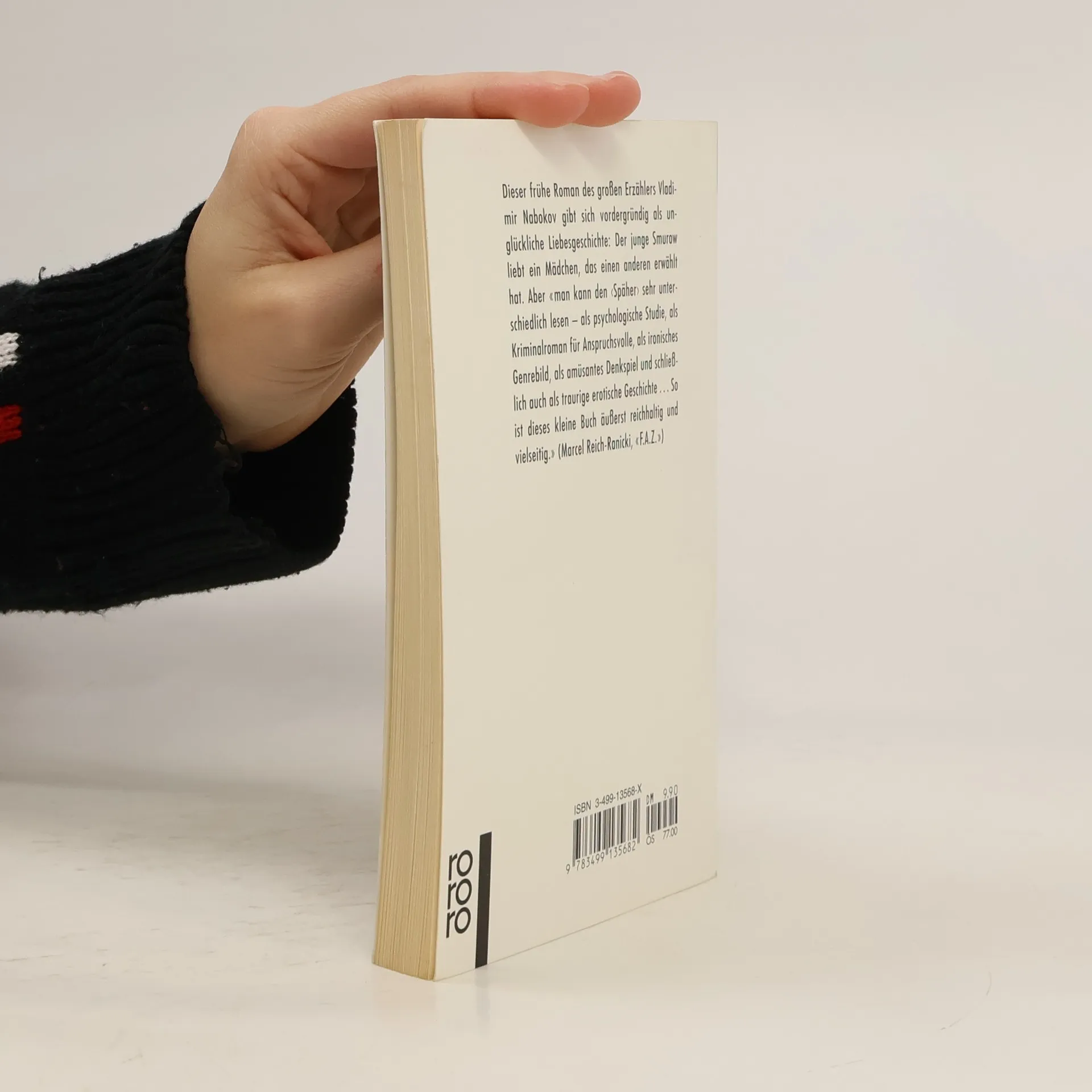 "Dieser frühe Roman des großen Erzählers Vladimir Nabokov gibt sich vordergründig als unglückliche Liebesgeschichte: Der junge Smurow liebt ein Mädchen, das einen anderen erwählt hat. Aber man kann den "Späher" sehr unterschiedlich lesen - als psychologische Studie, als Kriminalroman für Anspruchsvolle, als ironisches Genrebild, als amüsantes Denkspiel und schließlich auch als traurige erotische Geschichte... So ist dieses kleine Buch äußerst reichhaltig und vielseitig" (Marcel Reich-Ranicki, F.A.Z.)