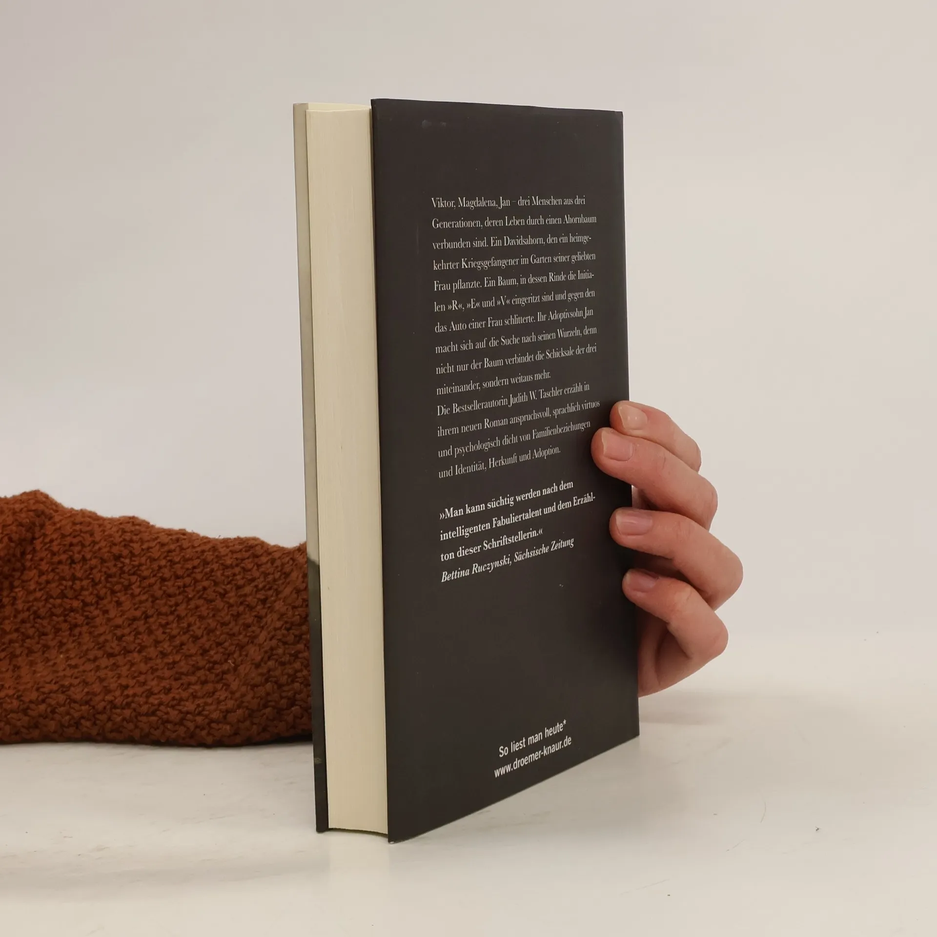 Nach dem viel rezensierten Spiegel-Bestseller „bleiben“ präsentiert die preisgekrönte Innsbrucker Autorin Judith W. Taschler einen neuen Roman, der literarisches Niveau mit unverwechselbarer Sprache verbindet. Christine Westermann, Literaturkritikerin, lobt die Autorin und ihre Schreibweise. Anspruchsvoll und psychologisch dicht behandelt Taschler in ihrem Werk Themen wie Familienbeziehungen, Identität und Adoption. Jan lebt sein Leben in vollen Zügen, hat jedoch Angst vor der Liebe. Nach dem tragischen Verlust seiner Mutter bei einem Autounfall mit achtzehn Jahren erhält er einen verstörenden Brief, der seine Identität und Herkunft infrage stellt. In seinem ersten Lebensjahr trug er den Namen David, benannt nach einem Mann, der aus der Kriegsgefangenschaft heimkehrte und seiner Frau einen Davidsahorn als Geschenk mitbrachte. Dieser Baum, gegen den das Auto seiner Mutter prallte, trägt die Initialen „R“, „E“ und „V“. Die Entdeckungen über seine Herkunft und Familiengeschichte werden von Taschler mehrstimmig und sprachlich virtuos erzählt, geprägt von ihrer unaufgeregten Empathie.