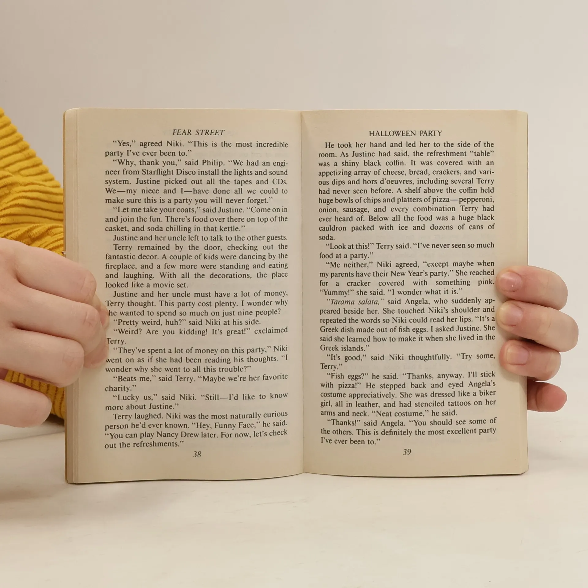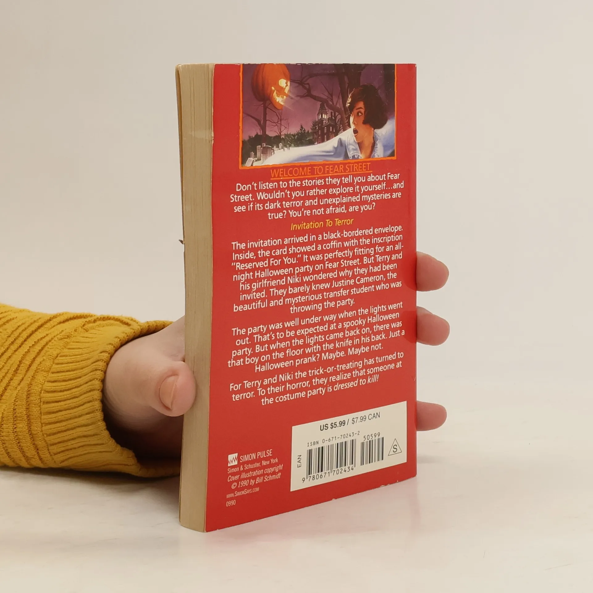 Welcome to Fear Street. Don’t listen to the stories they tell you about Fear Street. Wouldn’t you rather explore it yourself…and see if its dark terror and unexplained mysteries are true? You’re not afraid, are you? Invitation to Terror The invitation arrived in a black-bordered envelope. Inside, the card showed a coffin with the inscription “Reserved For You.” It was perfectly fitting for an all-night Halloween party on Fear Street. But Terry and his girlfriend Niki wondered why they had been invited. They barely knew Justine Cameron, the beautiful and mysterious transfer student who was throwing the party. The party was well under way when the lights went out. That’s to be expected at a spooky Halloween party. But when the lights come back on, there was that boy on the floor with the knife in his back. Just a Halloween prank? Maybe. Maybe not. For Terry and Niki the trick-or-treating has turned to terror. To their horror, they realize that someone at the costume party is dressed to kill!