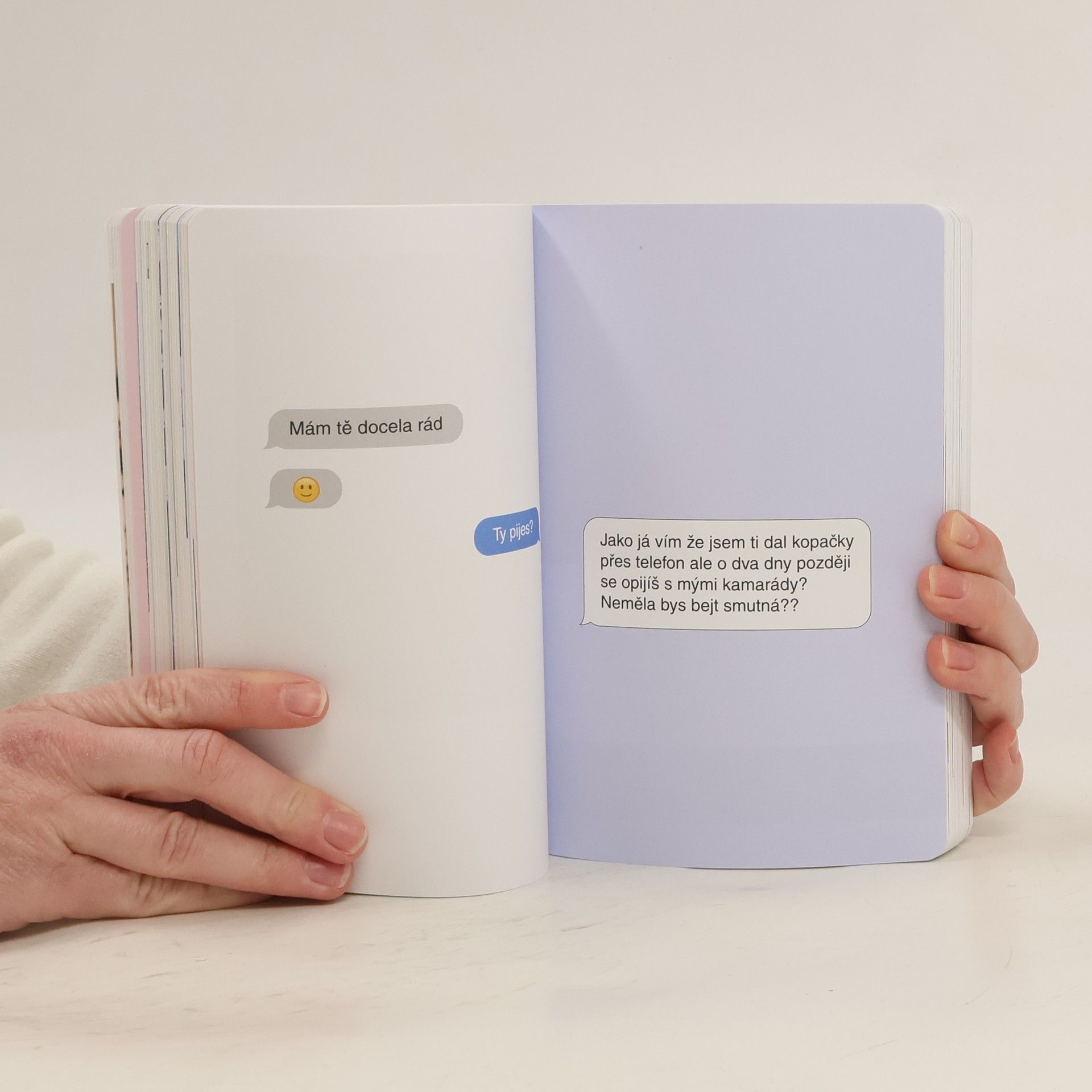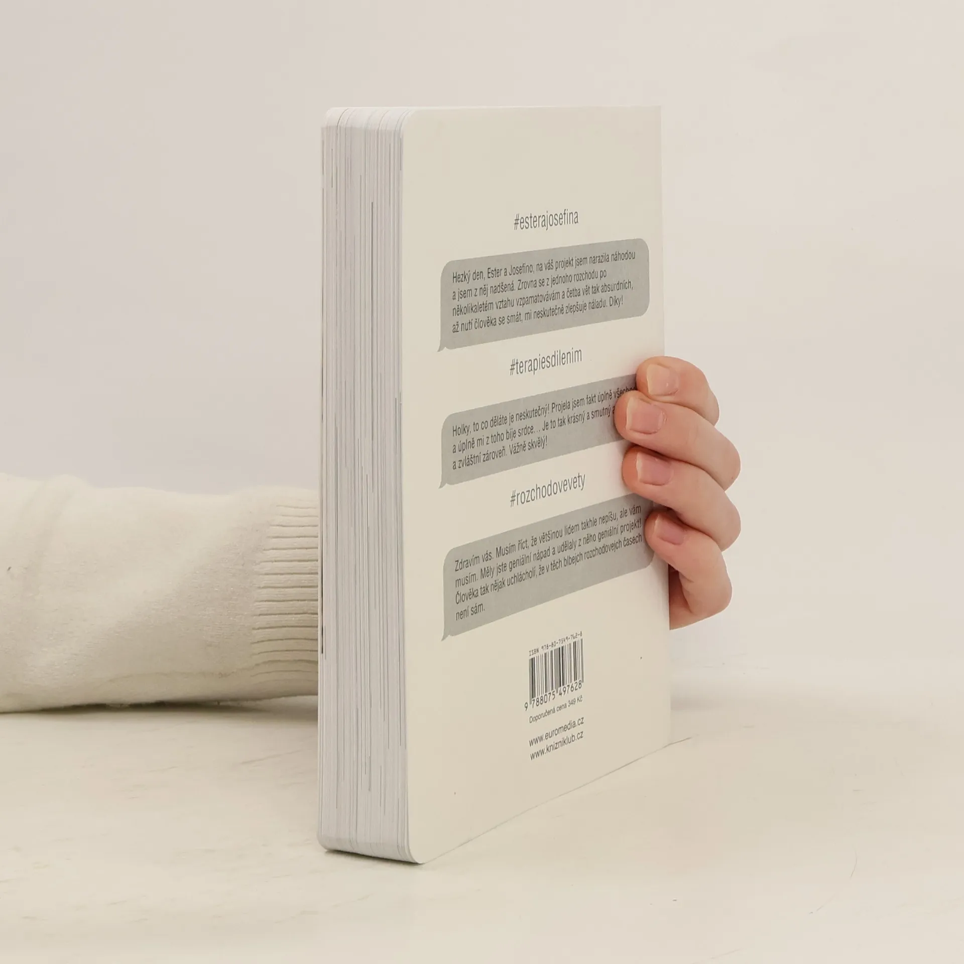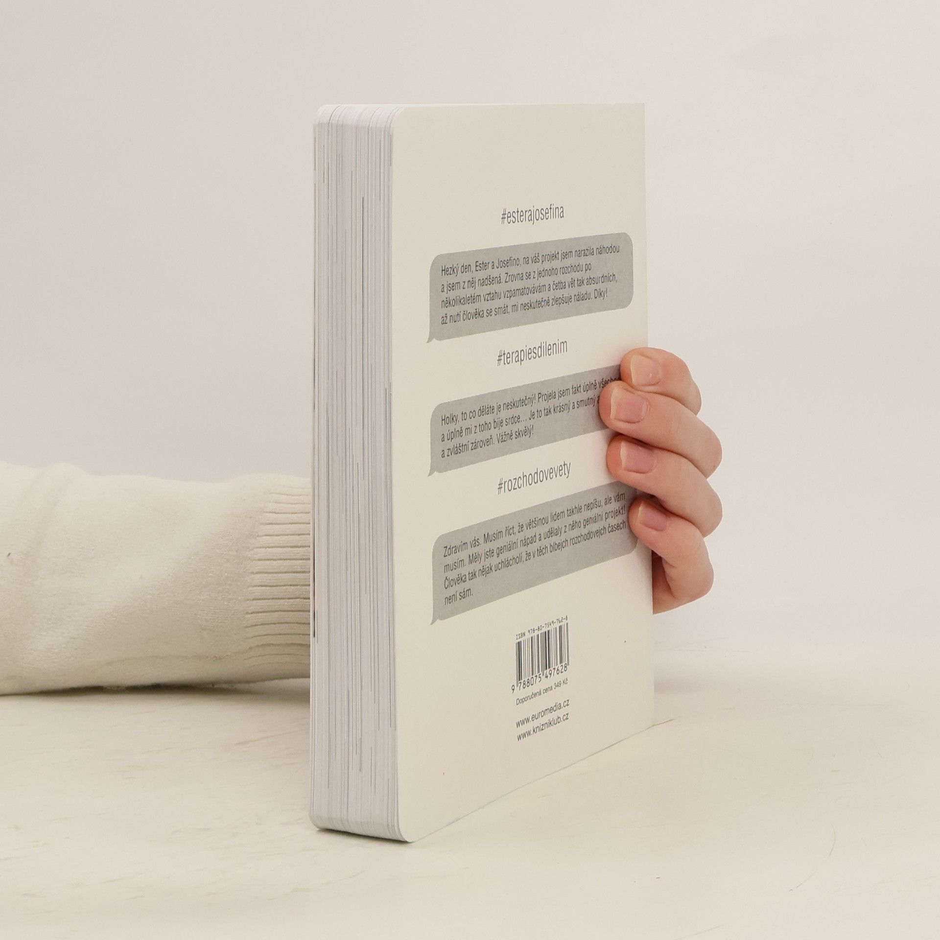 Za projektem Terapie sdílením, aktuální internetovou senzací, stojí kreativní dvojice Ester Geislerová a Josefina Bakošová. Před několika měsíci vystavily na svých sociálních sítích několik mrazivých, a zároveň cynický úsměv vzbuzujících vět, kterými se jistý muž rozešel s jejich kamarádkou. Toto malé gesto spustilo lavinu; během následujících týdnů jim čtenáři začali posílat své rozchodové věty a hashtag „terapie sdilenim“ se stal doslova kultovním. Kniha je věrným obrazem autentického prostředí internetových chatů a messengerů, kde se dnes tak často odehrávají trpké konce vztahů. Sebrané věty fungují opravdu jako svébytná terapie; při četbě a úlevném smíchu si člověk rád připomene, že tak zle na tom přece jen ještě není. Kniha je doplněna texty obou autorek, esejí mediálního teoretika Tomáše Dvořáka, osobními fotkami, vzkazy a dalšími materiály Ester a Josefiny.