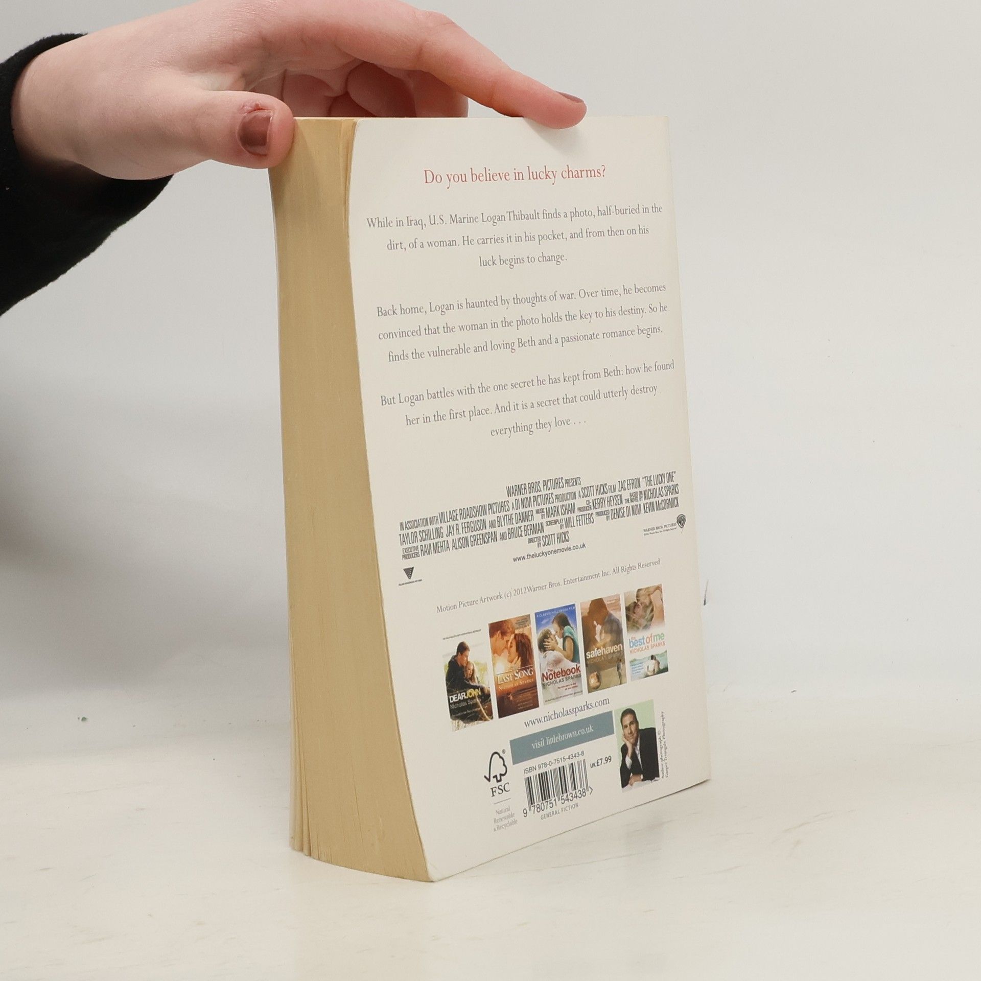 Do you believe in lucky charms? While in Iraq, U.S. Marine Logan Thibault finds a photo, half-buried in the dirt, of a woman. He carries it in his pocket, and from then on his luck begins to change. Back home, Logan is haunted by thoughts of war. Over time, he becomes convinced that the woman in the photo holds the key to his destiny. So he finds the vulnerable and loving Beth and a passionate romance begins. But Logan battles with the one secret he has kept from Beth: how he found her in the first place. And it is a secret that could utterly destroy everything they love . . .
