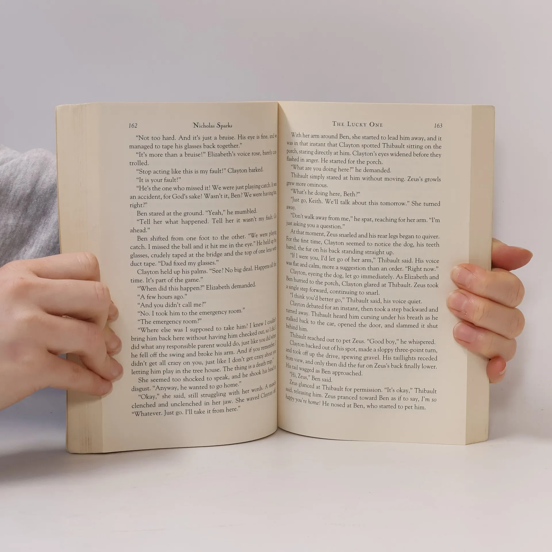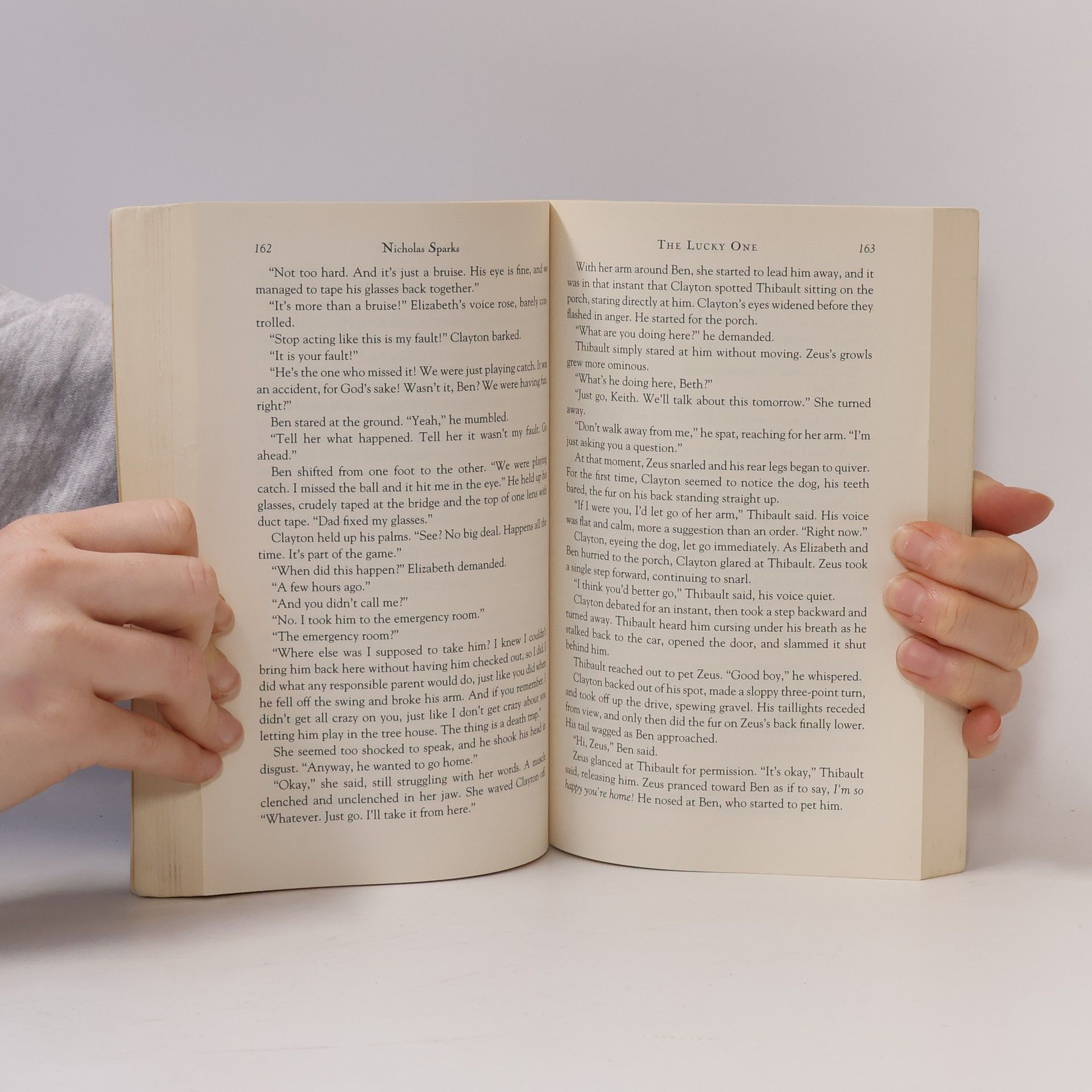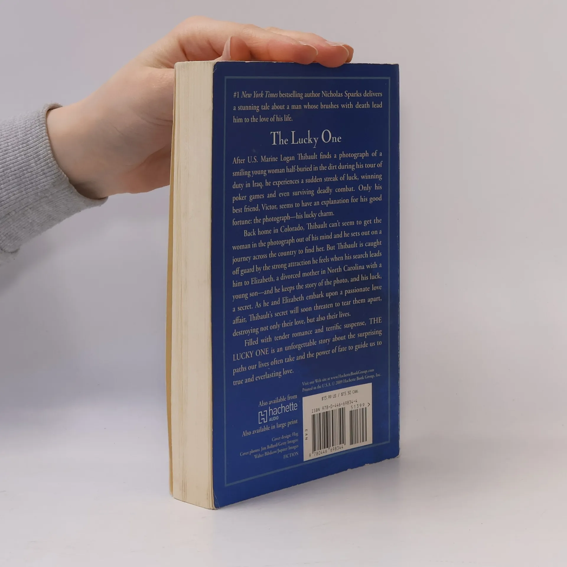 In his 14th book, bestselling author Nicholas Sparks tells the unforgettable story of a man whose brushes with death lead him to the love of his life. After U.S. Marine Logan Thibault finds a photograph of a smiling young woman buried in the dirt during his tour of duty in Iraq, he experiences a sudden streak of luck -- winning poker games and even surviving deadly combat. Only his best friend, Victor, seems to have an explanation for his good fortune: the photograph -- his lucky charm. Back home in Colorado, Thibault can't seem to get the woman in the photograph out of his mind and he sets out on a journey across the country to find her. But Thibault is caught off guard by the strong attraction he feels for the woman he encounters in North Carolina - Elizabeth, a divorced mother -- and he keeps the story of the photo, and his luck, a secret. As he and Elizabeth embark upon a passionate love affair, his secret soon threatens to tear them apart -- destroying not only their love, but also their lives. Filled with tender romance and terrific suspense, THE LUCKY ONE is an unforgettable story about the surprising paths our lives often take and the power of fate to guide us to true and everlasting love.
