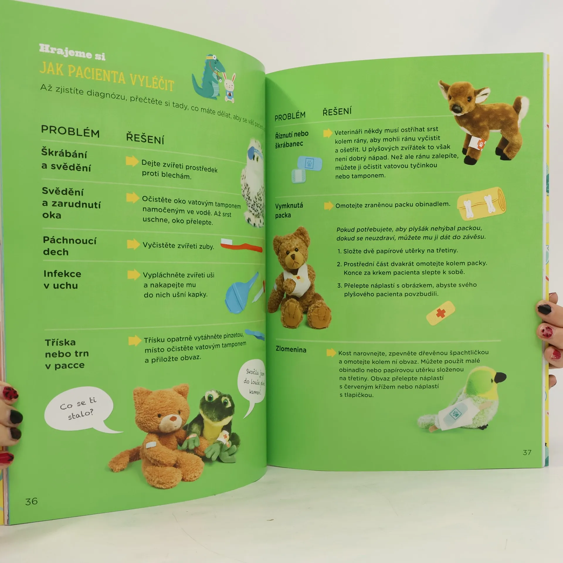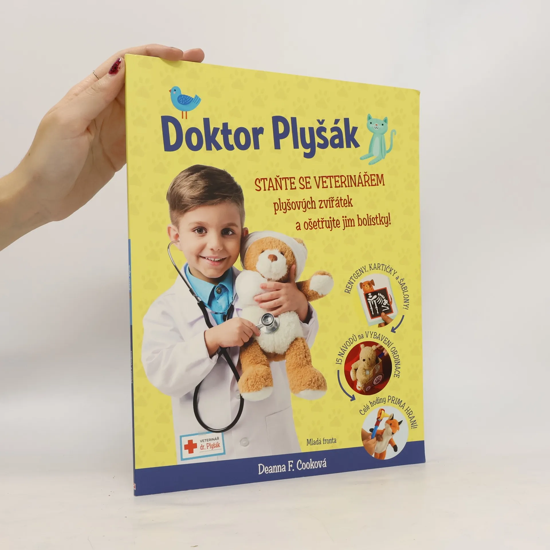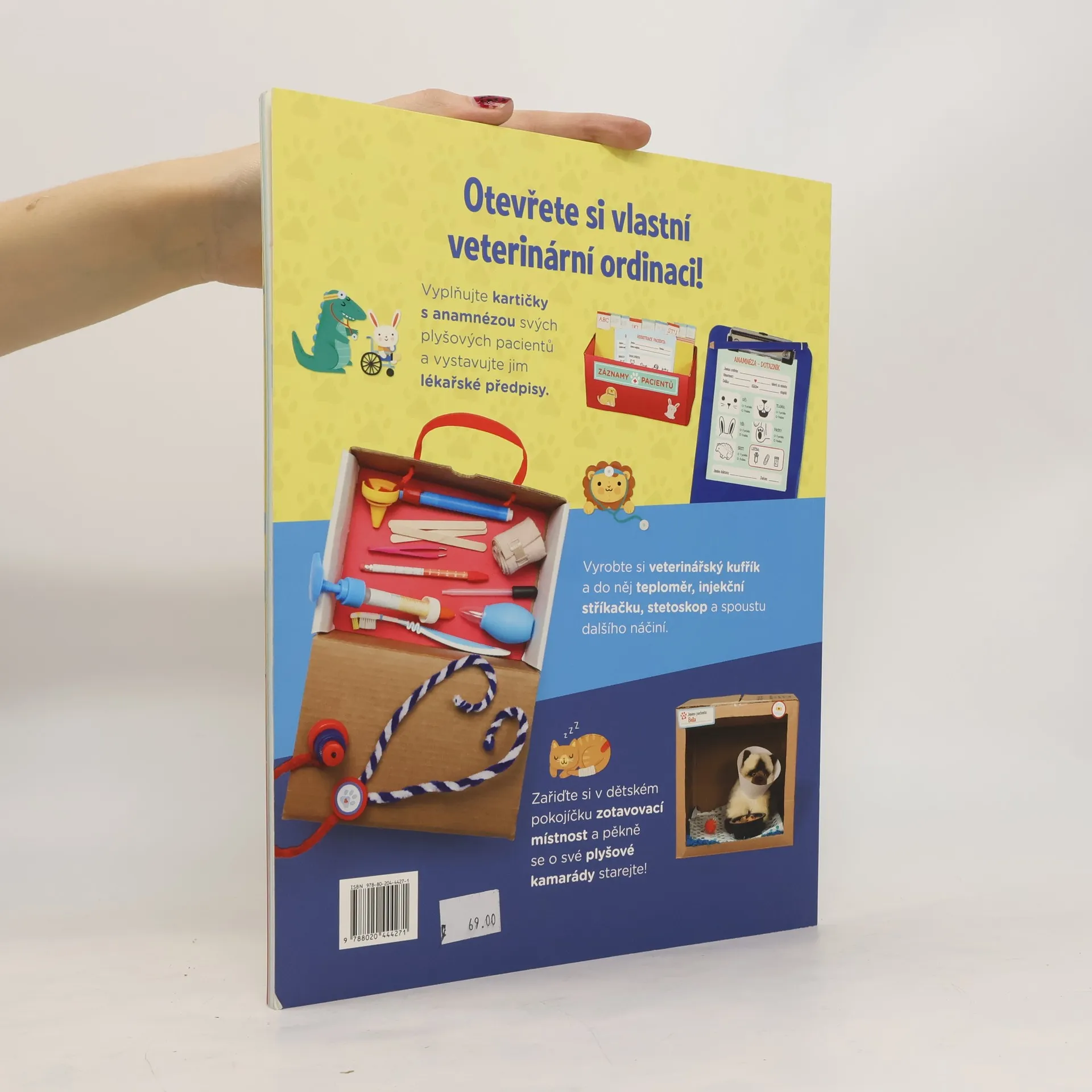 Otevřete si v pokojíku vlastní veterinární kliniku – zařiďte si čekárnu, ordinaci, zotavovací místnost i lékárnu – a ošetřujte svým plyšovým kamarádům bolístky! Dozvíte se, jak zavázat zraněnou packu plyšové kočičce, jak si správně poslechnout srdce plyšového medvěda a jak z rentgenu zjistit, jestli váš oblíbený plyšový pes nemá zlomenou nohu. Díky 15 projektům si vyrobíte třeba lékařský plášť, brýle, stetoskop, teploměr, injekční stříkačku, doktorský kufřík nebo ochranný límec pro zvířátka. Potřebovat k tomu budete pouze pár doma běžně dostupných věcí. Šablony, cedule, etikety a kartičky jsou součástí knížky!