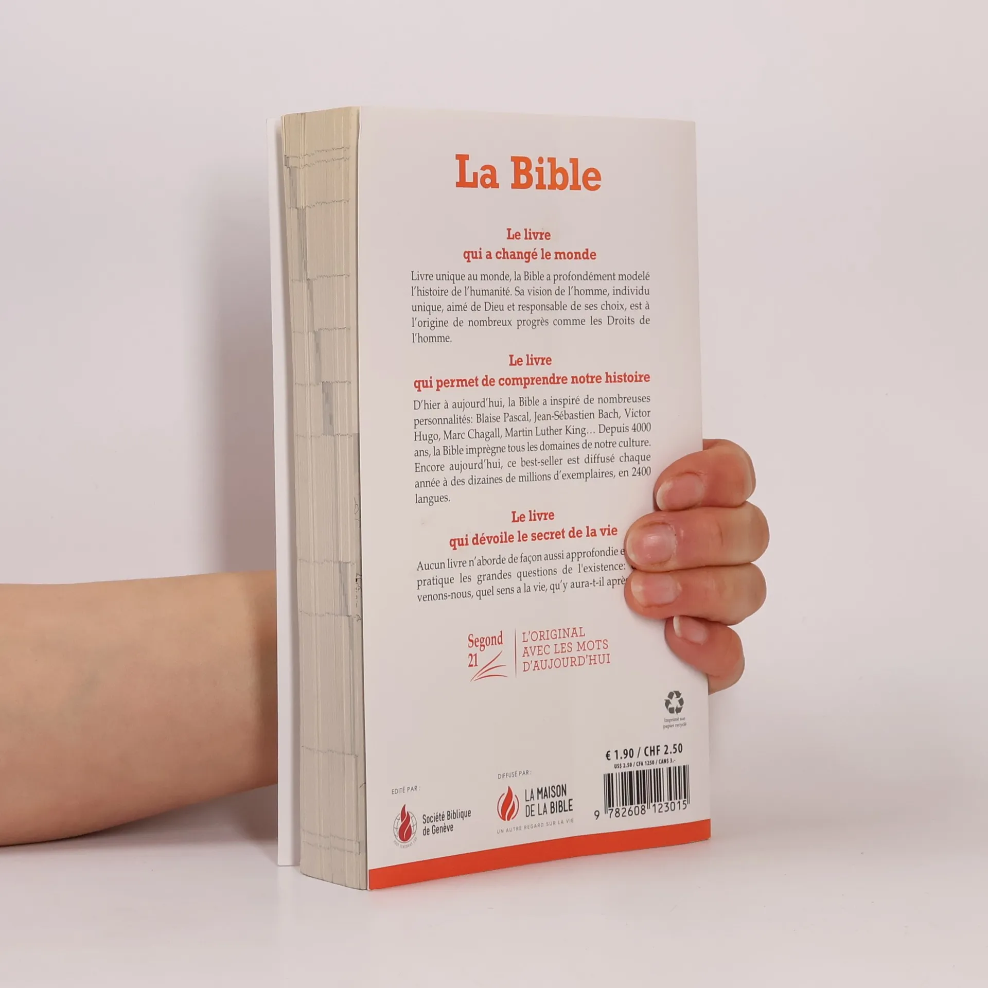 Le livre qui a changé le monde. Livre unique au monde, la Bible a profondément modelé l'histoire de l'humanité. Sa vision de l'homme, individu unique, aimé de Dieu et responsable de ses choix, est à l'origine de nombreux progrès comme les Droits de l'homme.Le livre qui permet de comprendre notre histoire.D'hier à aujourd'hui, la Bible a inspiré de nombreuses personnalités: Blaise Pascal, Jean-Sébastien Bach, Victor Hugo, Marc Chagall, Martin Luther King ... Depuis 4000 ans, la Bible imprègne tous les domaines de notre culture. Encore aujourd'hui, ce best-seller est diffusé chaque année à des dizaines de millions d'exemplaires, en 2400 langues. Le livre qui dévoile le secret de la vie.Aucun livre n'aborde de façon aussi approfondie et aussi pratique que les grandes questions de l'existence: d'où venons-nous, quel sens a la vie, qu'y aura-t-il après?