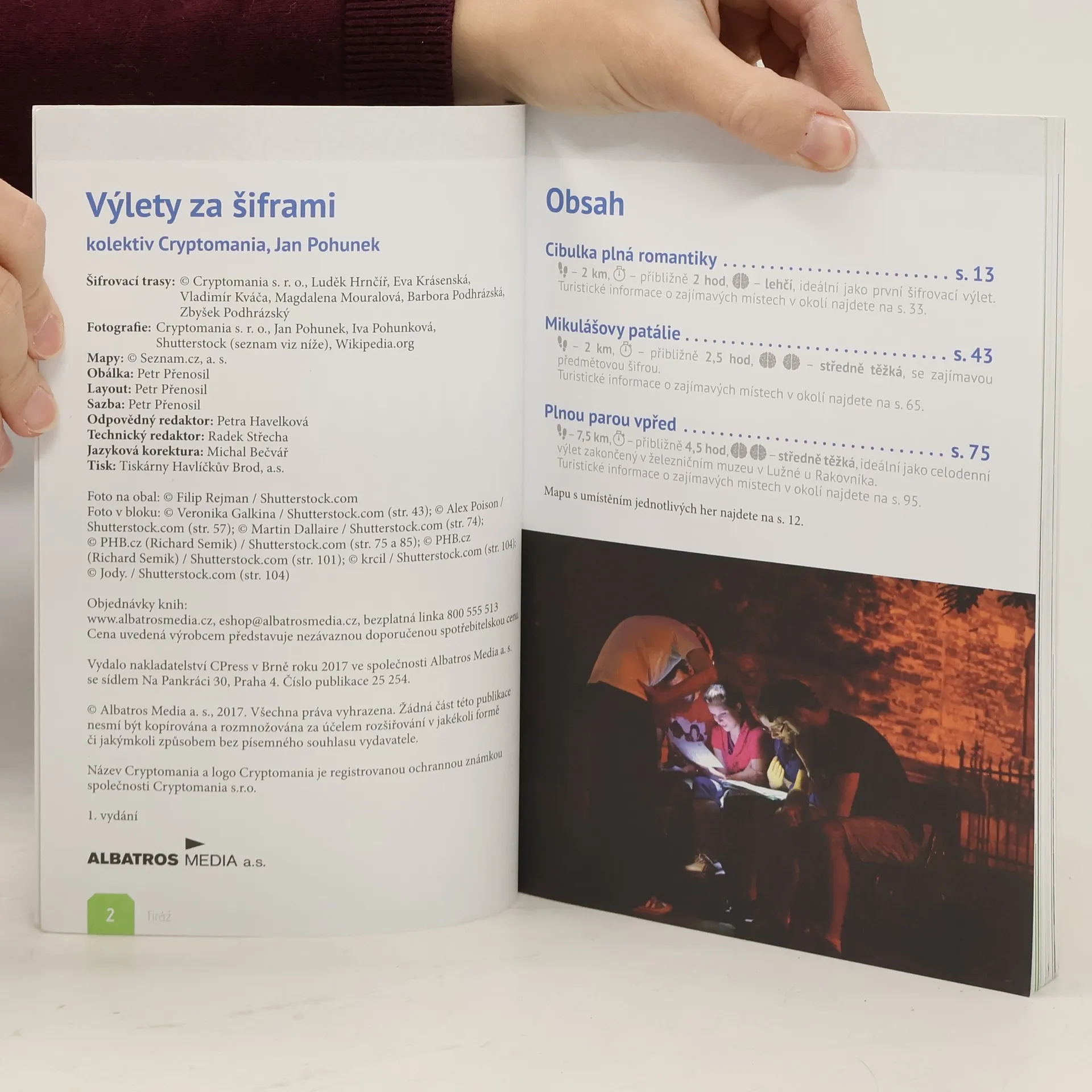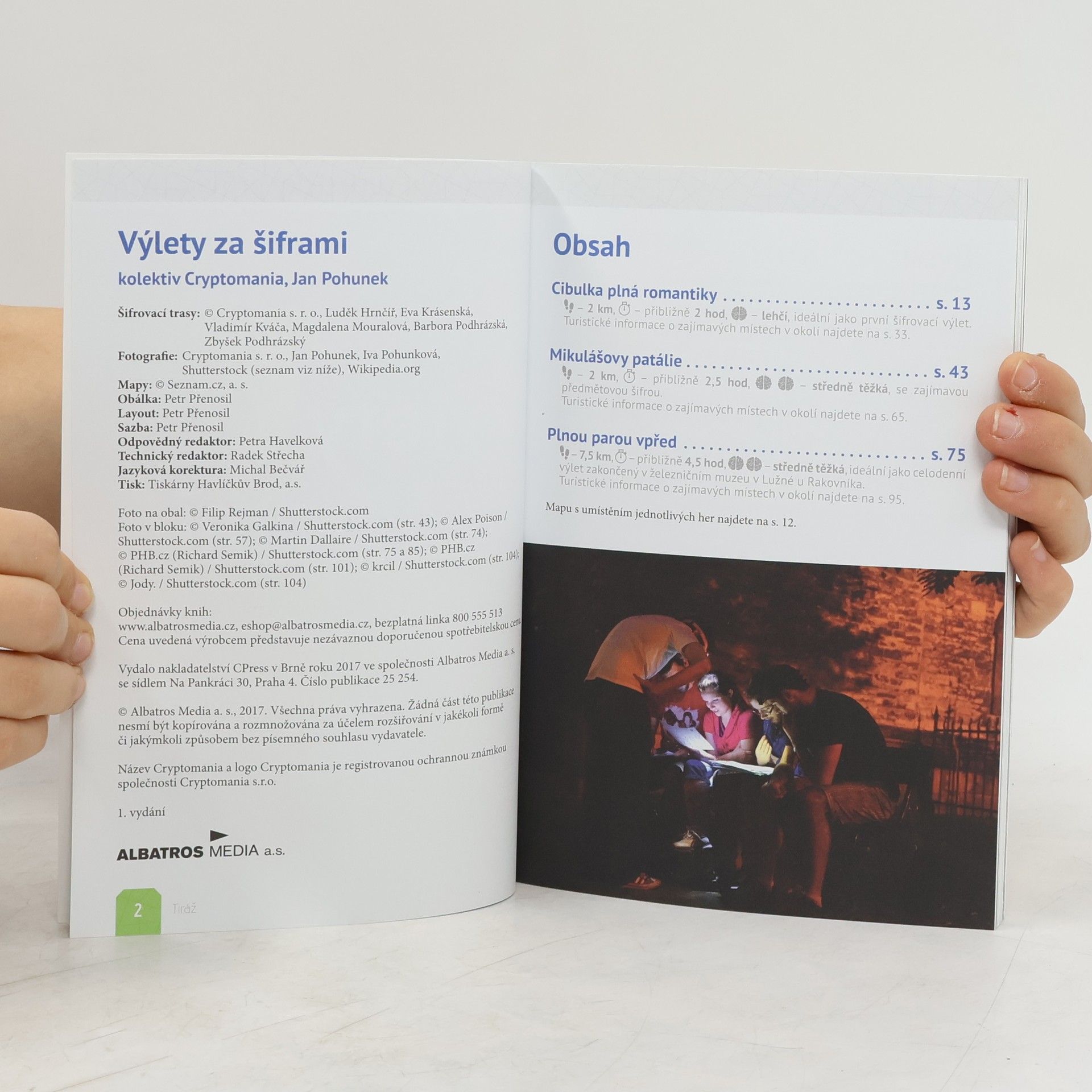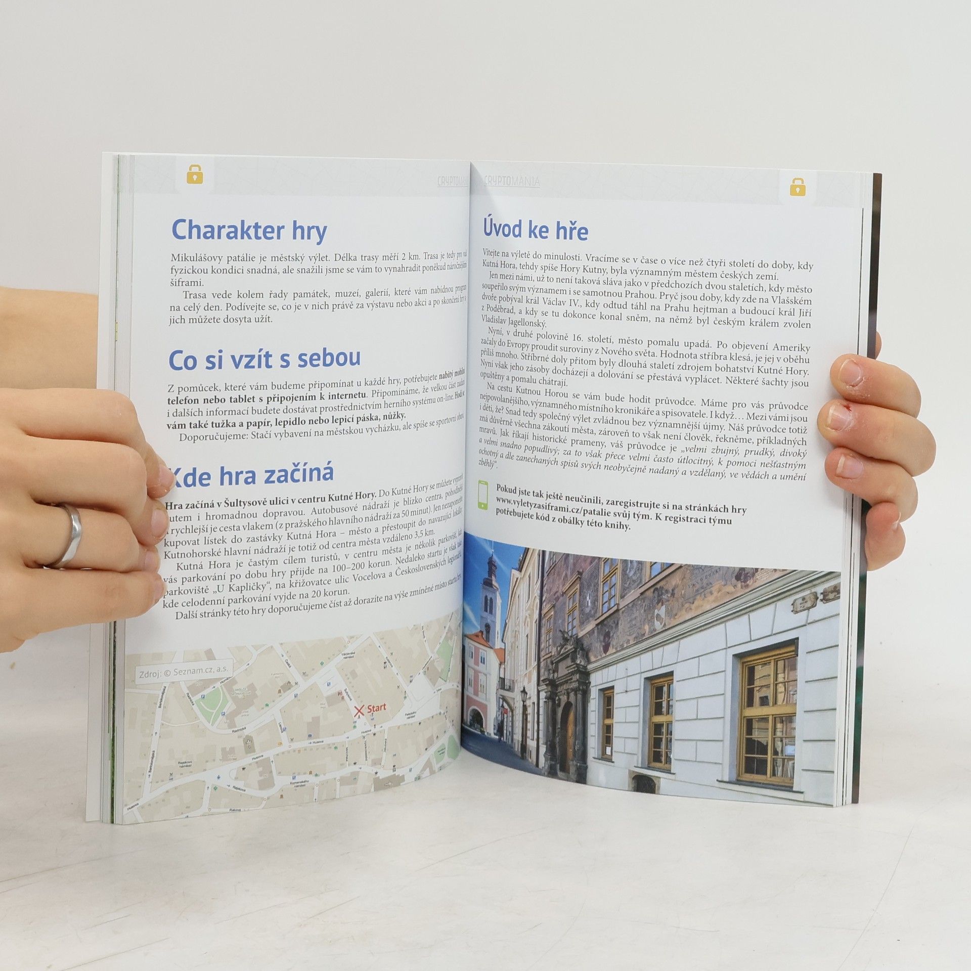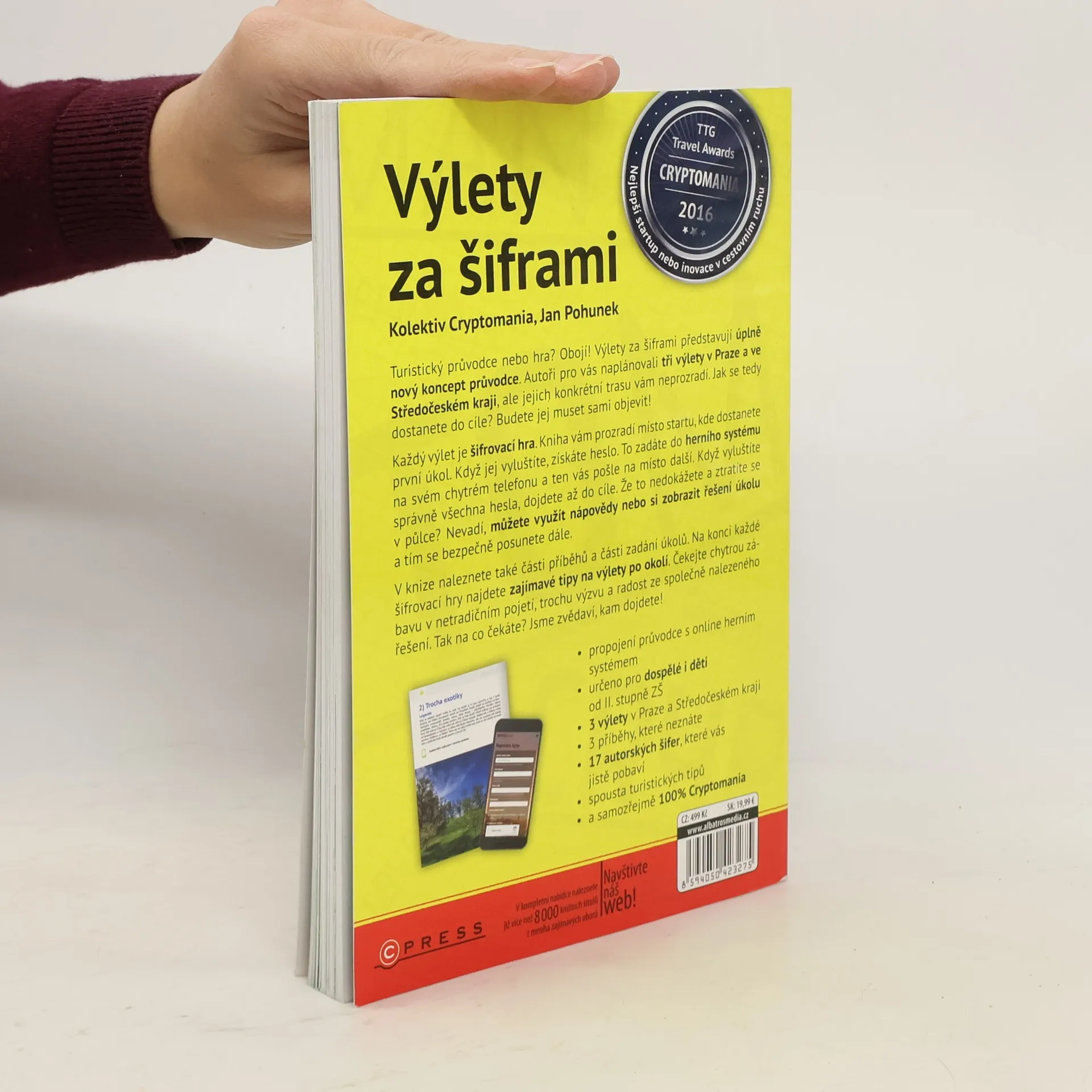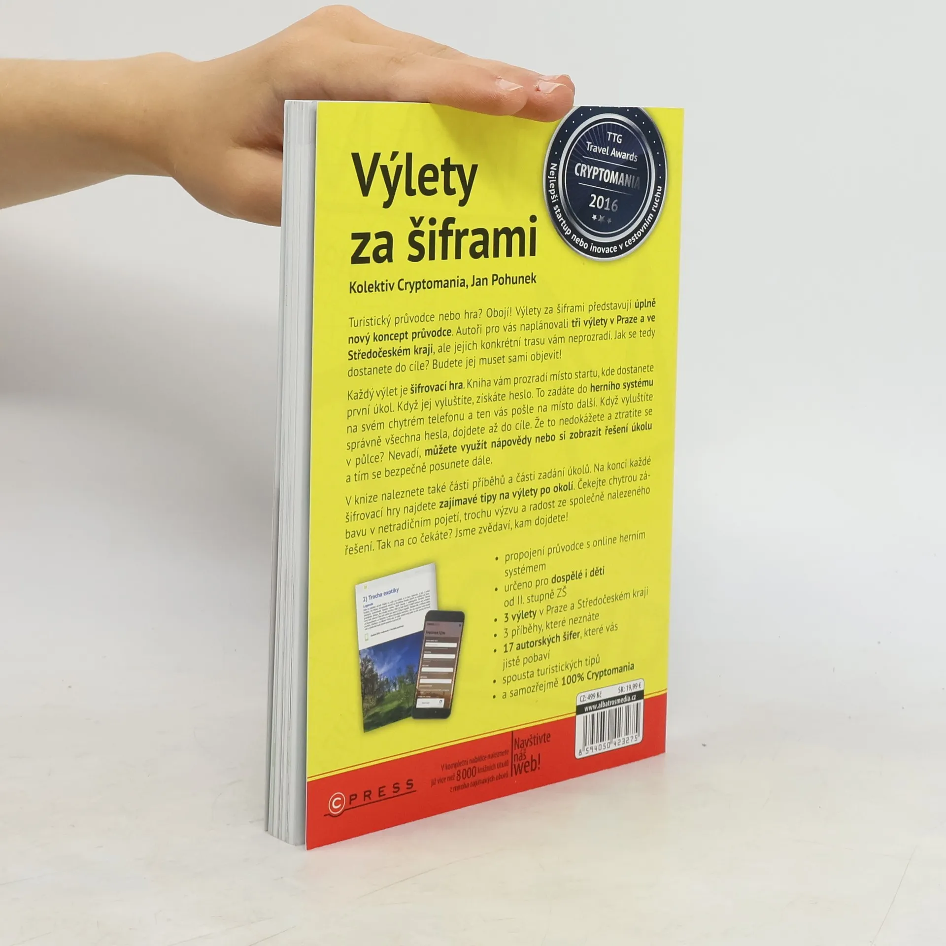 Turistický průvodce, nebo hra? Obojí! Výlety za šiframi představují úplně nový koncept průvodce. Autoři pro vás naplánovali tři výlety v Praze a ve Středočeském kraji, ale jejich konkrétní trasu vám neprozradí. Ptáte se, jak tedy dojdete do cíle? Budete jej muset sami objevit! Každý výlet je hra. Šifrovací hra. Kniha vám prozradí pouze místo startu, kde dostanete první úkol. Když jej vyluštíte, získáte heslo. To zadáte do herního systému na svém chytrém telefonu a ten vás pošle na další místo. Když vyluštíte správně všechna hesla, dojdete až do cíle. Že to nedokážete a ztratíte se v půlce? I na to hra myslí: Můžete využít nápovědy nebo si zobrazit řešení úkolu, a tím se bezpečně posunete dále. V knize kromě místa startu tras naleznete části příběhů a části zadání úkolů. Na konci každé šifrovací hry najdete zajímavé tipy na výlety po okolí. Jak těžké jsou šifry a úkoly, které na vás v rámci výletu čekají? Náročnost jsme zvolili takovou, aby si kromě dospělých poradily se šiframi a úkoly i děti od druhého stupně ZŠ. Čekejte chytrou zábavu v netradičním pojetí, trochu výzvu, úžas z toho, když přijdete na princip řešení šifry, a radost ze společně nalezeného řešení. Tak na co čekáte? Jsme zvědaví, kam dojdete! * 3 výlety v Praze a Středočeském kraji * 3 příběhy, které neznáte * 17 autorských šifer, které vás jistě pobaví * spousta turistických tipů * a samozřejmě 100% Cryptomania