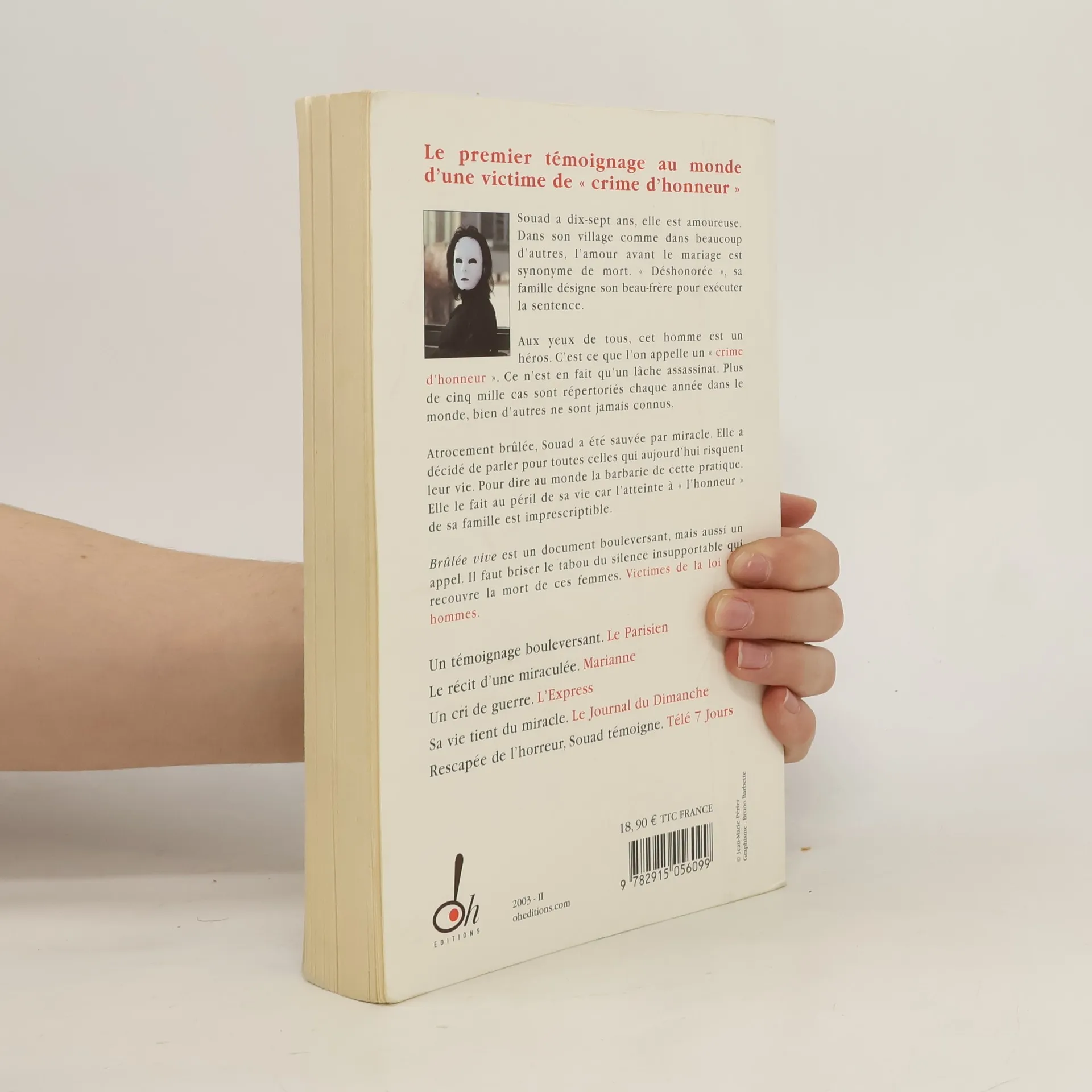 Le premier témoignage au monde d'une victime de " crime d'honneur ". Souad a dix-sept ans, elle est amoureuse. Dans son village comme dans beaucoup d'autres, l'amour avant le mariage est synonyme de mort. " Déshonorée ", sa famille désigne son beau-frère pour exécuter la sentence. Enfermée dans la chambre voisine, Souad a entendu la condamnation. Le lendemain, elle est en train de laver du linge dans la cour de sa maison. Son beau-frère approche, elle est terrifiée, il l'asperge d'essence, il craque une allumette, elle est brûlée vive. Aux yeux de tous, cet homme est un héros. C'est ce que l'on appelle un " crime d'honneur ". Ce n'est en fait qu'un lâche assassinat. L'exécutant ne risque rien, il n'est presque jamais poursuivi, encore plus rarement condamné. Plus de cinq mille cas sont répertoriés chaque année dans le monde, bien d'autres ne sont jamais connus. Atrocement brûlée, Souad a été sauvée par miracle. Elle a décidé de parler pour toutes celles qui aujourd'hui risquent leur vie. Pour dire au monde la barbarie de cette pratique. Elle le fait au péril de sa vie car l'atteinte à " l'honneur " de sa famille est imprescriptible. Brûlée vive est un témoignage bouleversant, mais aussi un appel. Il faut briser le tabou du silence insupportable qui recouvre la mort de ces femmes. Victimes de la loi des hommes.