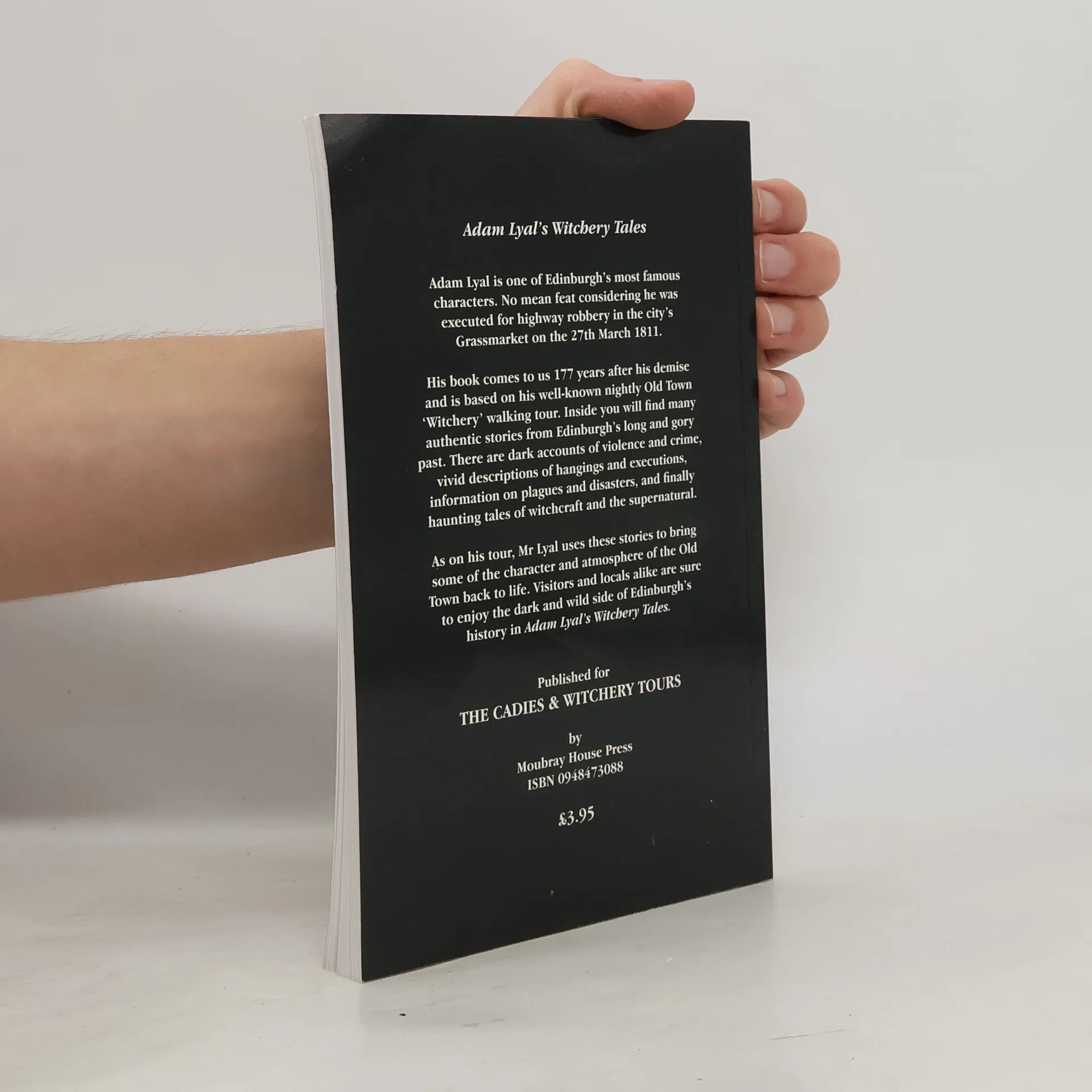 Adam Lyal is fast becoming one of Edinburgh's most famous characters. No mean feat considering he was executed for highway robbery in the city's Grassmarket on the 27th March 1811.His book comes to us 177 years after his demise and is based on his well-known nightly Old Town 'Witchery' walking tour. Inside you will find many authentic stories from Edinburgh's long and gory past. There are dark accounts of violence and crime, vivid descriptions of hangings and executions, information on plagues and disasters, and finally haunting tales of witchcraft and the supernatural.As on his tour, Mr Lyal uses these stories to bring some of the character and atmosphere of the Old Town back to life. Visitors and locals alike are sure to enjoy the dark and wild side of Edinburgh's history in Adam Lyal's Witchery Tales