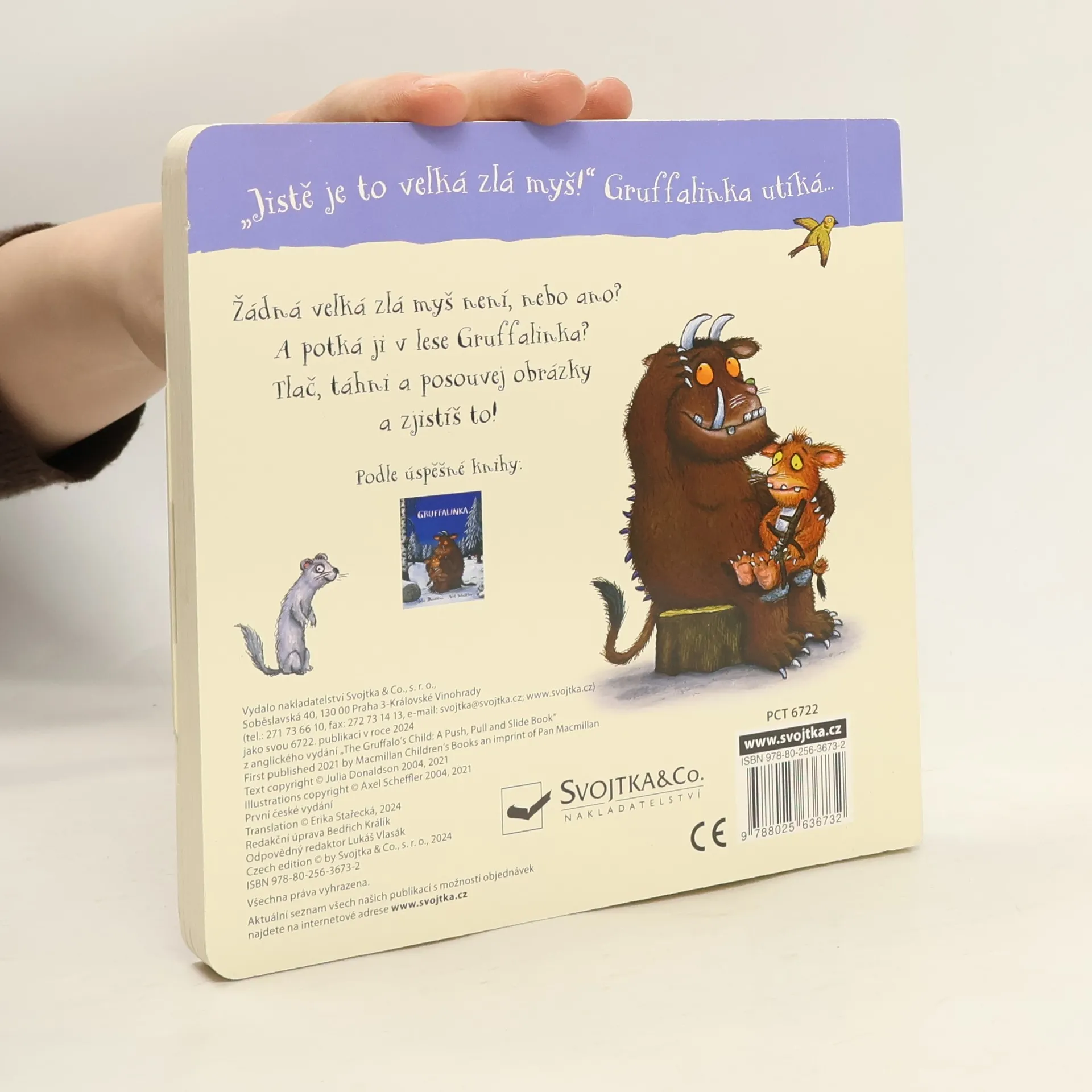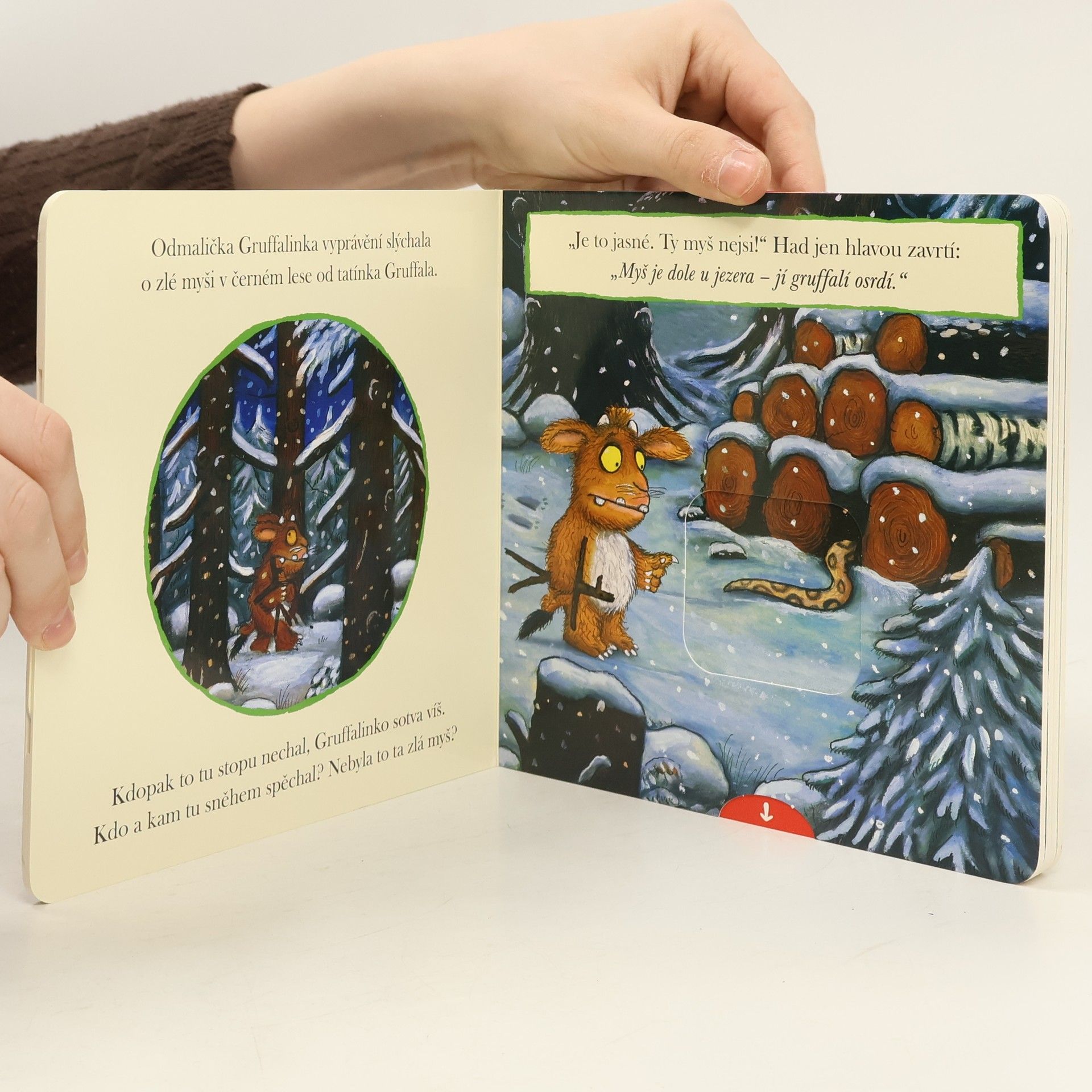 Gruffalinka si vyjde do lesa, ale na procházce nemá klid. Bojí se myšky - strašlivé příšery, před kterou už ji varoval i její tatínek Gruffalo. Sebere Gruffalinka dostatek odvahy na to, aby prošla lesem a vrátila se do jejich gruffalího doupěte? Nenapodobitelné ilustrace Axela Schefflera se geniálně propojují s originálním, vtipným textem Julie Donaldson a společně tvoří dnes již takřka klasický příběh, který si získal srdce dětí po celém světě. Oblíbená Gruffalinka tentokrát vychází ve zkrácené textové podobě na stránkách leporela s pohyblivými prvky. Děti si tak při čtení mohou obrázky samy oživit a nechat se veršovaným příběhem okouzlit.