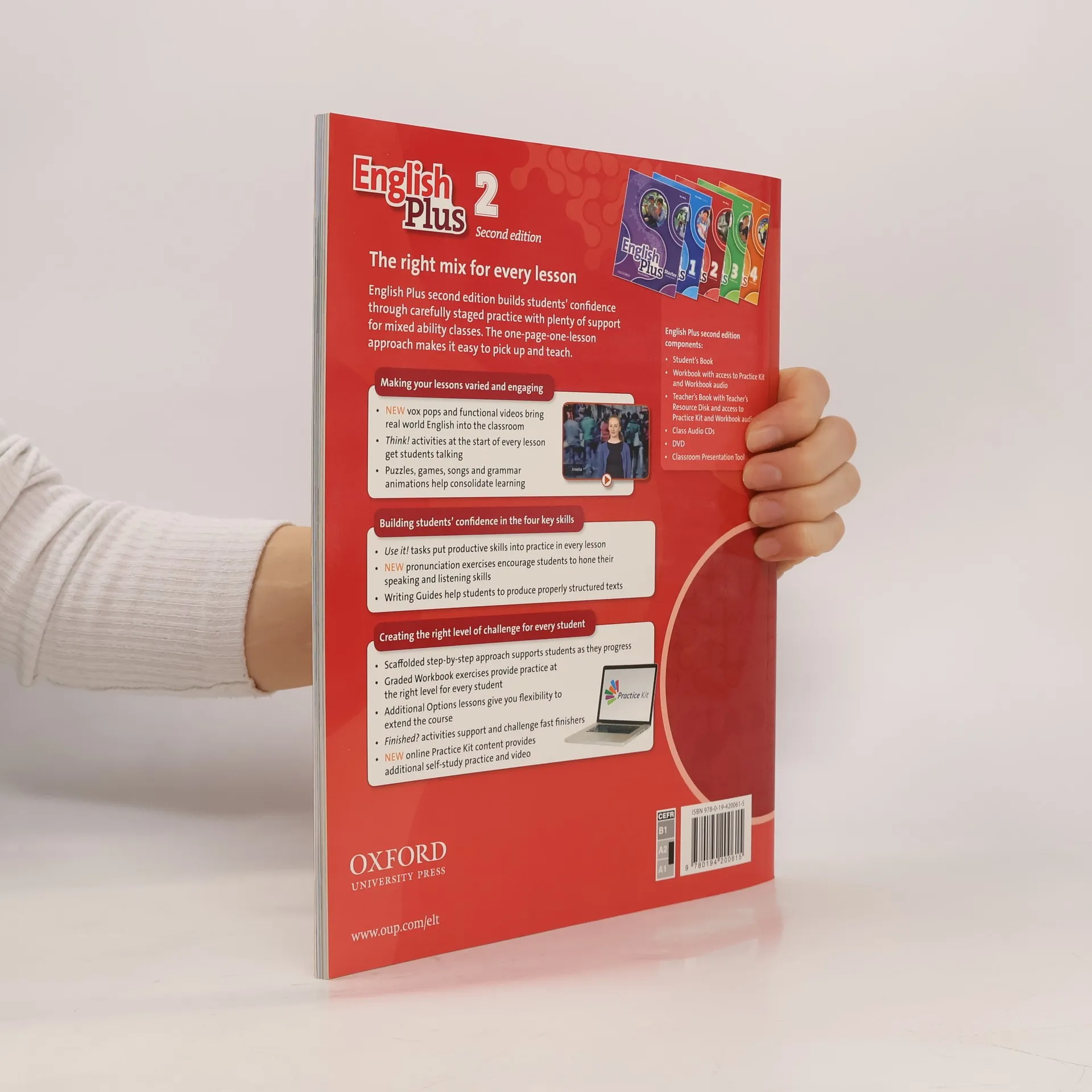 The Student's Book contains a Starter unit to revise basic vocabulary and grammar. Eight teaching units; each unit has two vocabulary sections, two or more grammar presentations, and two listening and reading sections. There is practice of the four skills throughout. Each unit has a whole page devoted to speaking skills and a whole page devoted to writing skills. Eight Review and eight Puzzles and Gamessections which provide revision of all the language studied up to that point in the book. Twenty-eight pages of English Plus Options which include: Eight Extra listening and speaking pages to give further practice in these skills. Six Curriculum extra pages which are linked to topics taught in other subject areas in secondary school. Six Culture pages with topics that invite cultural comparisons. Four Projectand four Song pages which provide a further opportunity for consolidation.