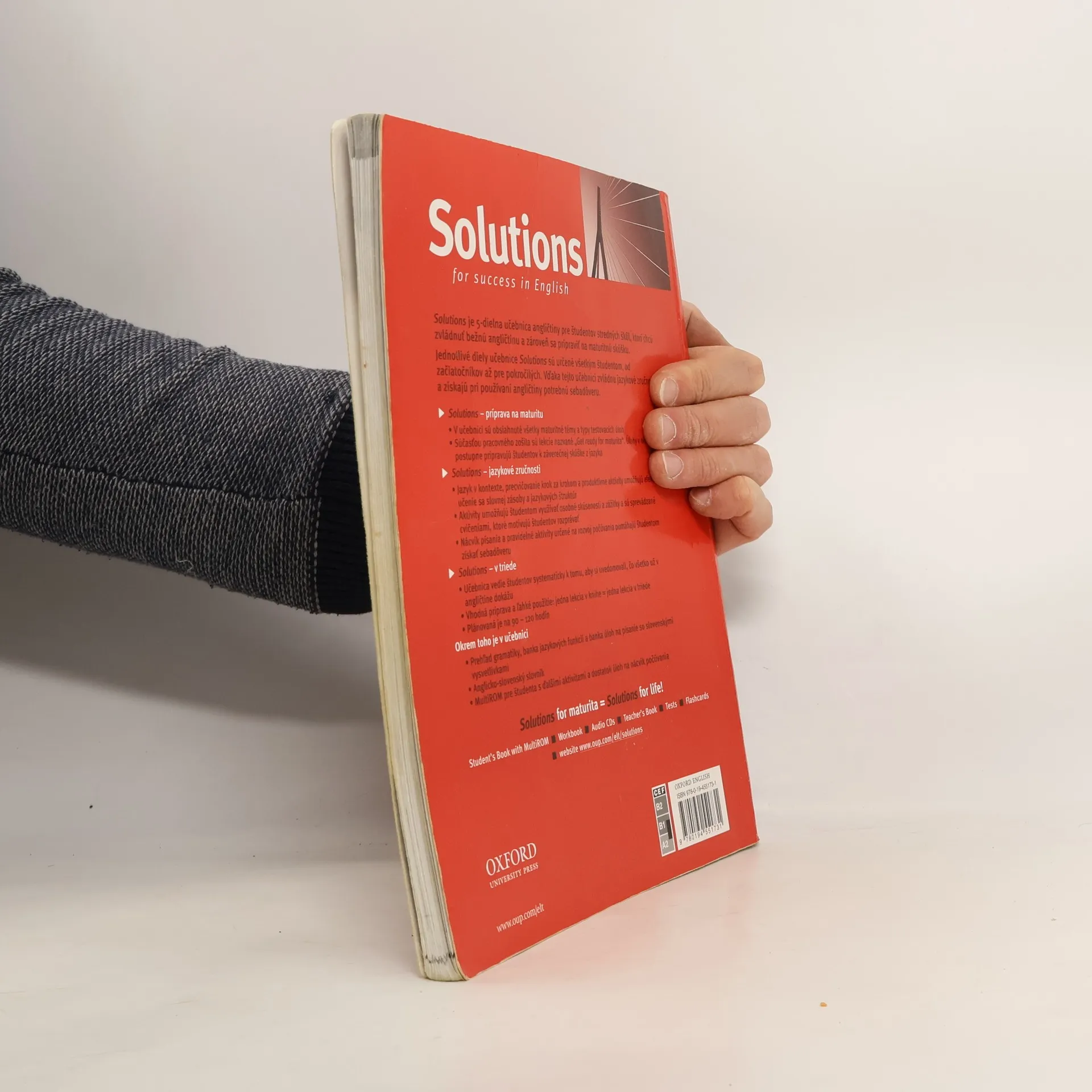 Solutions je 5-dílná učebnice angličtiny pro studenty středních škol, kteří chtějí zvládnout běžnou angličtinu a zároveň se připravit na maturitní zkoušku. V učebnici jsou obsaženy všechny maturitní témata a typy testovacích úloh. Součástí pracovního sešitu jsou lekce nazvané Get ready for maturita.