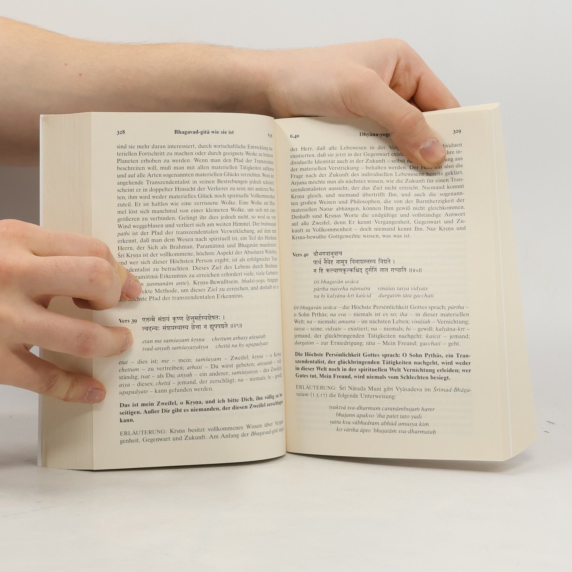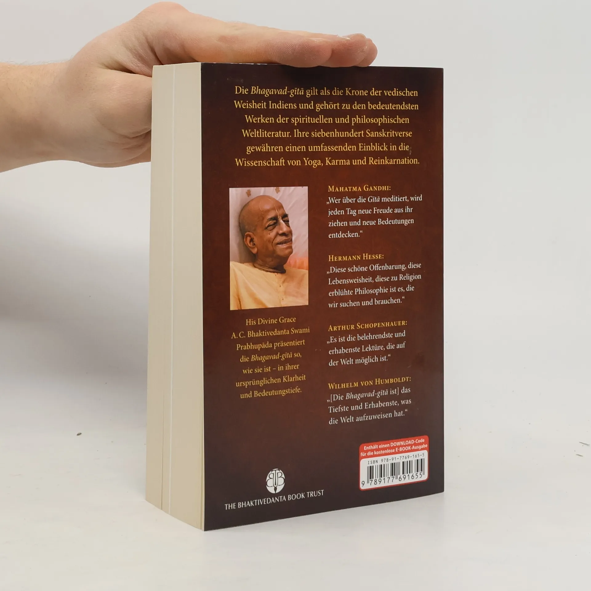 Die Bhagavad-gita (wörtlich: der «Gesang Gottes») ist der bedeutendste und bekannteste Klassiker der indischen Literatur. Sie bildet den Kern der gesamten vedischen Weisheit und enthält eine zeitlose Botschaft von universaler Gültigkeit – eine Botschaft, die alle Religionen und Philosophien der Welt miteinschliesst. Die Bhagavad-gita ist ein Dialog zwischen Krishna, dem Höchsten Herrn, und Seinem vertrauten Freund und Schüler Arjuna. In 700 Versen offenbart Krishna die göttliche Weisheit von Yoga, Karma, Reinkarnation, Meditation, Selbstverwirklichung und Gotteserkenntnis. Krishnas Worte richten sich an alle Menschen, die ihre unwandelbare spirituelle Natur, das letztliche Ziel ihres Daseins und ihre ewige Beziehung zu Gott wiedererkennen möchten. Die vorliegende Bhagavad-gita stellt für den spirituell Suchenden wie auch für den Studenten der Philosophie und Indologie ein Standardwerk dar. Sie beinhaltet: Original-Sanskritverse mit lateinischer Transliteration • vollständige deutsche Übersetzung aller 700 Verse • ausführliche Erläuterungen • umfassendes Glossar mit Erklärungen der wichtigsten Sanskritbegriffe • Anleitung zur Aussprache des Sanskrit • umfangreiches Vers- und Stichwortverzeichnis