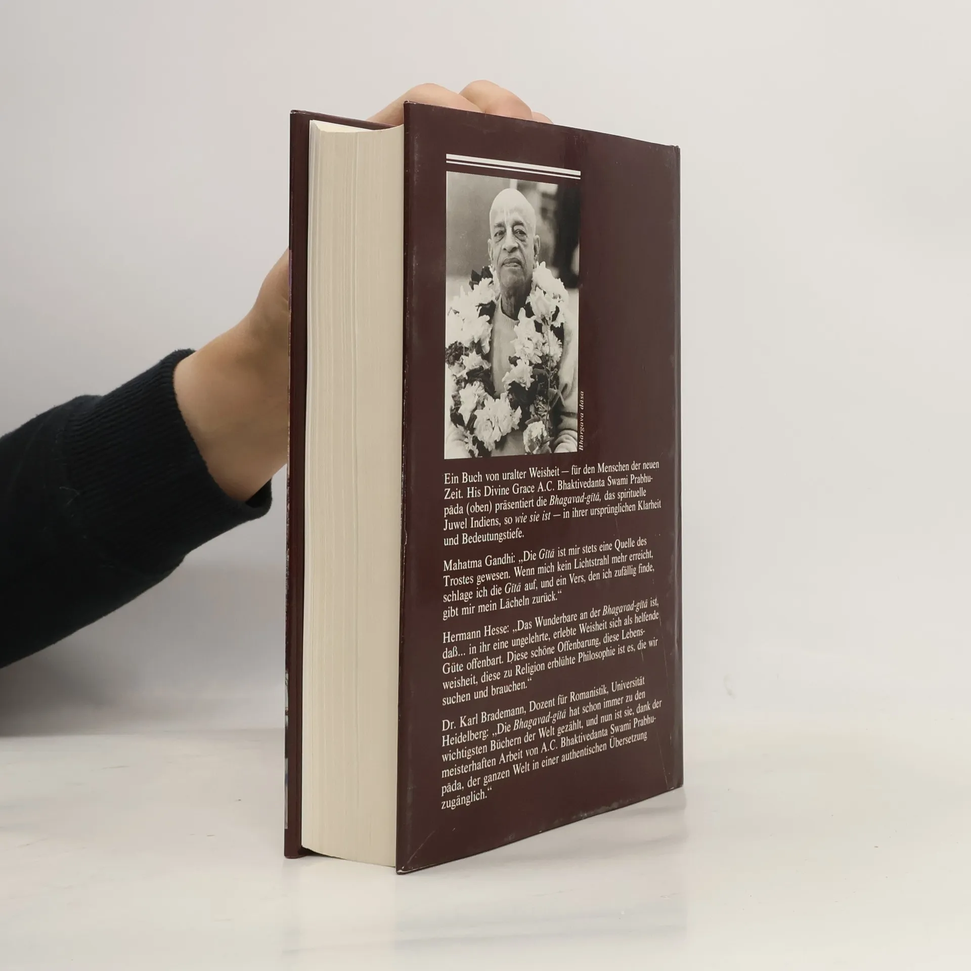Dogmatische Auslegung! Die Auslegung der Bhagavad-Gītā von A. C. Bhaktivedanta Prabhupada half mir zu verstehen, wie Menschen dazu verleitet werden können aus tiefer Überzeugung in den Krieg zu ziehen und andere Menschen zu töten, indem sie blind einer Ideologie einer spezifischen Auslegung von religiösen Texten folgen. Das Problem liegt für mich hierbei nicht an der Bhagavad-Gītā sondern an der Interpretation von A. C. Bhaktivedanta Prabhupada: Transzendentale Rechtfertigung von Gewalt („Sie sterben nicht wirklich – ihre Seelen sind unsterblich“), Pflicht über Mitgefühl („Du musst kämpfen, auch wenn du leidest“), und autoritärem Gottesbild („Krishna als absolute Quelle der Wahrheit – Folge ihm bedingungslos“) …ist die gleiche spirituelle Logik, mit der Gewalt religiös gerechtfertigt werden kann – historisch wie heute. Prabhupādas Kommentare verstärken diesen Eindruck massiv. Er räumt keinen Raum für Widerspruch oder Gewissenskonflikte ein. Im Gegenteil: Zweifel gelten bei ihm als Symptom des māyā-befangenen Geistes. Für mich ist es sehr irritierend dass sich diese Ausgabe auf der Rückseite mit den Lobpreisungen von Mahatma Gandhi, Hermann Hesse, Arthur Schopenhauer und Wilhelm von Humboldt über die Bhagavad-Gītā schmückt, obwohl keiner der aufgeführten Personen je die kommentierte Ausgabe von Prabhupada gelesen hat. Wem es wichtig ist vorgegeben Dogmen zu folgen statt die eigene innere Stimme zum Wachstum zu fördern, ist hier gut bedient.