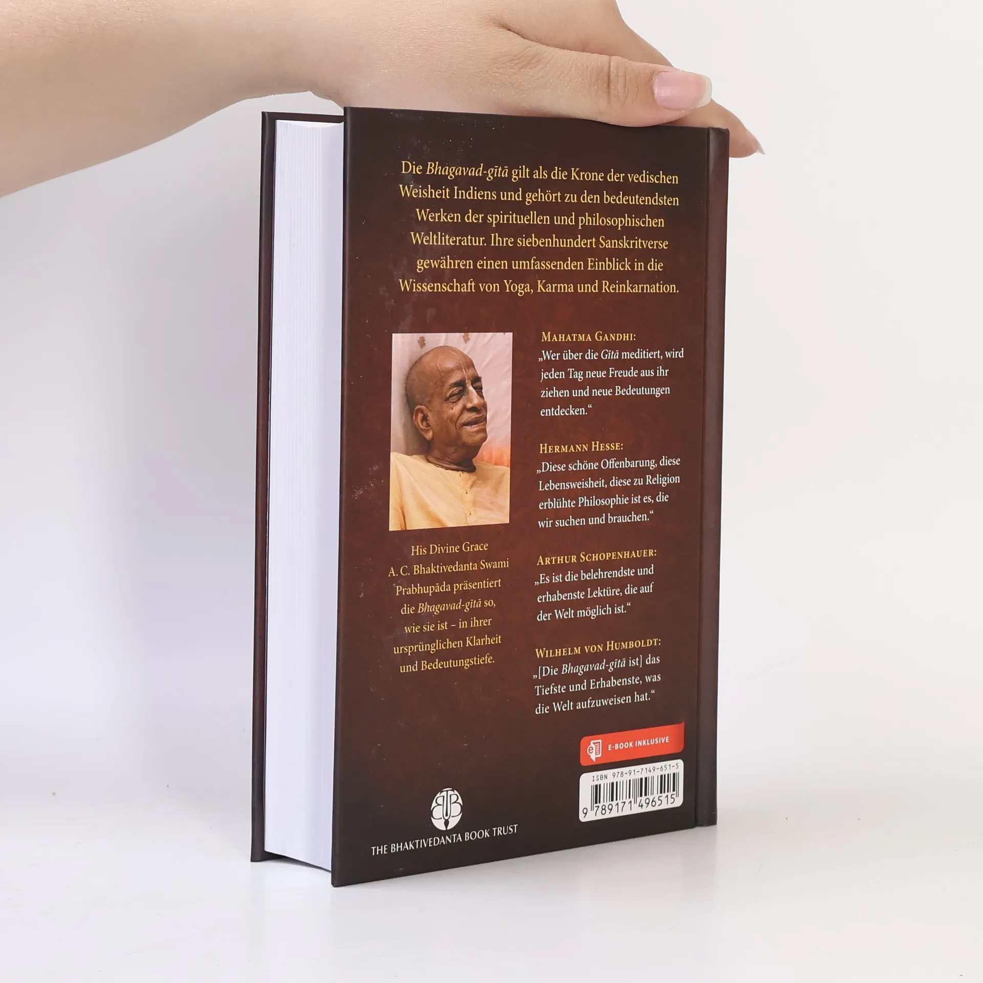 Die Bhagavad-gita (wörtlich: der «Gesang Gottes») ist der bedeutendste und bekannteste Klassiker der indischen Literatur. Sie bildet den Kern der gesamten vedischen Weisheit und enthält eine zeitlose Botschaft von universaler Gültigkeit – eine Botschaft, die alle Religionen und Philosophien der Welt miteinschliesst. Die Bhagavad-gita ist ein Dialog zwischen Krishna, dem Höchsten Herrn, und Seinem vertrauten Freund und Schüler Arjuna. In 700 Versen offenbart Krishna die göttliche Weisheit von Yoga, Karma, Reinkarnation, Meditation, Selbstverwirklichung und Gotteserkenntnis. Krishnas Worte richten sich an alle Menschen, die ihre unwandelbare spirituelle Natur, das letztliche Ziel ihres Daseins und ihre ewige Beziehung zu Gott wiedererkennen möchten. Die vorliegende Bhagavad-gita stellt für den spirituell Suchenden wie auch für den Studenten der Philosophie und Indologie ein Standardwerk dar. Sie beinhaltet: Original-Sanskritverse mit lateinischer Transliteration • vollständige deutsche Übersetzung aller 700 Verse • ausführliche Erläuterungen • umfassendes Glossar mit Erklärungen der wichtigsten Sanskritbegriffe • Anleitung zur Aussprache des Sanskrit • umfangreiches Vers- und Stichwortverzeichnis