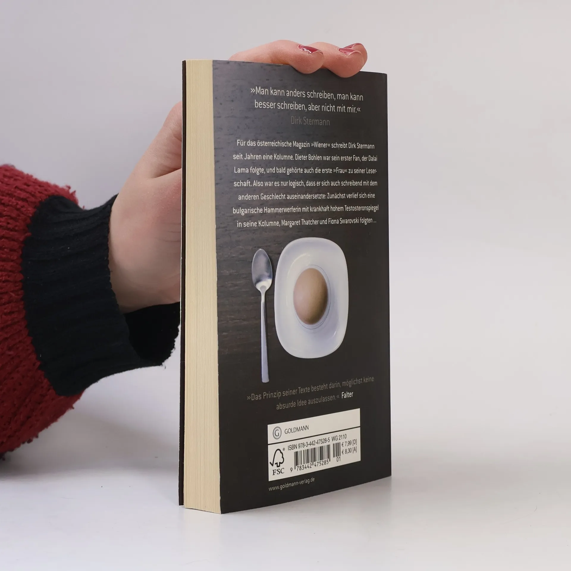 Für das österreichische Männermagazin „Wiener“ schreibt Dirk Stermann seit Jahren die Kolumne auf der letzten Seite jeder Ausgabe. Eine Auswahl dieser witzigen bis skurrilen Texte versammelt der Band „Eier“ – garniert mit 14 echten Eiern und erweitert um ein paar „Bonus-Tracks“. Zum Nachlesen und Neuentdecken: Stermanns Kolumnen, die ihn nach seiner Aussage „wenig Zeit und Aufwand kosten, dem Leser aber interessante und ulkige Minuten garantieren“.