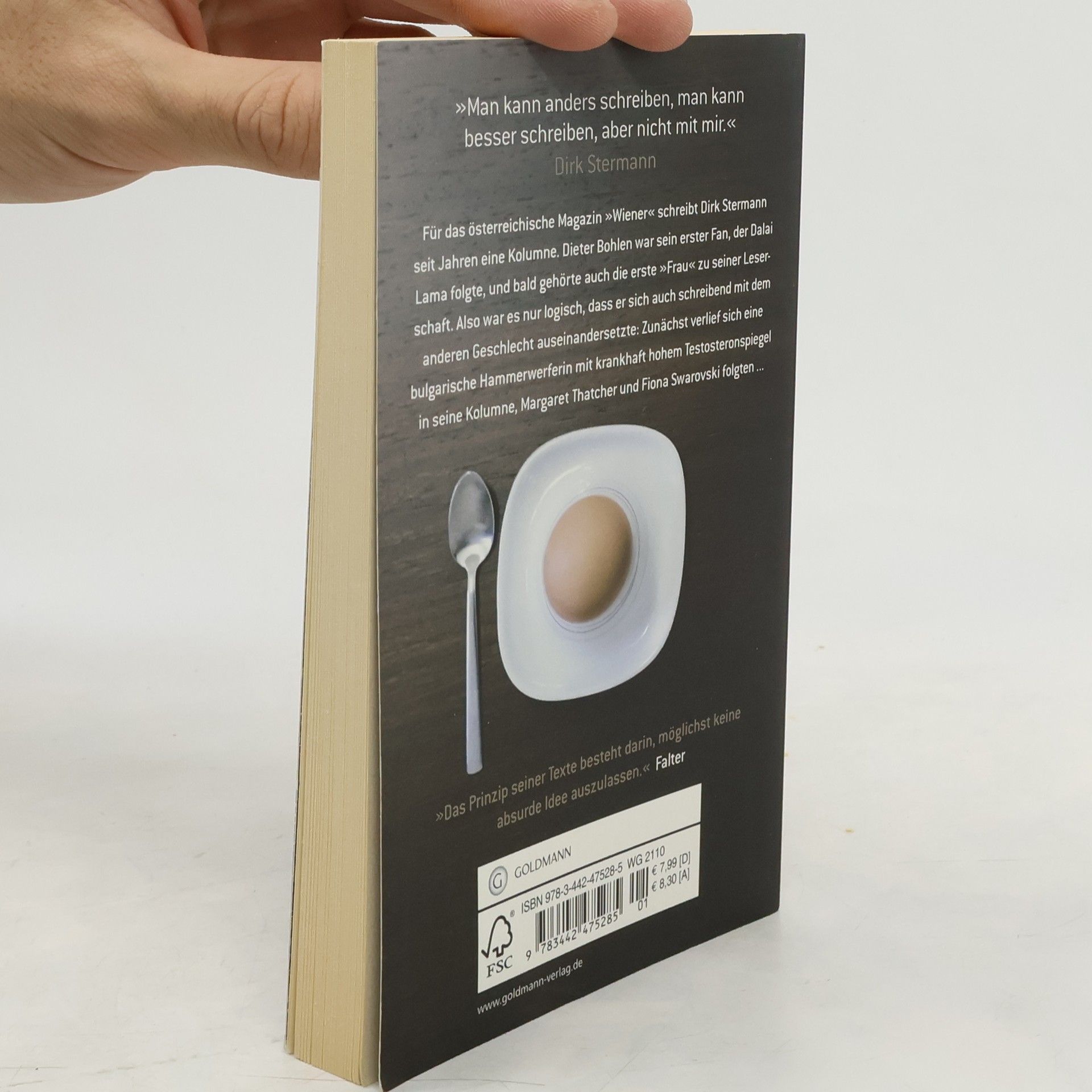 Für das österreichische Männermagazin „Wiener“ schreibt Dirk Stermann seit Jahren die Kolumne auf der letzten Seite jeder Ausgabe. Eine Auswahl dieser witzigen bis skurrilen Texte versammelt der Band „Eier“ – garniert mit 14 echten Eiern und erweitert um ein paar „Bonus-Tracks“. Zum Nachlesen und Neuentdecken: Stermanns Kolumnen, die ihn nach seiner Aussage „wenig Zeit und Aufwand kosten, dem Leser aber interessante und ulkige Minuten garantieren“.