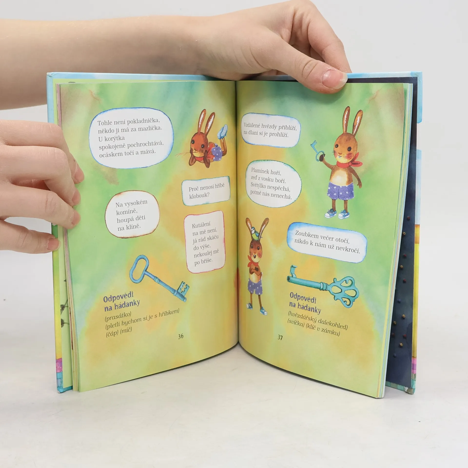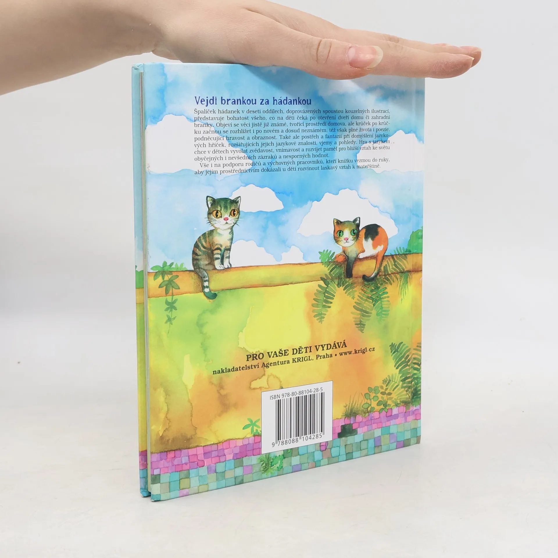 Špalíček hádanek v deseti oddílech, doprovázených spoustou kouzelných ilustrací, představuje bohatost všeho, co na děti čeká po otevření dveří domu či zahradní branky. Objeví se věci jistě již známé, tvořící prostředí domova, ale krůček po krůčku začnou se rozhlížet i po novém a dosud neznámém, též však plné života i poezie, podněcující hravost a obraznost. Také ale postřeh a fantazii při domýšlení jazykových hříček, rozšiřujících jejich jazykové znalosti, vjemy a pohledy. Hra s jazykem chce v dětech vyvolat zvědavost, vnímavost a rozvíjet paměť pro bližší vztah ke světu obyčejných i nevšedních zázraků a nesporných hodnot. Vše i na podporu rodičů a výchovných pracovníků, kteří knížku vezmou do ruky, aby jejím prostřednictvím dokázali u dětí rozvinout laskavý vztah k mateřštině.