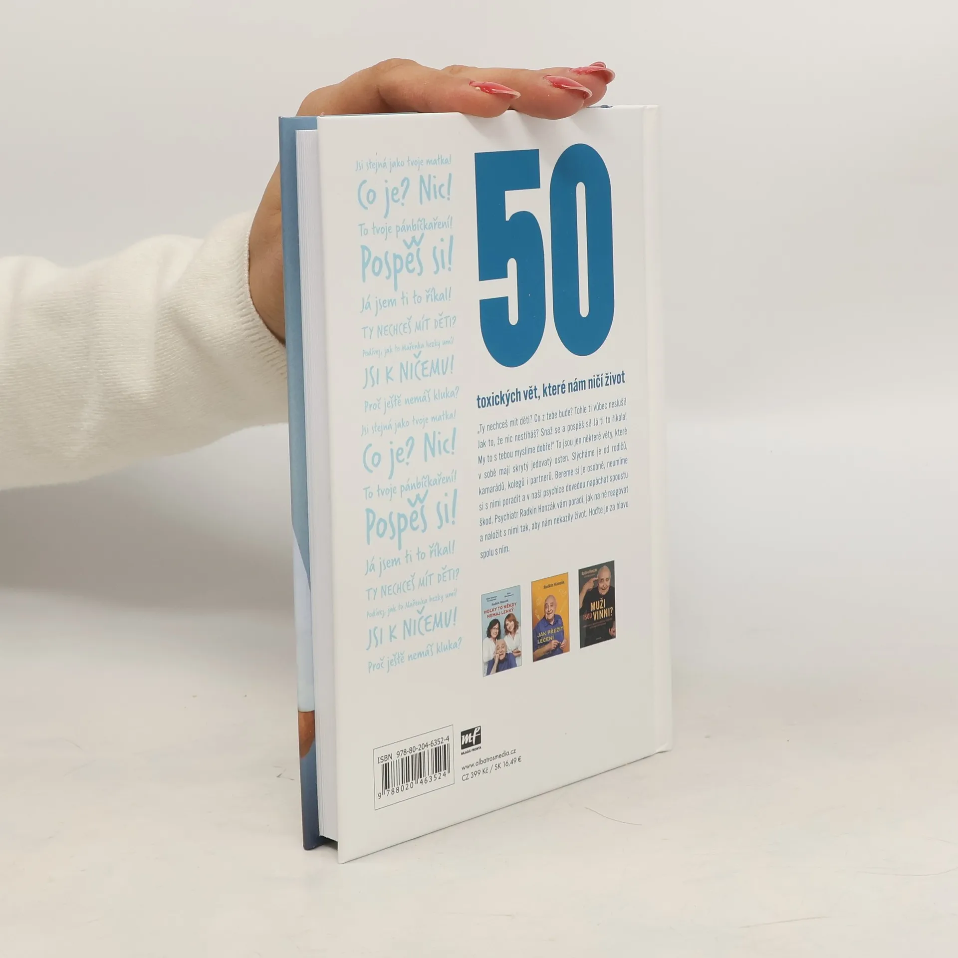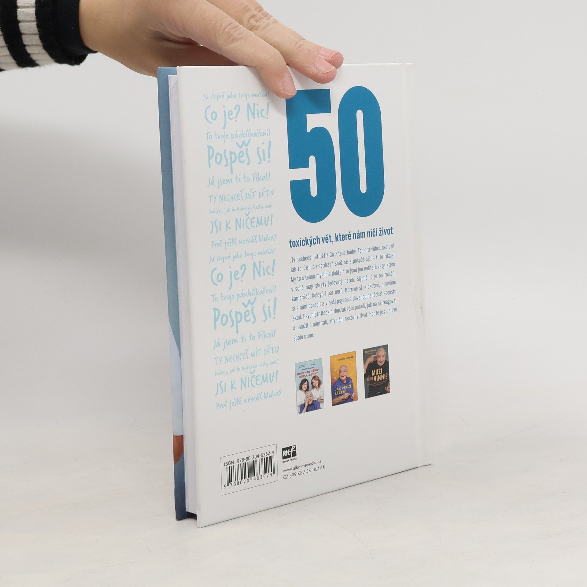 „Ty nechceš mít děti? Co z tebe bude? Tohle ti vůbec nesluší! Jak to, že nic nestíháš? Snaž se a pospěš si! Já ti to říkala! My to s tebou myslíme dobře!“ To jsou jen některé věty, které v sobě mají skrytý jedovatý osten. Slýcháme je od rodičů, kamarádů, kolegů i partnerů. Bereme si je osobně, neumíme si s nimi poradit a v naší psychice dovedou napáchat spoustu škod. Psychiatr Radkin Honzák vám poradí, jak na ně reagovat a naložit s nimi tak, aby vám nekazily život. Hoďte je za hlavu spolu s ním.