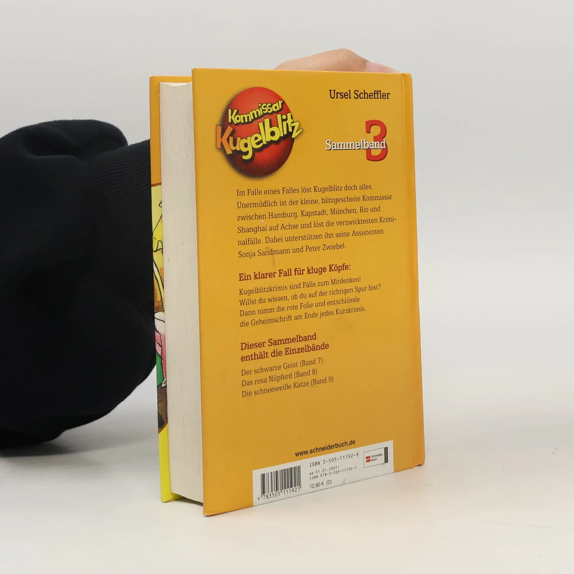 Im Falle eines Falles löst Kugelblitz doch alles. Unermüdlich ist der kleine, blitzgescheite Kommissar zwischen Hamburg, Kapstadt, München, Rom und Taipeh auf Achse und löst die verzwicktesten Kriminalfälle. Ein klarer Fall für kluge Köpfe: Kugelblitzkrimis sind Fälle zum Mitdenken! Willst du wissen, ob du auf der richtigen Spur bist? Dann nimm die rote Folie und entschlüssle die Geheimschrift am Ende jedes Kurzkrimis. Dieser Sammelband enthält die Einzelbände: Der schwarze Geist (Band 7), Das rosa Nilpferd (Band 8), Die schneeweiße Katze (Band 9)