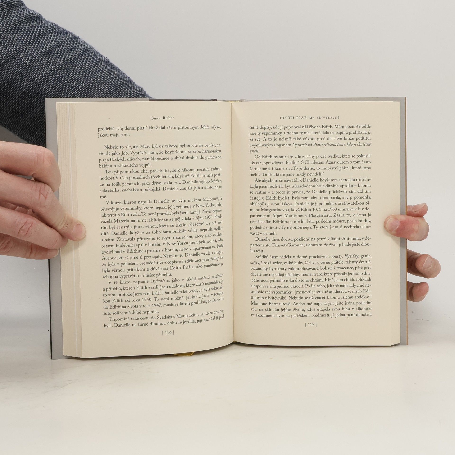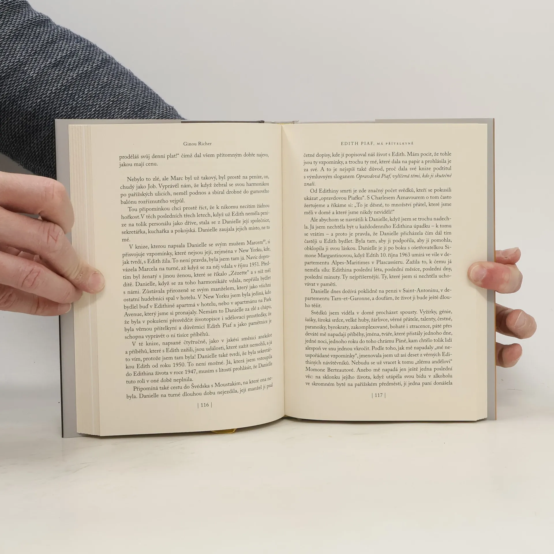Autorka prožila po boku největší hvězdy francouzského šansonu, slavné Edith Piaf, celá léta její největší slávy. Přesto zůstávala diskrétně ve stínu slavné zpěvačky a byla téměř neznámá. Turné po Skandinávii i po Spojených státech, legendární koncerty, bujaré večírky, na kterých se vyskytují známé osobnosti francouzské kultury: Jean Cocteau, Charles Aznavour, Marcel Cerdan, Georges Moustaki, Gilbert Bécaud, Marlene Dietrich a mnozí další. A spousty drsných žertů, které obě kamarádky tropily svým přátelům i známým. Byla také svědkyní celé řady Edithiných lásek. Jaká byla její role po boku Edith Piaf? Nebyla ani sekretářka, ani kadeřnice, ani správkyně, ani společnice, ani děvče pro všechno, i když občas všechno toto vykonávala. Byla to prostě kamarádka.