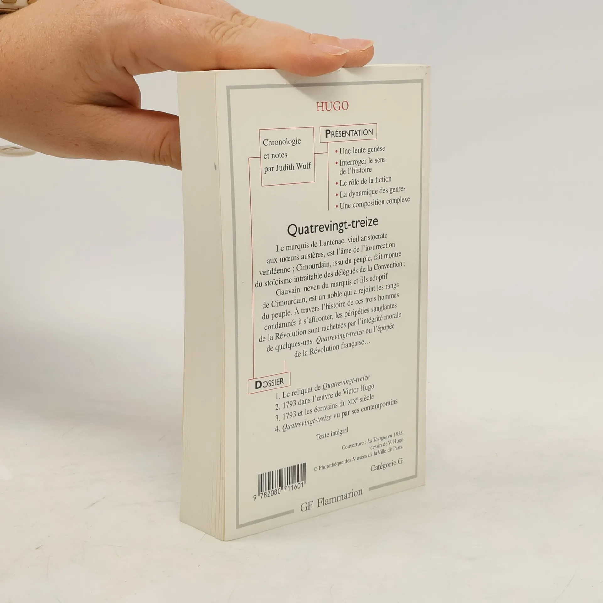 Dans la production littéraire prodigieuse de Victor Hugo, Quatre-vingt-treize est la dernière œuvre de l'exil, une vaste fresque historique publiée en 1874, entre la première édition des Châtiments et la dernière série de La Légende des siècles. C'est donc une œuvre de la maturité, celle d'un homme éprouvé, fort de ses combats, de ses engagements, de sa réputation, au sommet de sa puissance dramatique. Comme son titre l'indique, Quatre-vingt-treize est l'épopée de la Révolution française, racontée à travers trois personnages symboliques : un vieil aristocrate, le marquis de Lantenac, son neveu, Gauvain, un noble rattaché aux humbles, et un homme du peuple, Cimourdain, père adoptif de Gauvain. C'est donc les liens familiaux qui unissent ses personnages avant de les voir plonger dans la tourmente des événements, et lutter les uns contre les autres. Soit par convictions de rang et de classe, soit par raison, soit encore pour un idéal. Dans l'effervescence des actes sanguinaires, seul le peuple, consciemment ou inconsciemment, semble s'imposer en héros. Résonnant comme en écho aux turbulences de la Commune, l'œuvre délivre les préoccupations sociales et humanistes d'Hugo, son idée de la fatalité, dans une imposante lutte entre le bien et le mal. --Céline Darner