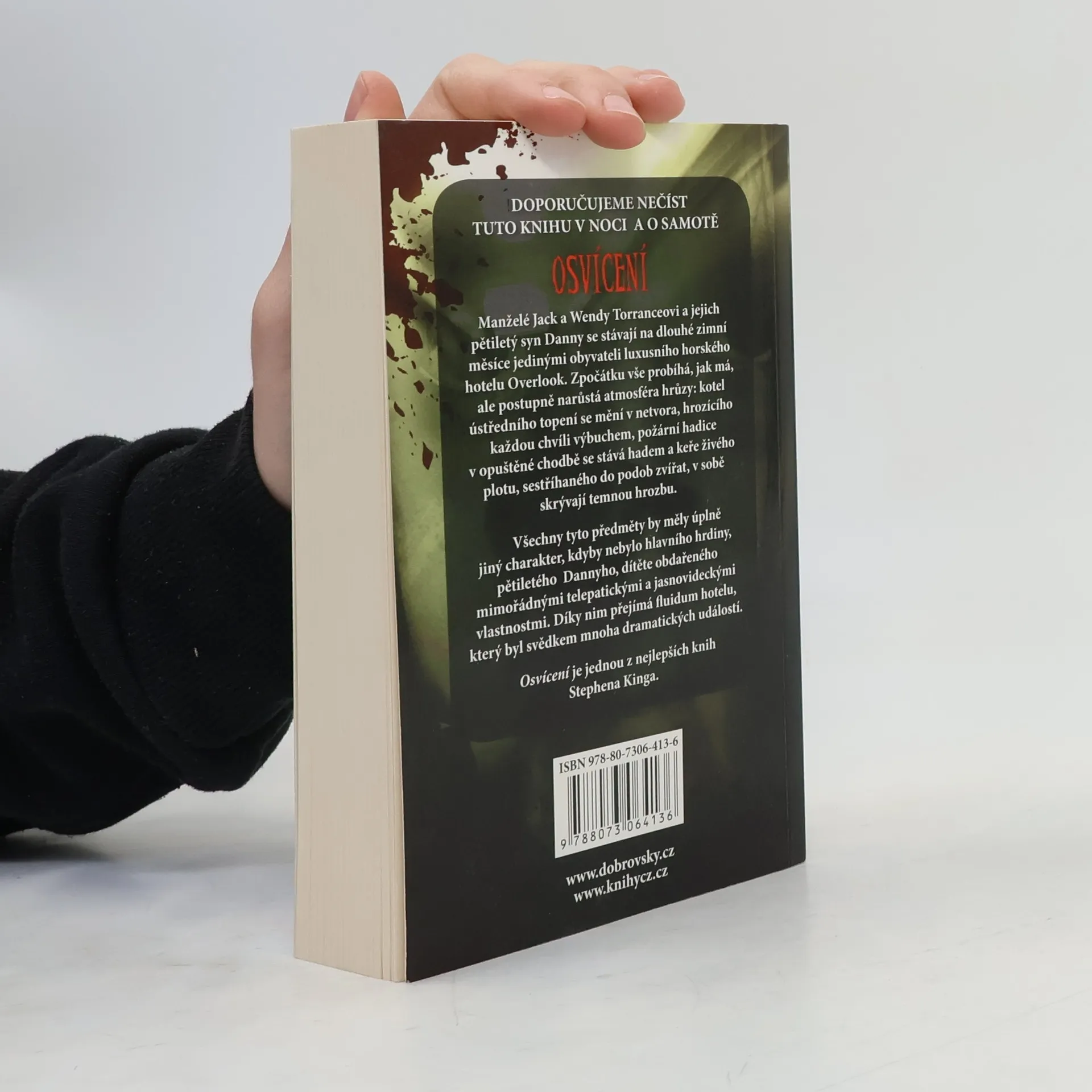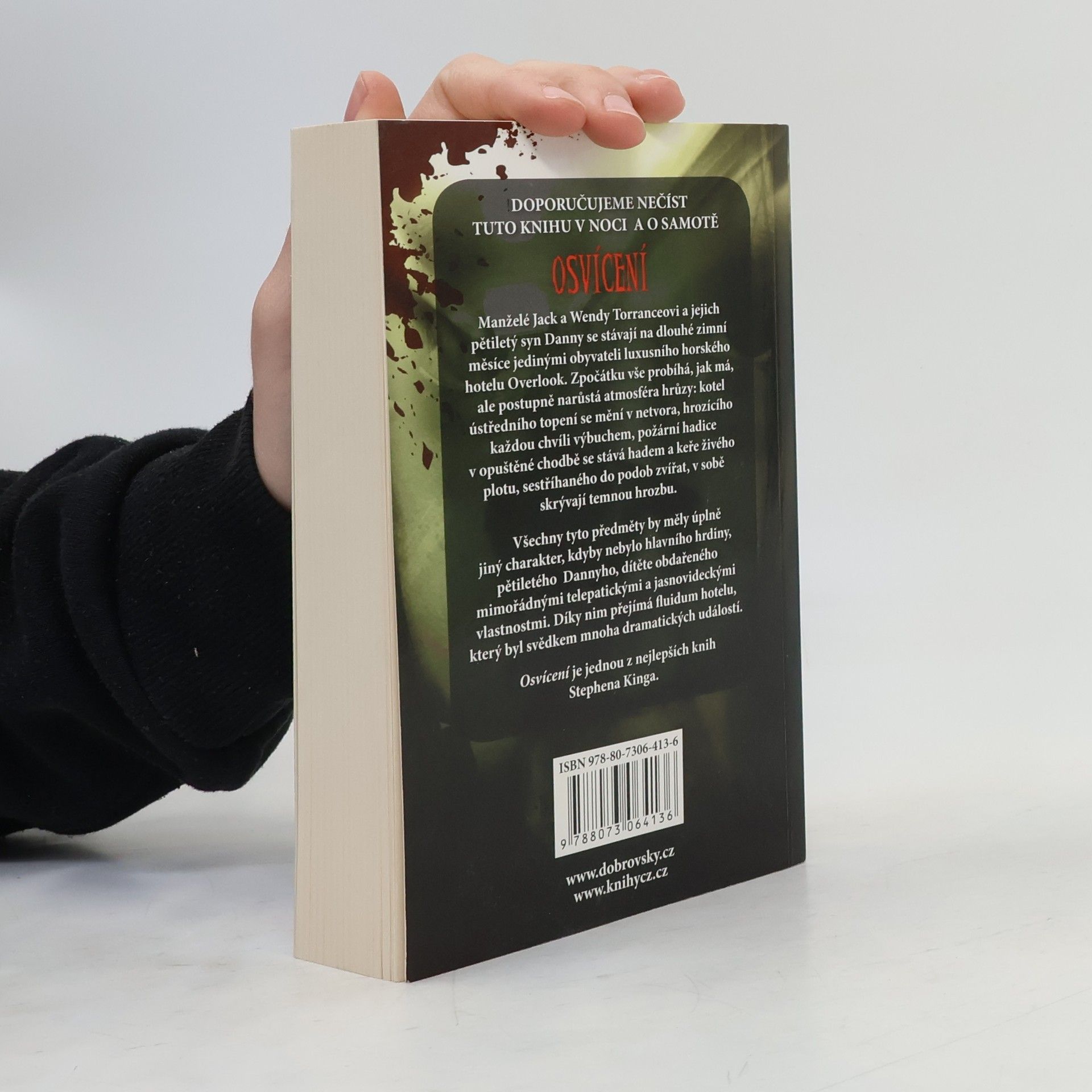 Hotel Overlook je považován za nejkrásněji položené horské letovisko na světě, ale nový zimní správce Jack Torrance, jeho žena Wendy a jejich pětiletý syn Danny v něm spatřovali víc než jeho krásu. Jack viděl v Overlooku příležitost, zoufalý způsob, jak uniknout životní smůle a zoufalství, Wendy zase kýženou samotu, která by mohla být poslední příležitostí k zachování narušené rodiny a Danny? Danny, požehnaný i prokletý náhlým osvícením, darem předvídavosti, viděl věci, které přesahovaly chápání malého kluka. Ve sto deseti prázdných pokojích Overlooku viděl skryté zlo, které číhalo jen na ně...