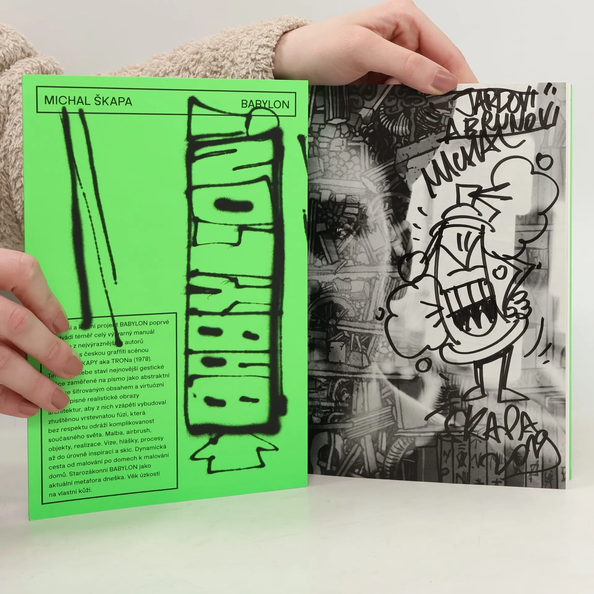 Výstavní a knižní projekt BABYLON poprvé uceleně představuje téměř kompletní výtvarný manuál jednoho z nejvýraznějších autorů spojených s českou graffiti scénou Michala Škapy aka TRONa (1978). Ten vedle sebe staví své nejnovější gestické práce zaměřené na písmo jako abstraktní znak se šifrovaným obsahem a virtuózní drobnopisné realistické obrazy architektur, aby z nich vzápětí vybudoval zhuštěnou vrstevnatou fúzi, která bez respektu odráží komplikovanost současného světa. „Babylon, ať už výstavní, či knižní, je vyvrcholením poslední periody, kdy jsem se více věnoval městu jako civilizačnímu fenoménu, který mě nepřestává fascinovat”. Publikace BABYLON, jenž nyní vychází pod hlavičkou labelu a nakladatelství BiggBoss, “… jednak mapuje mou nejnovější práci, jednak v druhé části prezentuje i grafický experiment, který je pohledem do vlastní ateliérové kuchyně”, podotýká Michal Škapa. Malba, airbrush, objekty, realizace, experimenty i vize, hlášky a tvůrčí procesy až do úrovně inspirací a skic. Dynamická cesta od malování po stavbách k malování staveb. Starozákonní Babylon jako aktuální metafora dneška. Věk úzkosti a Memento mori na vlastní kůži. Autory textů v publikaci jsou kurátor výstavy Babylon, Radek Wohlmuth a Vladimir 518, graficky vychytal Jan Matoušek.